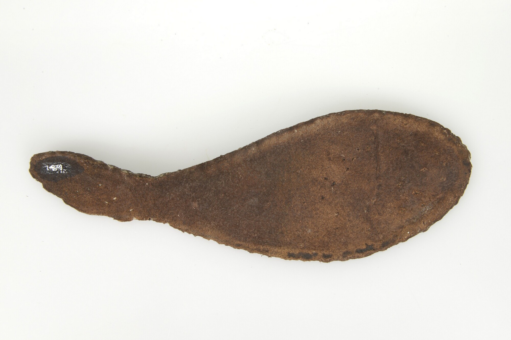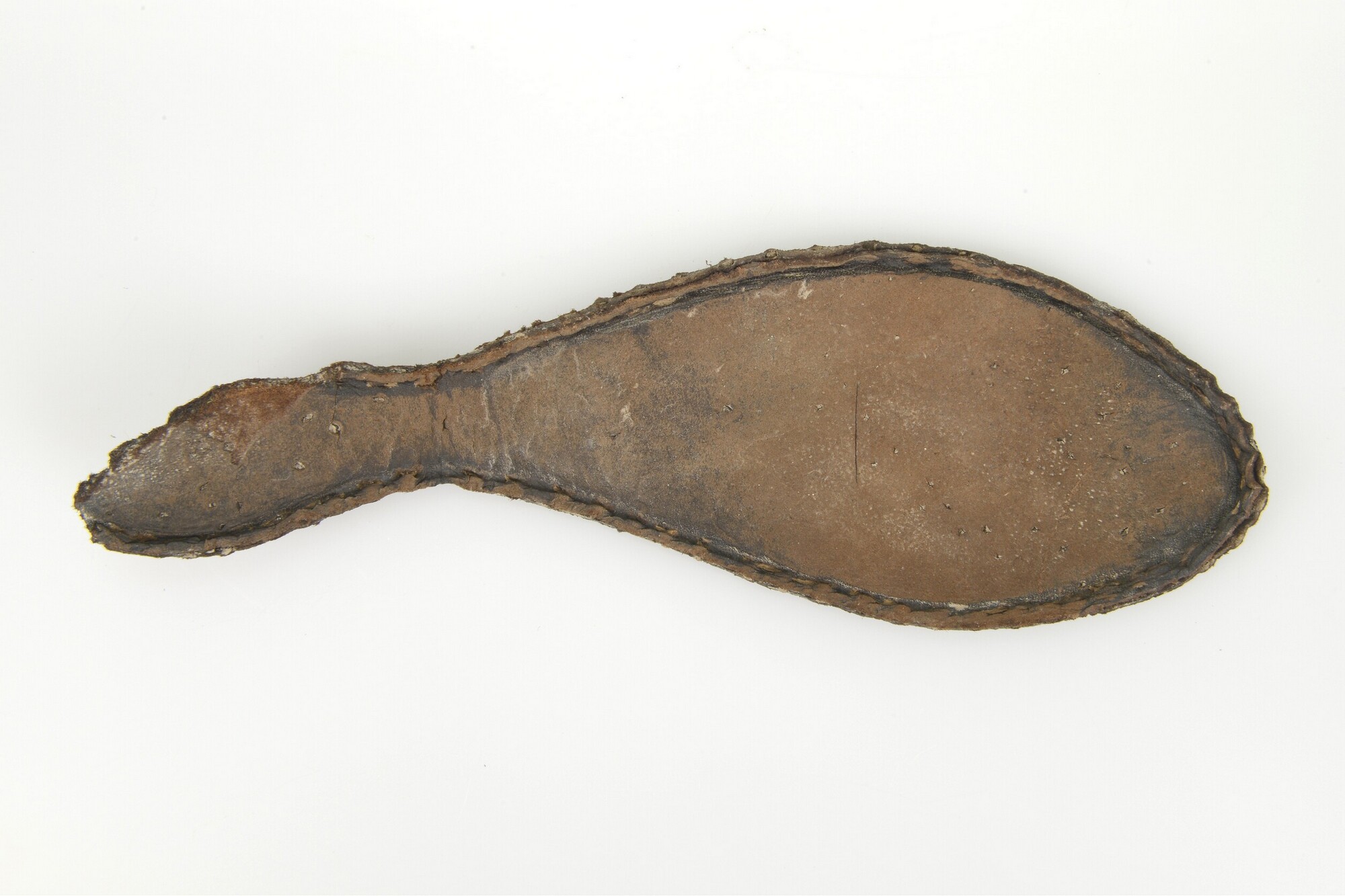 Schoenzool; waarschijnlijk binnenzool; resten van plantaardig stiksel in de stikselnaden en houten pennetjes in de rand?