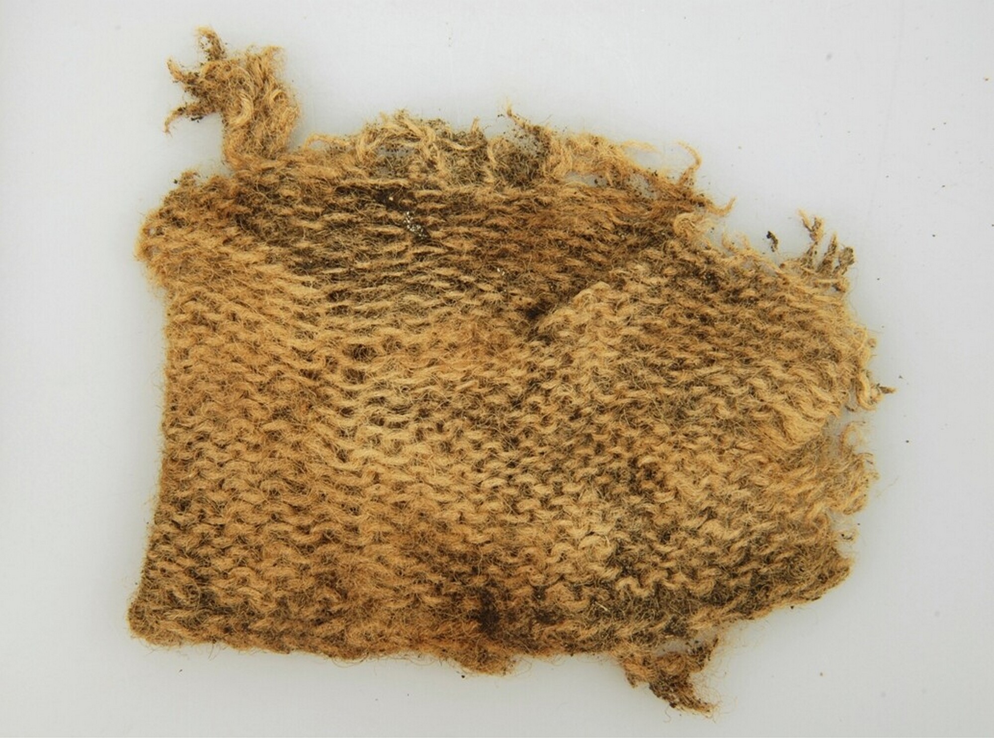 Breiwerk; tricot-breiwerk, waarschijnlijk een fragment van een muts; graf tegen grafkelder, put8 (Velsen, Halbertsma), 6 mei 1967