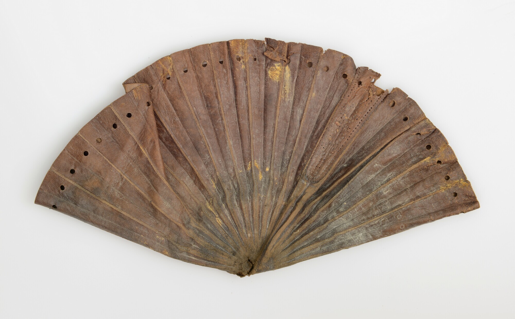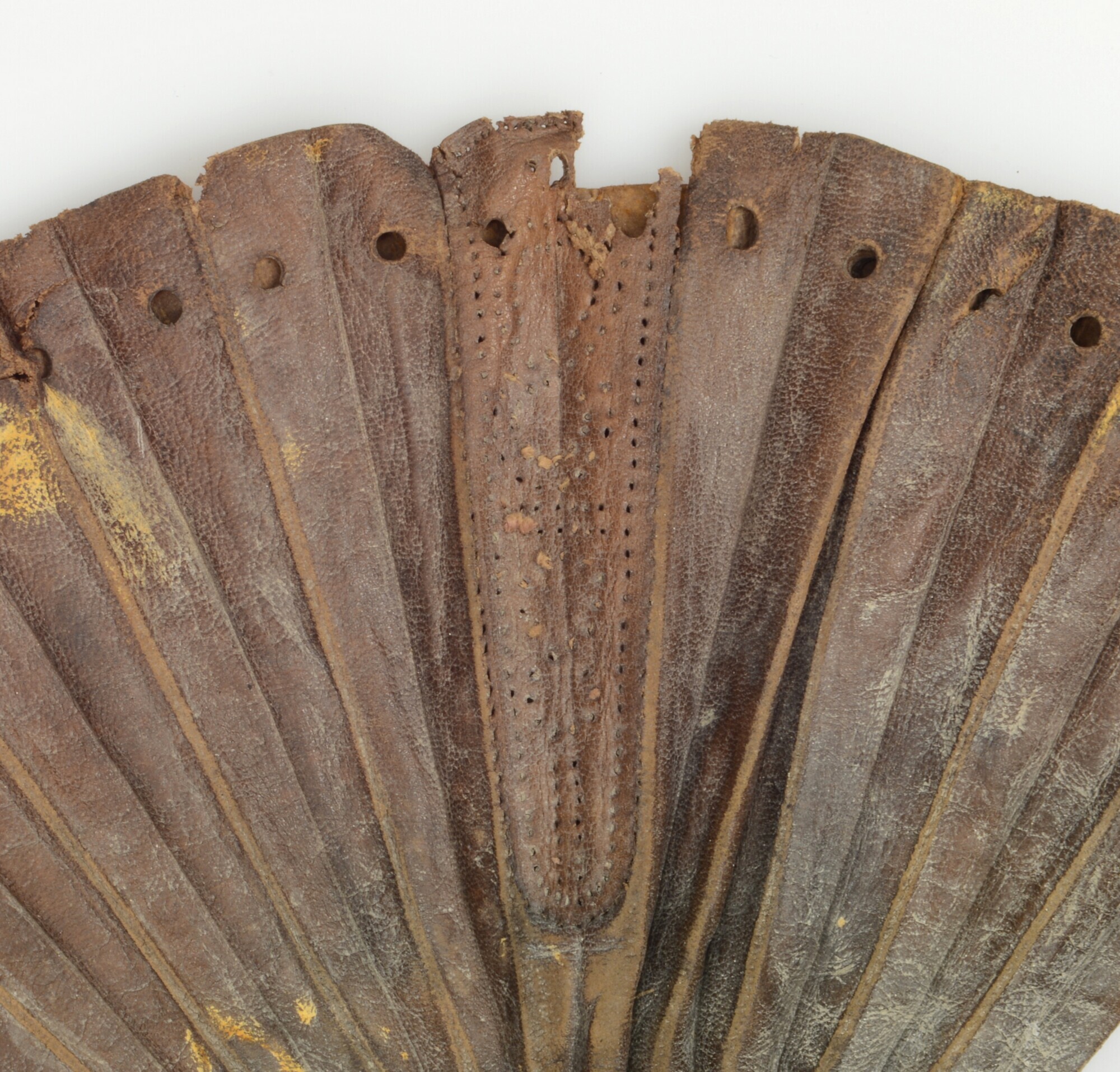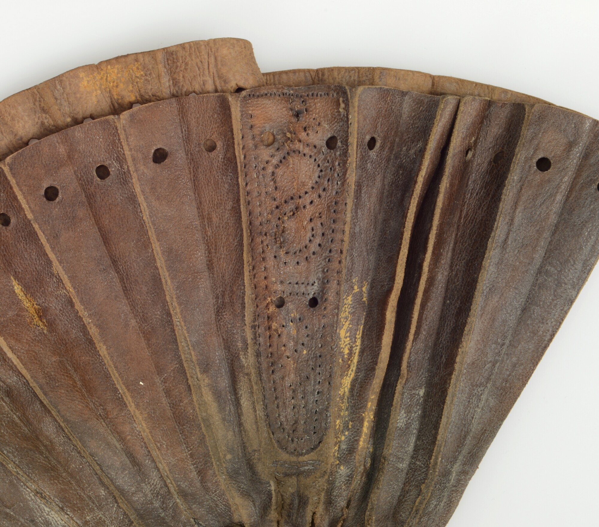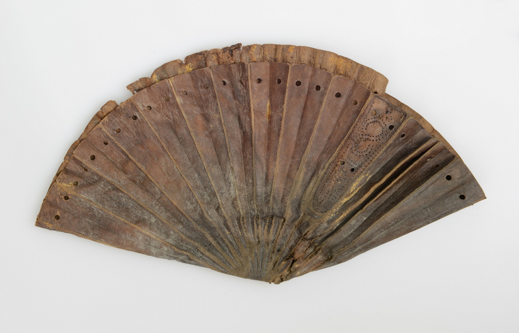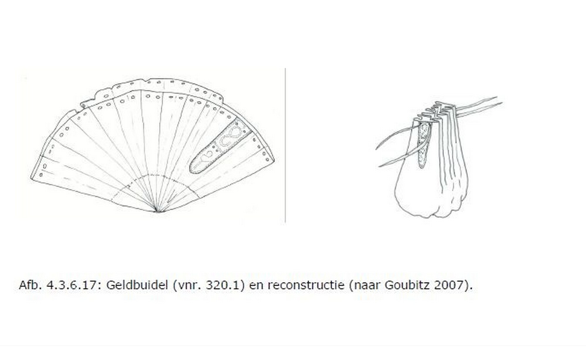 Geldbuidel; ronde buidel vervaardigd uit 1 lap leer; gevouwen; 64 gaatjes langs de rand, plissé vouwen; zijkanten versierd met ingeperste verticale lijnen, stippellijnen en een geometrisch motief; naaigaatjes aan de binnenkant