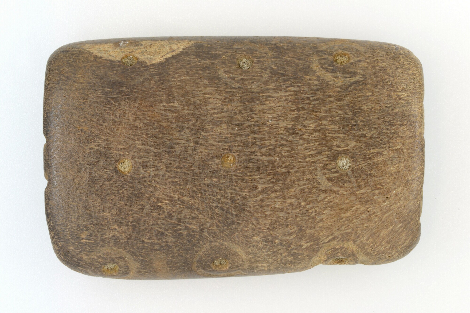 Speelsteen; rechthoekig met een versierde bovenzijde en zijkanten, de bovenzijde is versierd met punt- en cirkelversiering en twee kopse kanten met punt- en cirkelversiering; vondstdatum 8-10