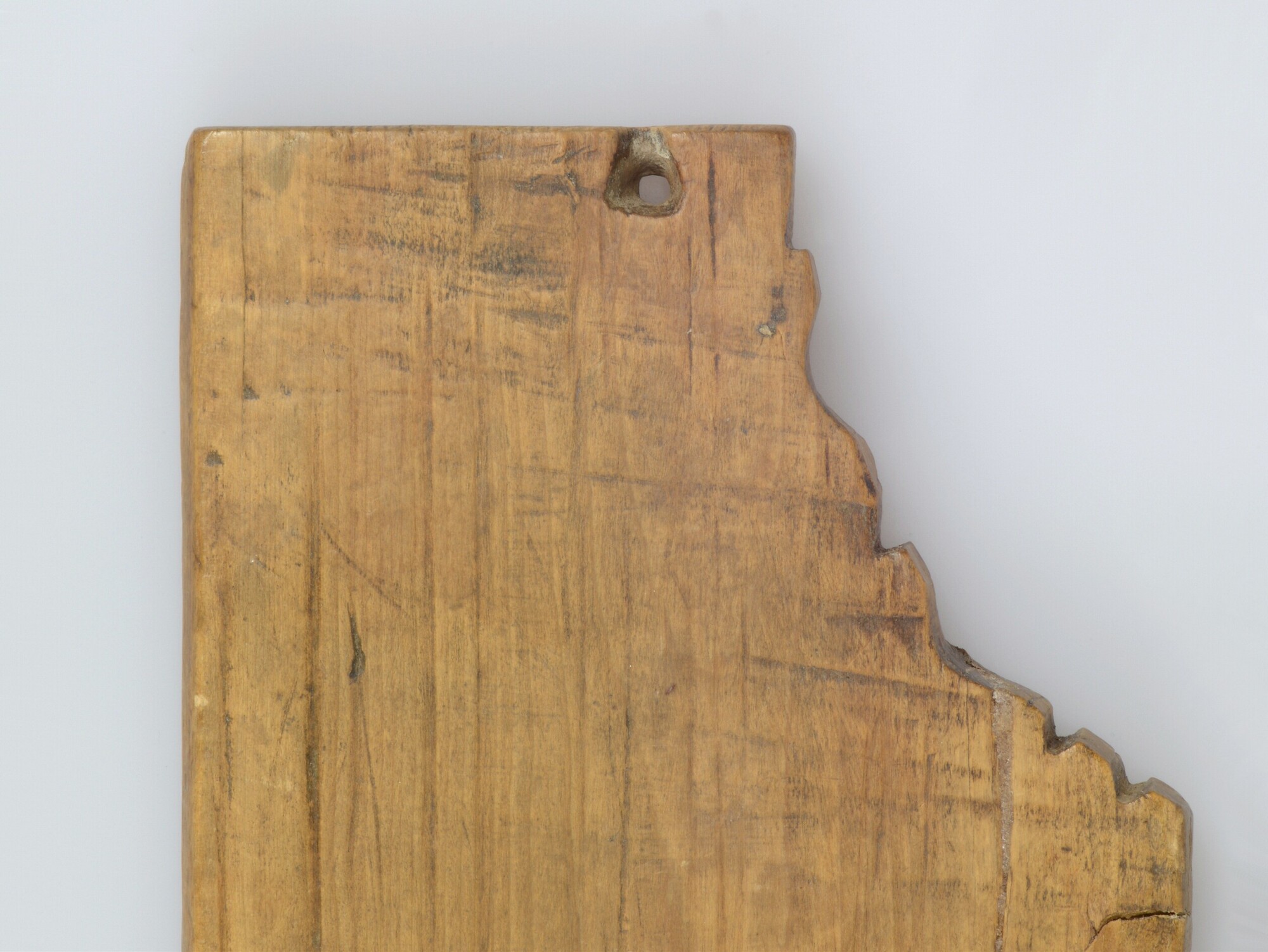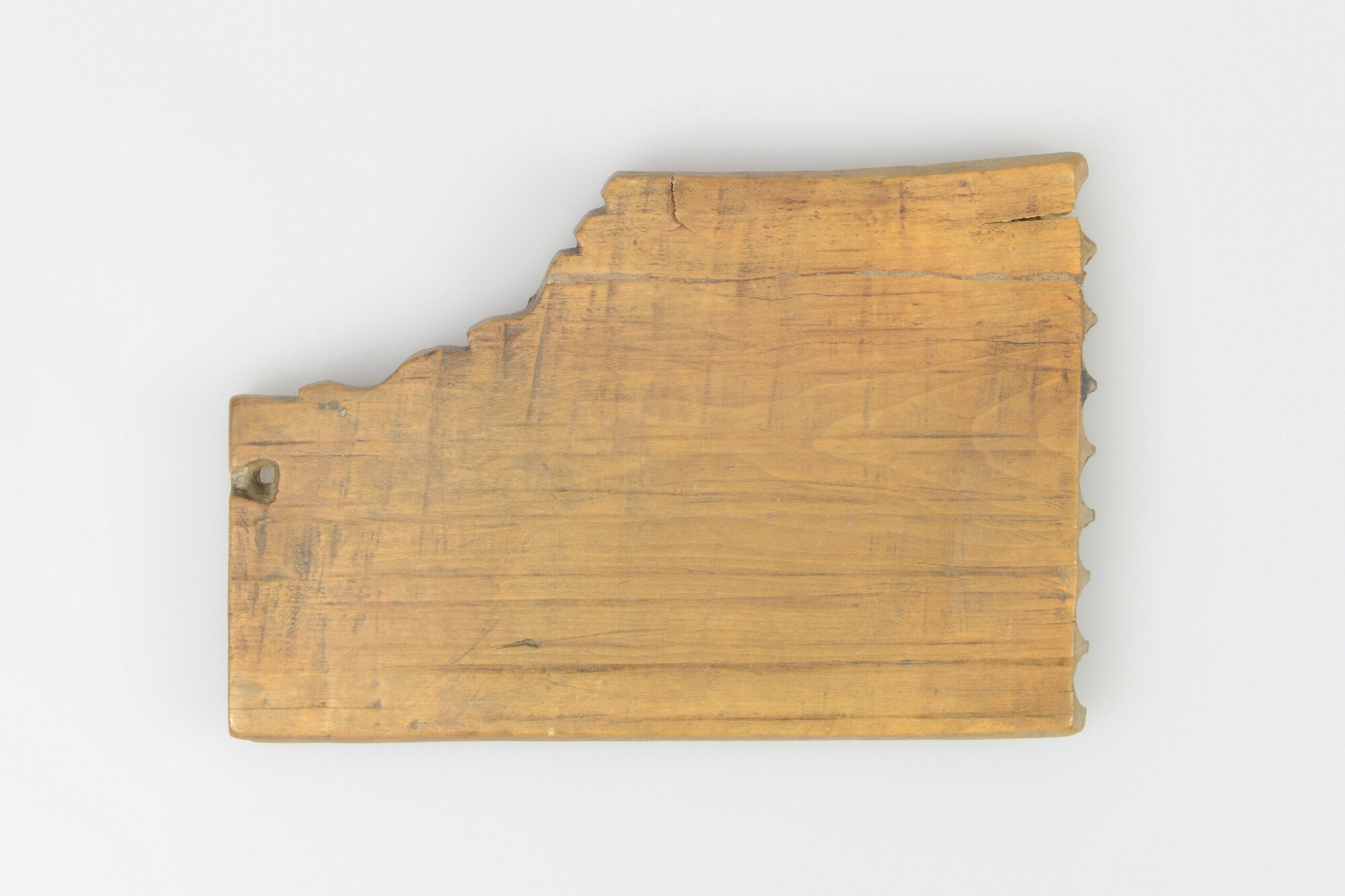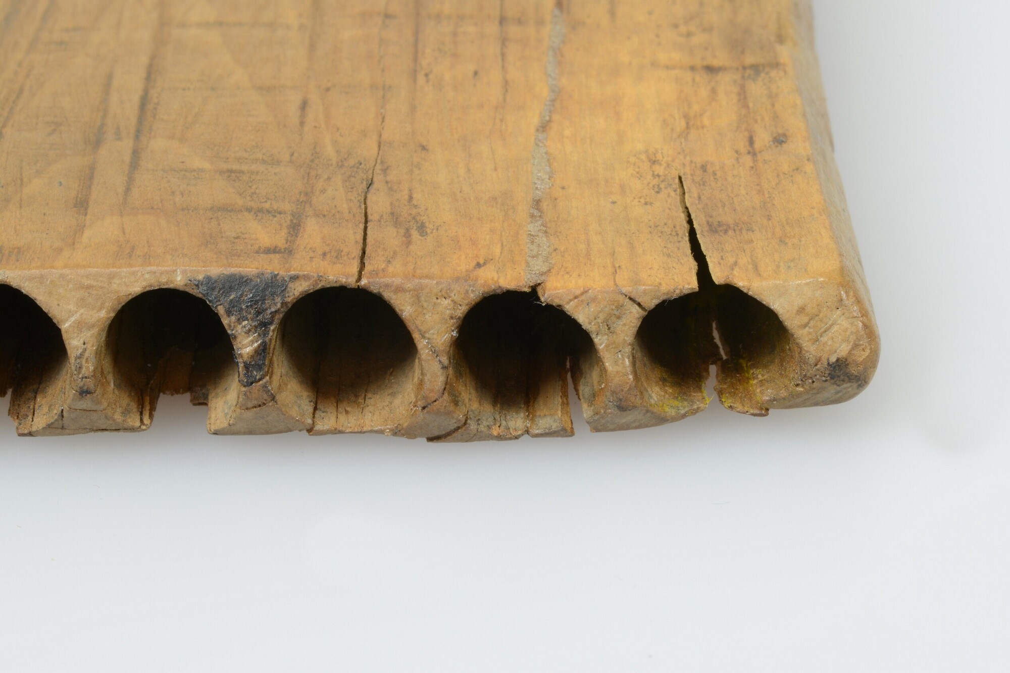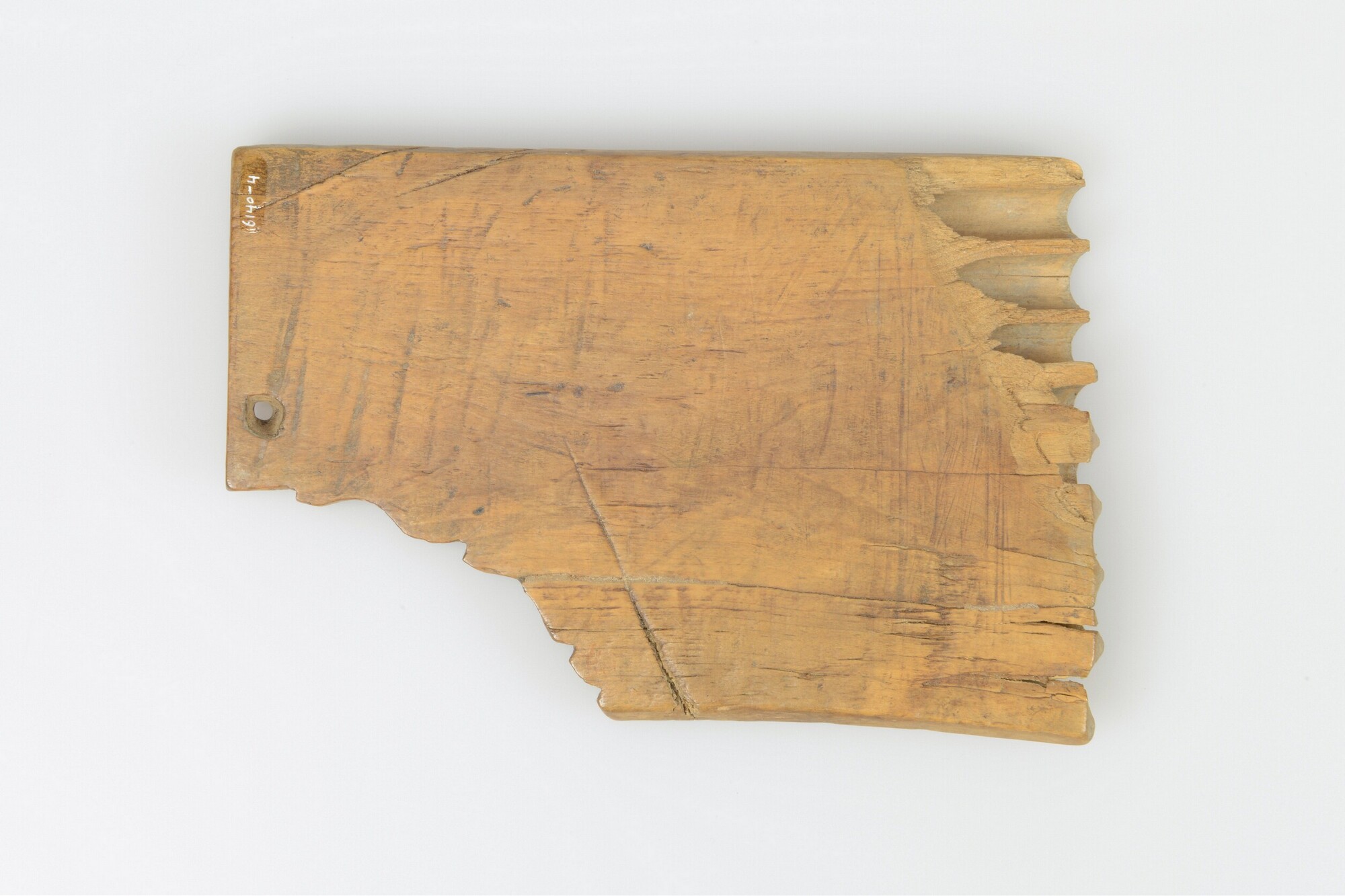 Panfluit; uit één plank, negen ronde gaten, in de rechter onderzijde een opening voor een touw of draagkoord; herkomst: Middellandse Zeegebied.