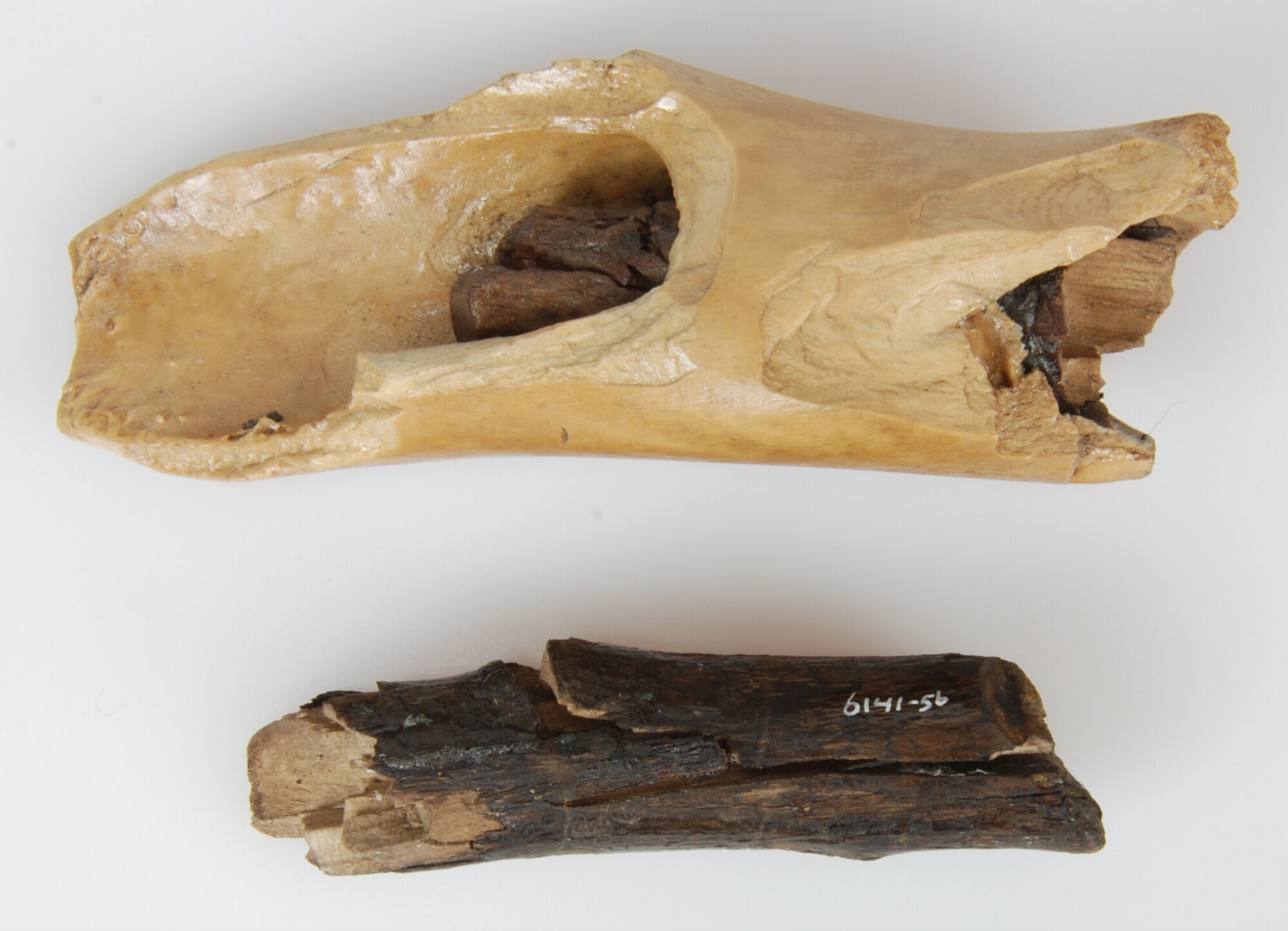 Prikstok/steel; niet compleet bewaard gebleven houten steel van een tak met schors, met één uiteinde gestoken in een hol stuk runderbot met scherpe punt. Gedacht werd aan een prikstok, zoals in het verleden gebruikt werd bij het schaatsen.