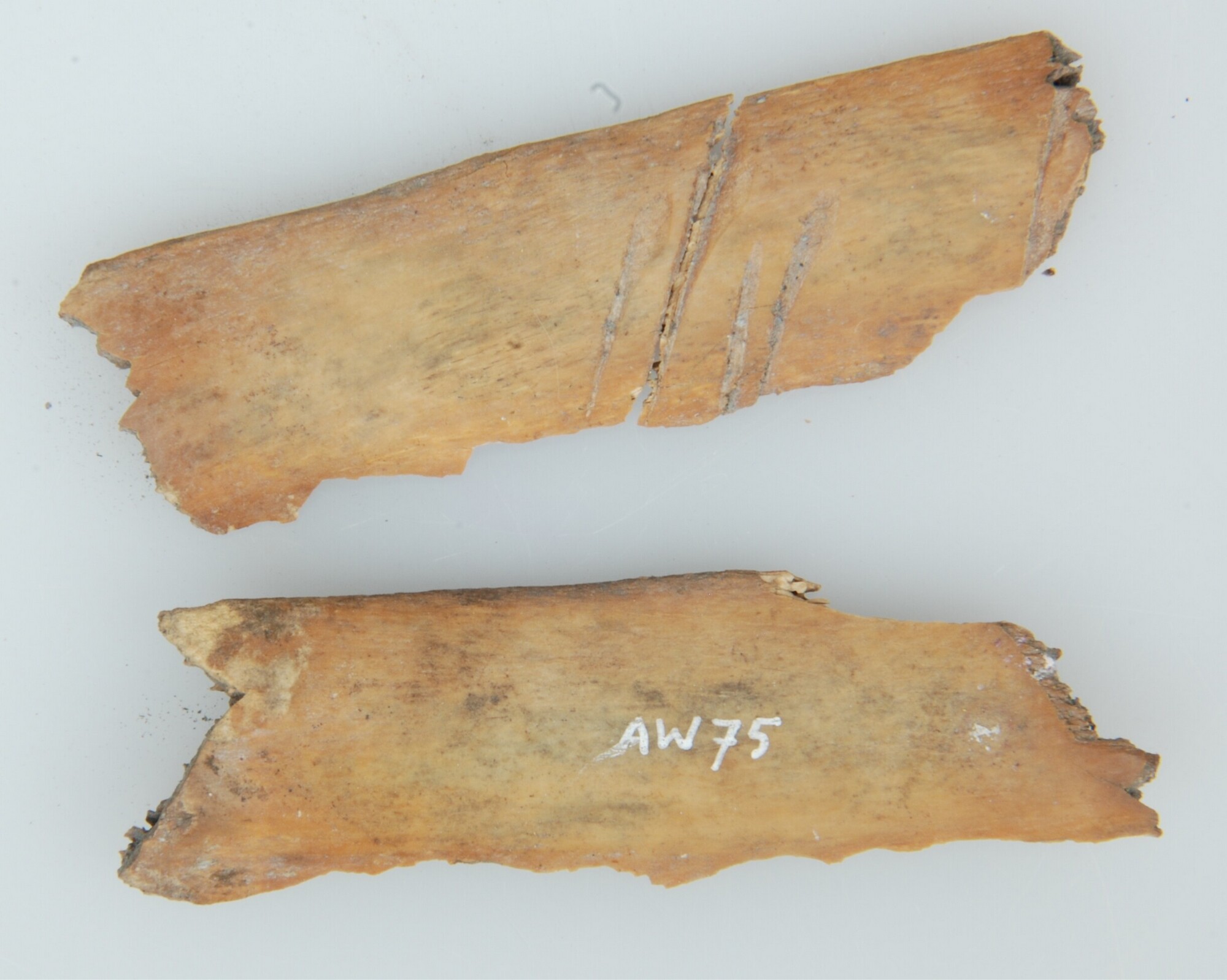 Afval; ribfragment met snij- en haksporen; dierlijk bot; vak: AW75 vondstdatum: 29-9-1972