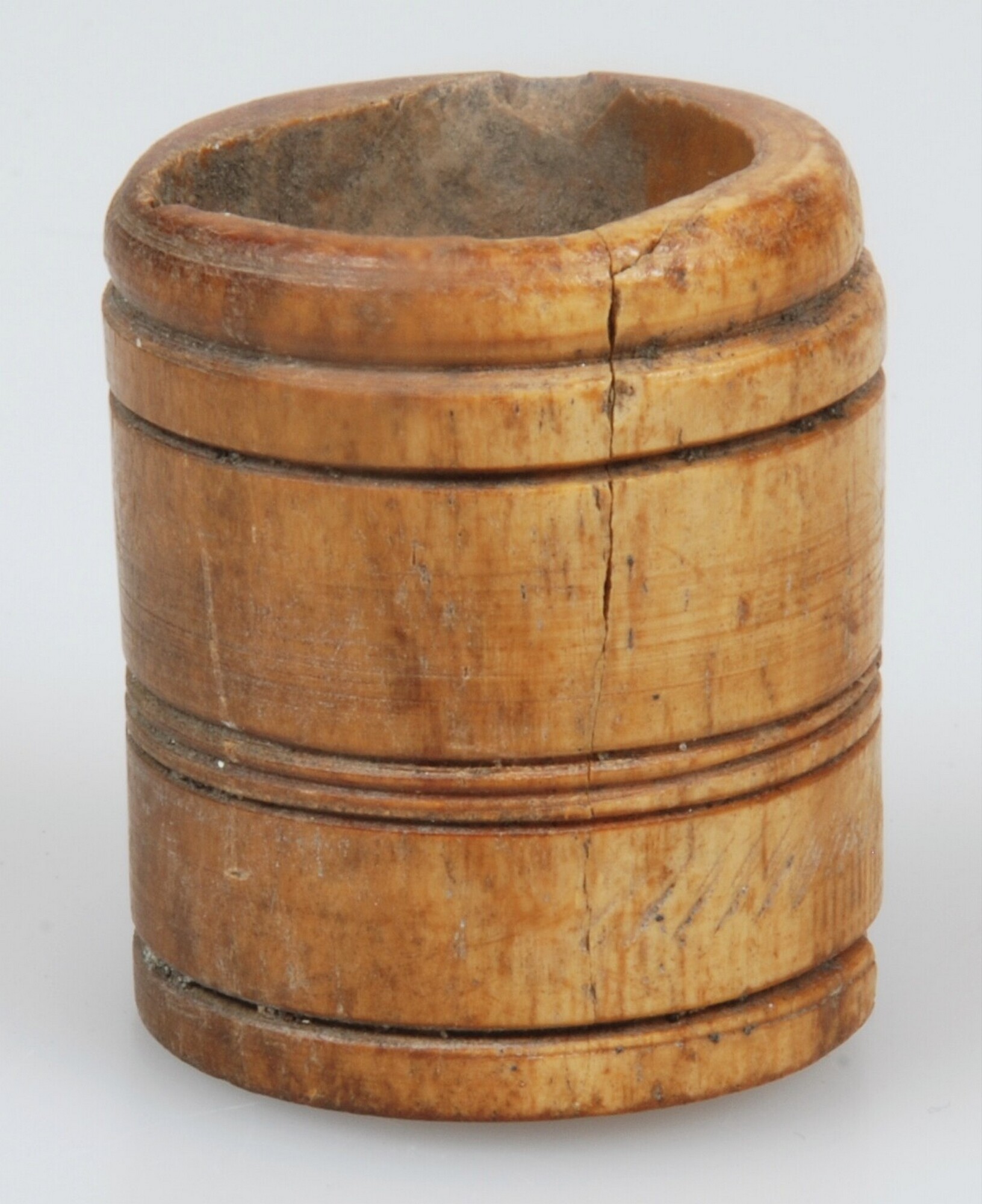 Koker; hol van binnen en heeft aan een kant een grotere opening dan aan de andere zijde; mogelijk is het de kop van een kwast; uitgesneden lijnen aan de buitenzijde