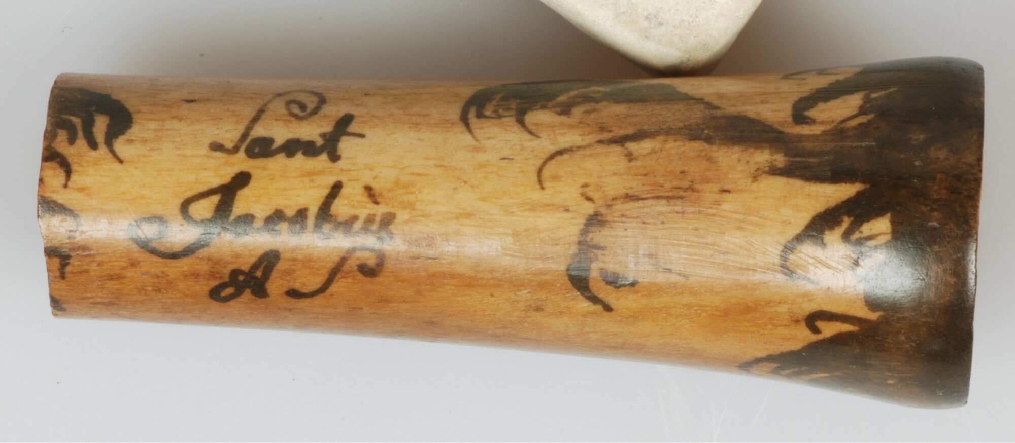 Mesheft; een afbeelding is gebrand of geschilderd aan de buitenzijde. Op het mesheft staat het lichaam (het hoofd is afgezaagd) van een religieus figuur afgebeeld met voor hem een wild golvende zee. Op de andere kant staat ''Sant Jacobús A S''. De afkorting A S zou kunnen staan voor Anno Sancto (in het helige/jubeljaar). Mogelijkerwijs ...