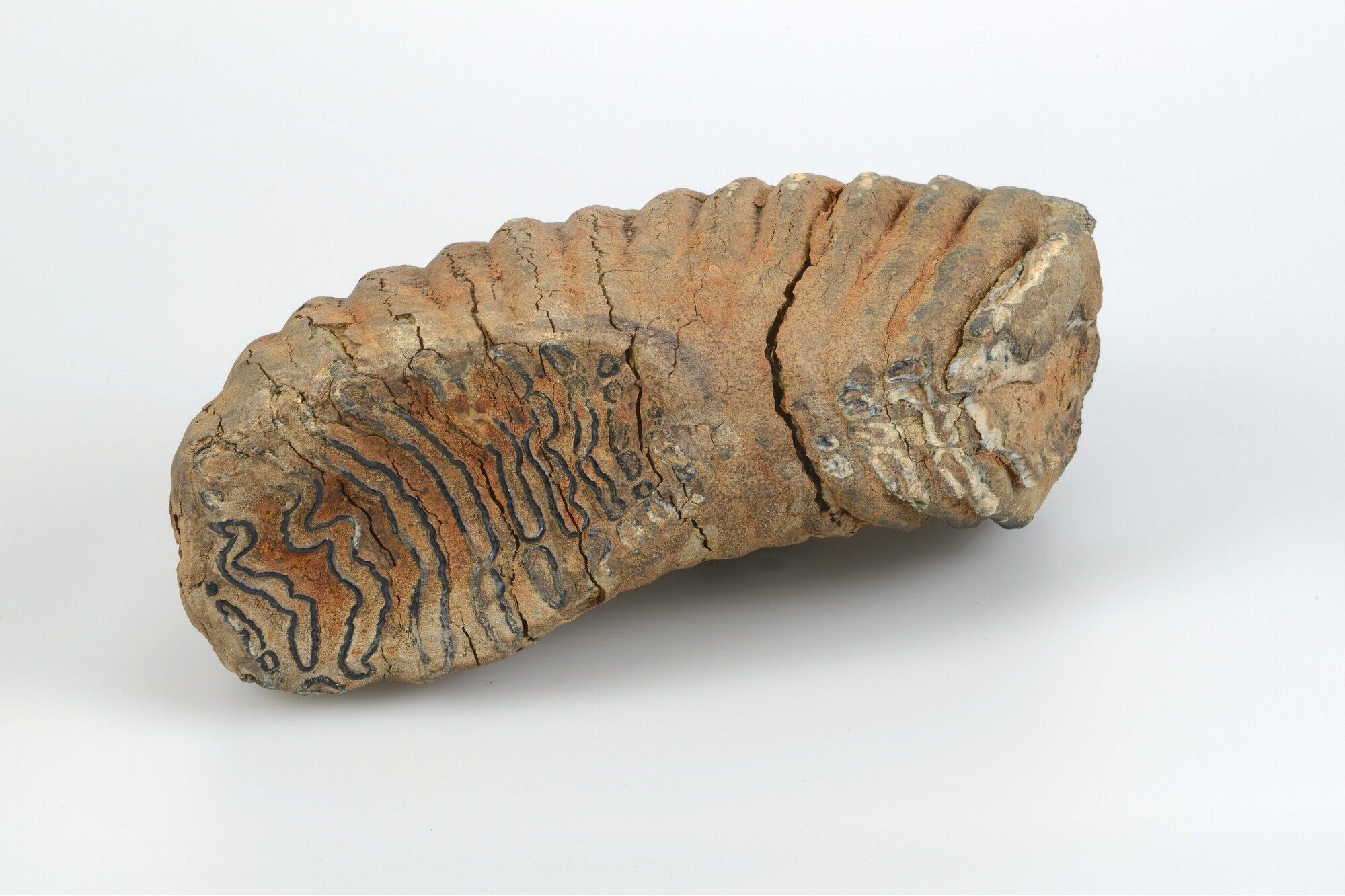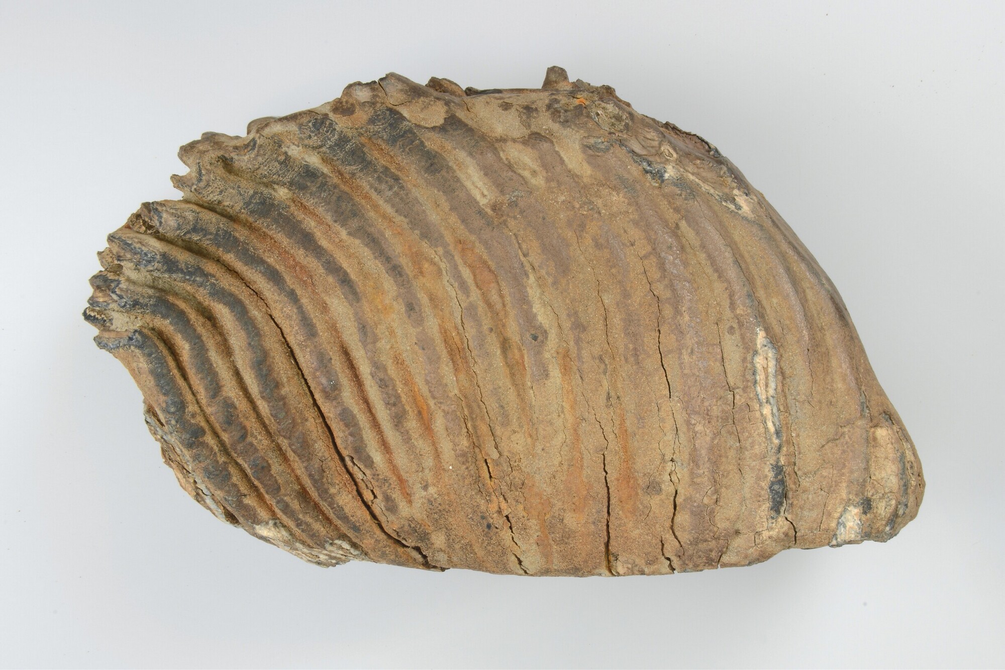 Kies; wolharige mammoet; onderkaak; aan het kauwvlak met smalle langwerpige richels en de hoge kroon is direct te zien dat de kies van een wolharige mammoet (Mammuthus primigenius) moet zijn geweest. In dit geval gaat het om een onderkaakskies: de kies heeft een hol kauwvlak, zowel over de lengte-as als over de breedte-as. Het kauwvlak ...