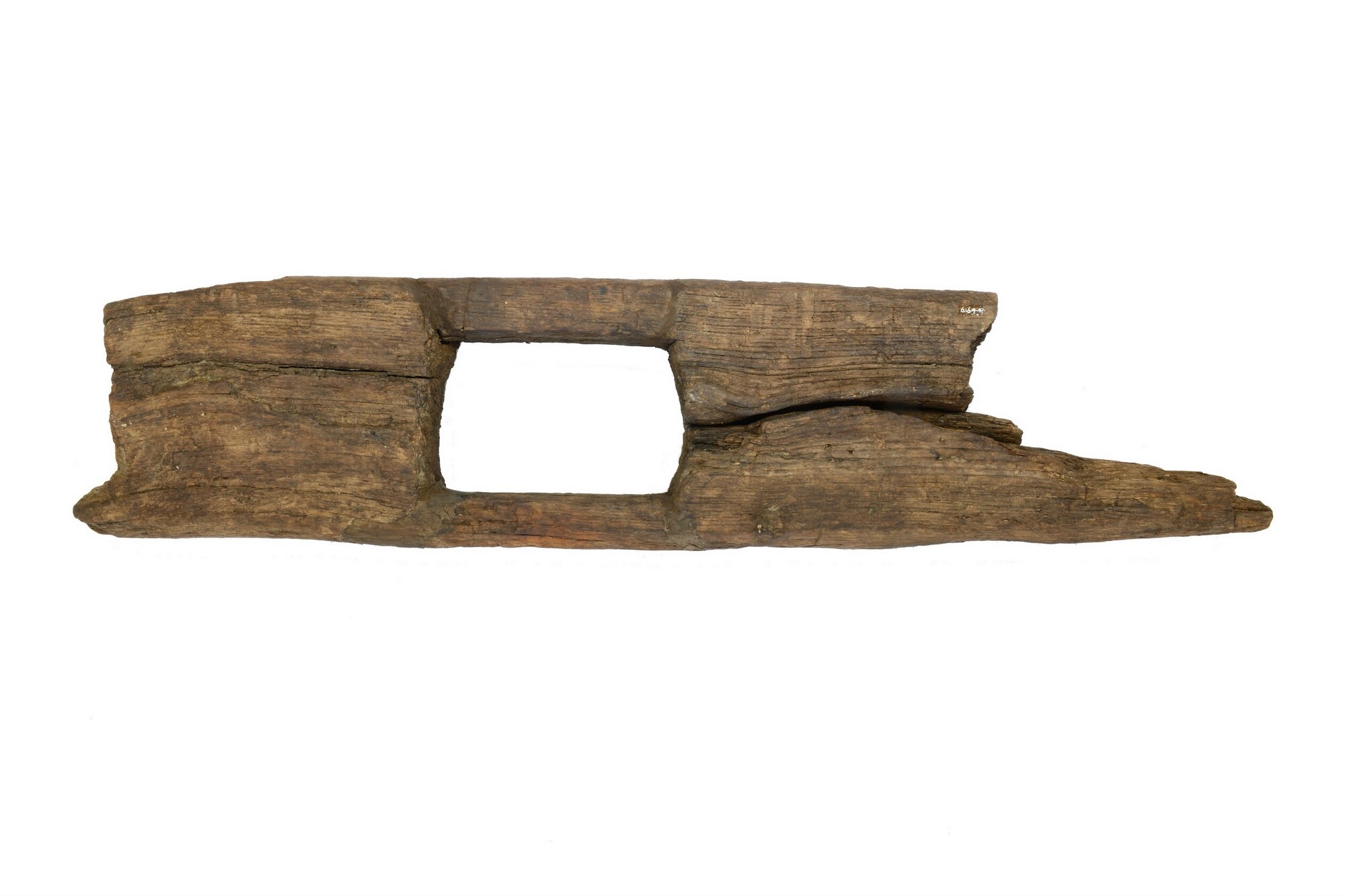 Plank; eikenhout; rechthoekige plank met centraal gat; het gat heeft een breedte van 11 cm en een lengte van 15 cm. mogelijk iets hol gesleten;