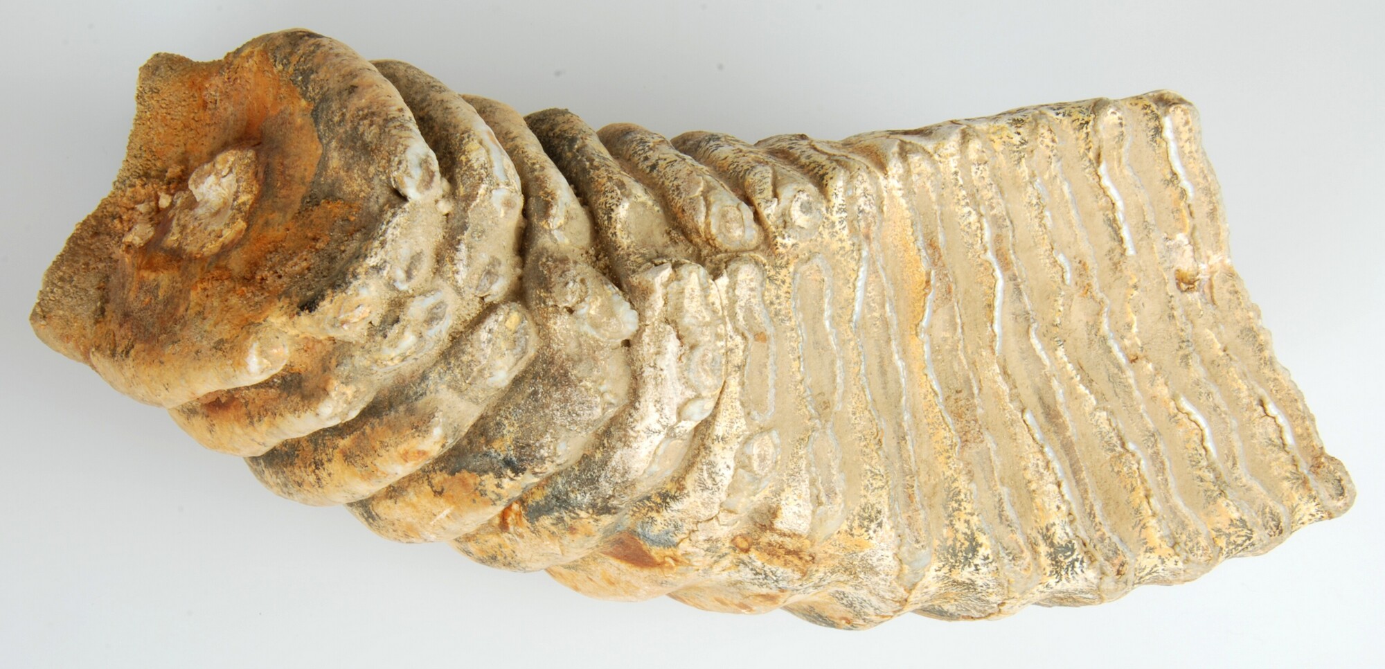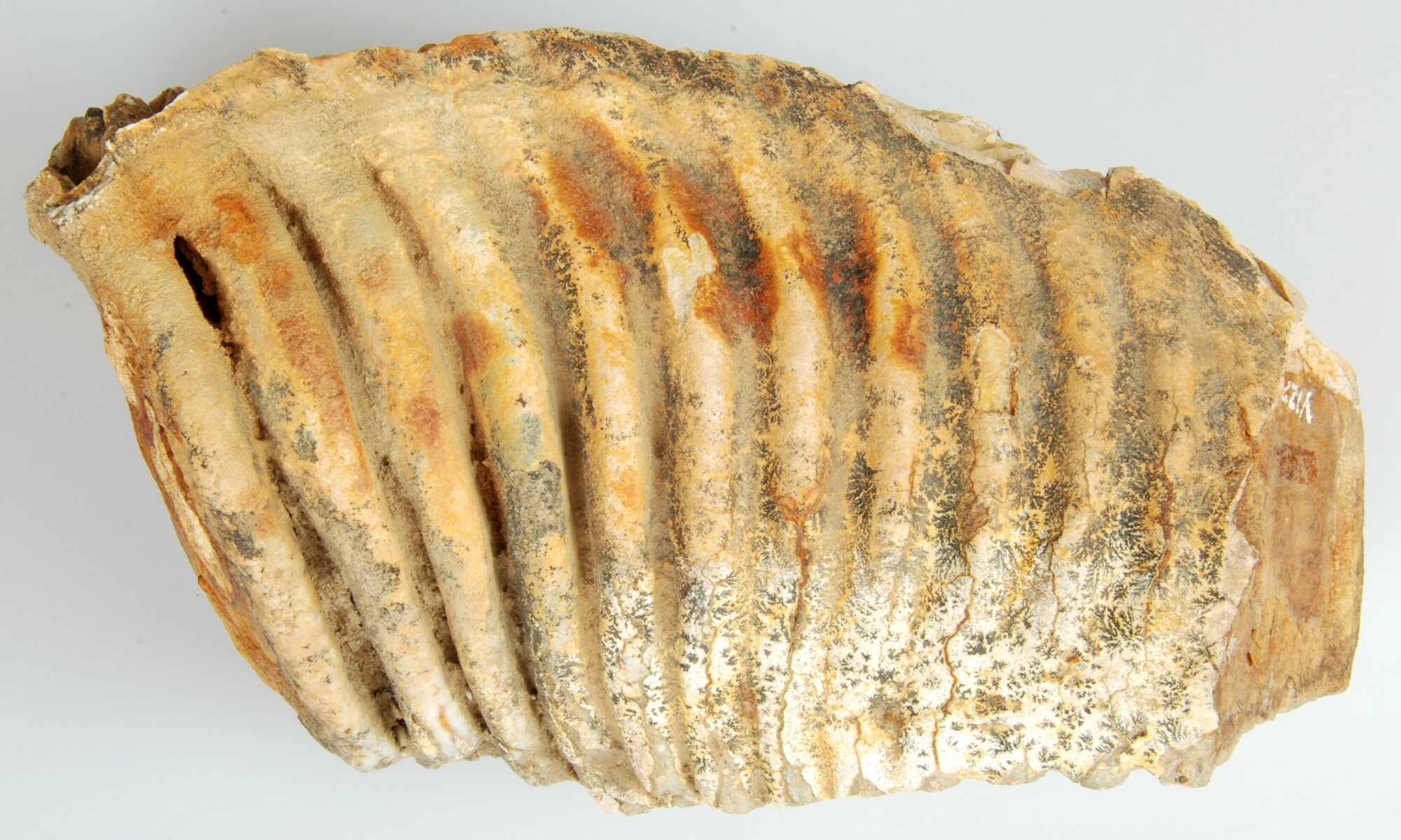 Kies; wolharige mammoet, Mammuthus primigenius (Blumenbach, 1799); kauwvlak met smalle langwerpige richels en hoge kroon; mangaanvergroeiingen op het oppervlak