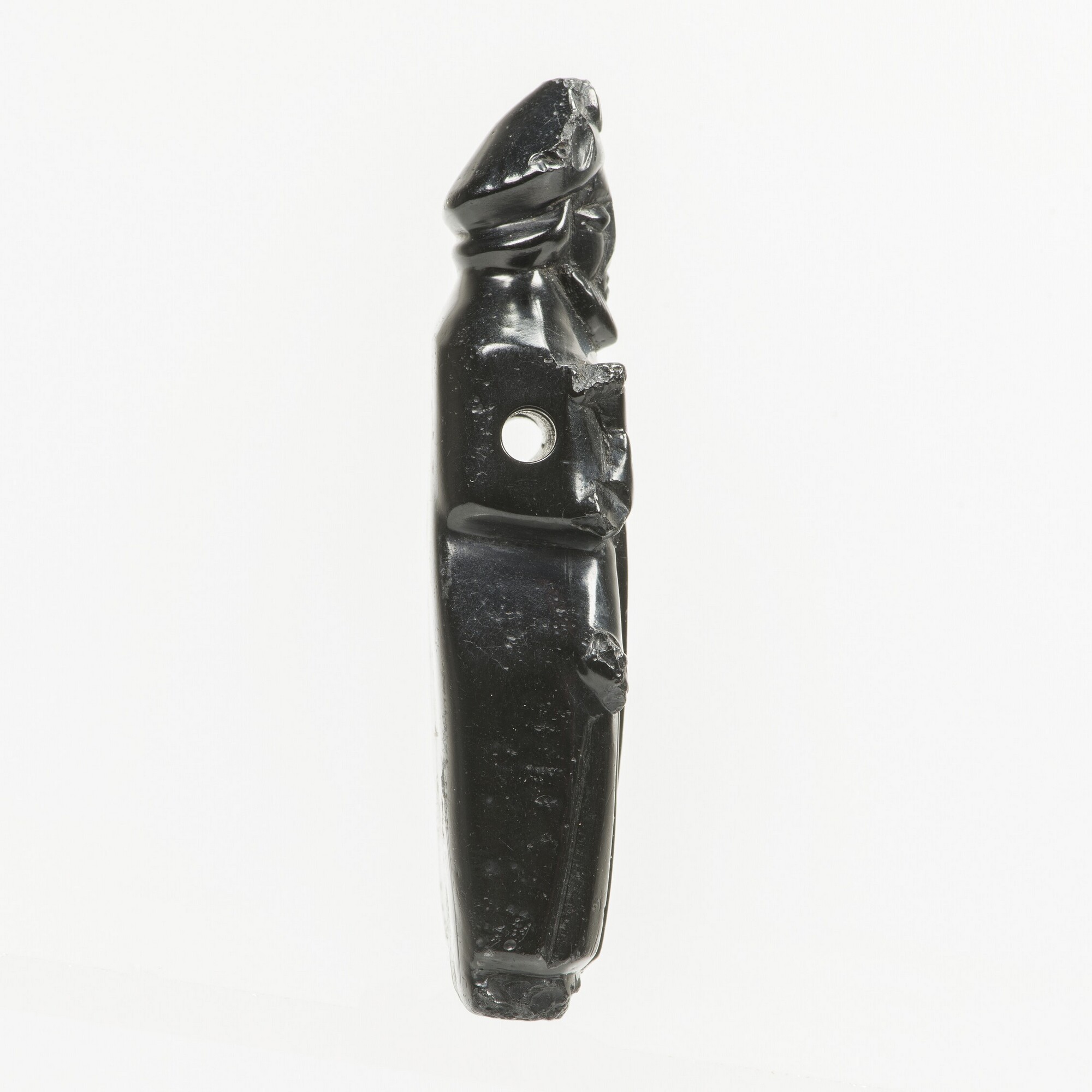 Azabache / pelgrimsinsigne; Sint Jacob maior, gekleed als pelgrim; op zijn hoofd draagt hij een hoed, waarop een Jacobsschelp is bevestigd; in zijn rechterhand heeft hij een pelgrimsstaf; de linker arm is bij de elleboog afgebroken; daaronder hangt een tas; iets beneden zijn schouders loopt dwars een rond gat waardoor een metalen frame stak waarmee ...