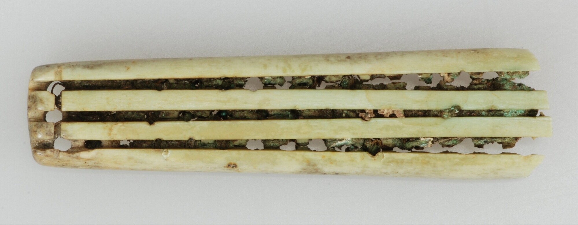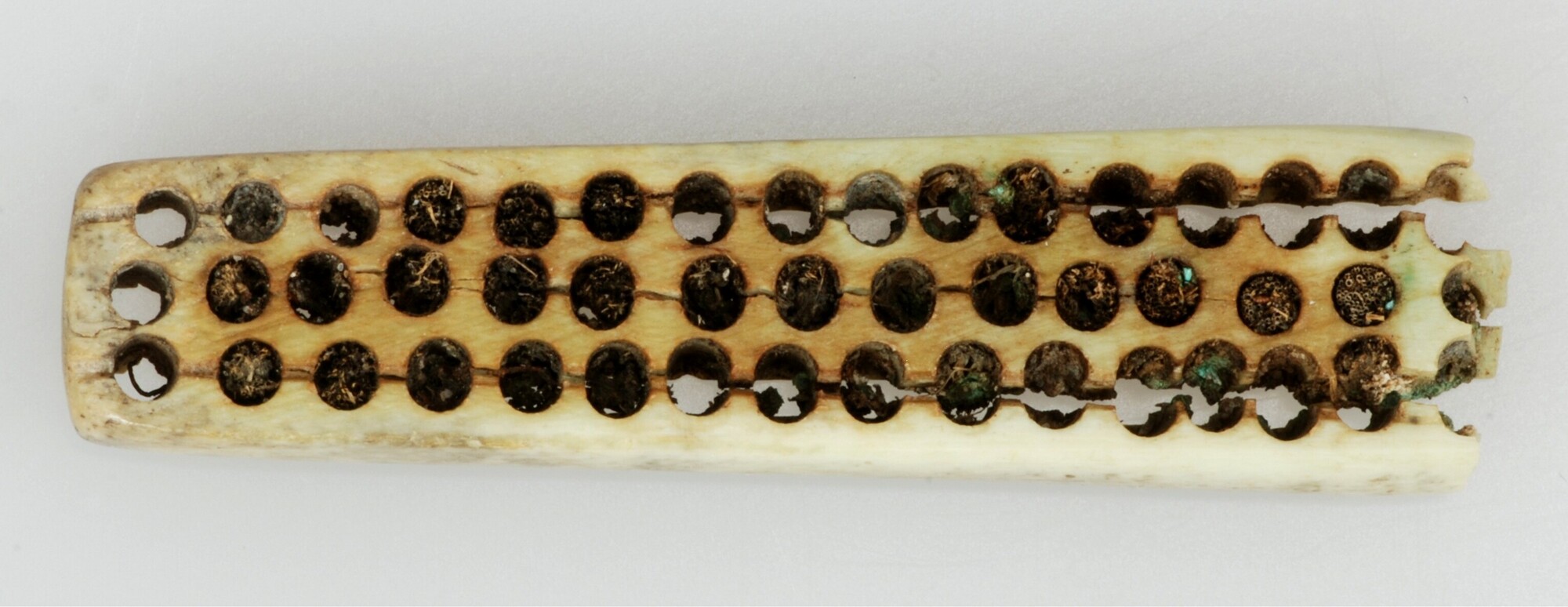 Borstel; fragment kleine borstel die voorzien is van drie rijen van zestien gaten, waarin oorspronkelijk bundels varkensharen hebben gezeten, waarvan de resten nog zichtbaar zijn. Het koperdraad ontbreekt en heeft alleen groene verkleuringen op de borstel achtergelaten