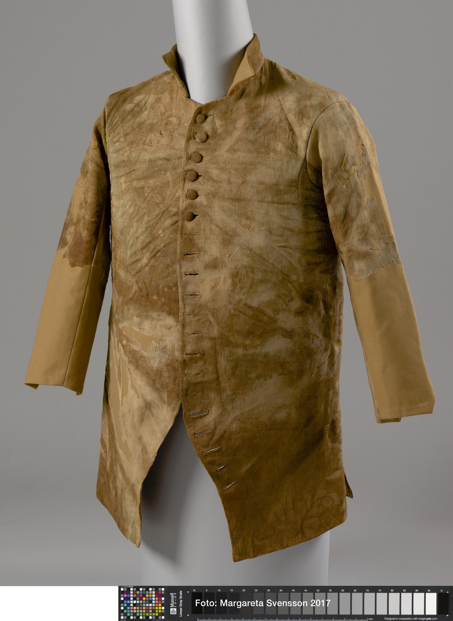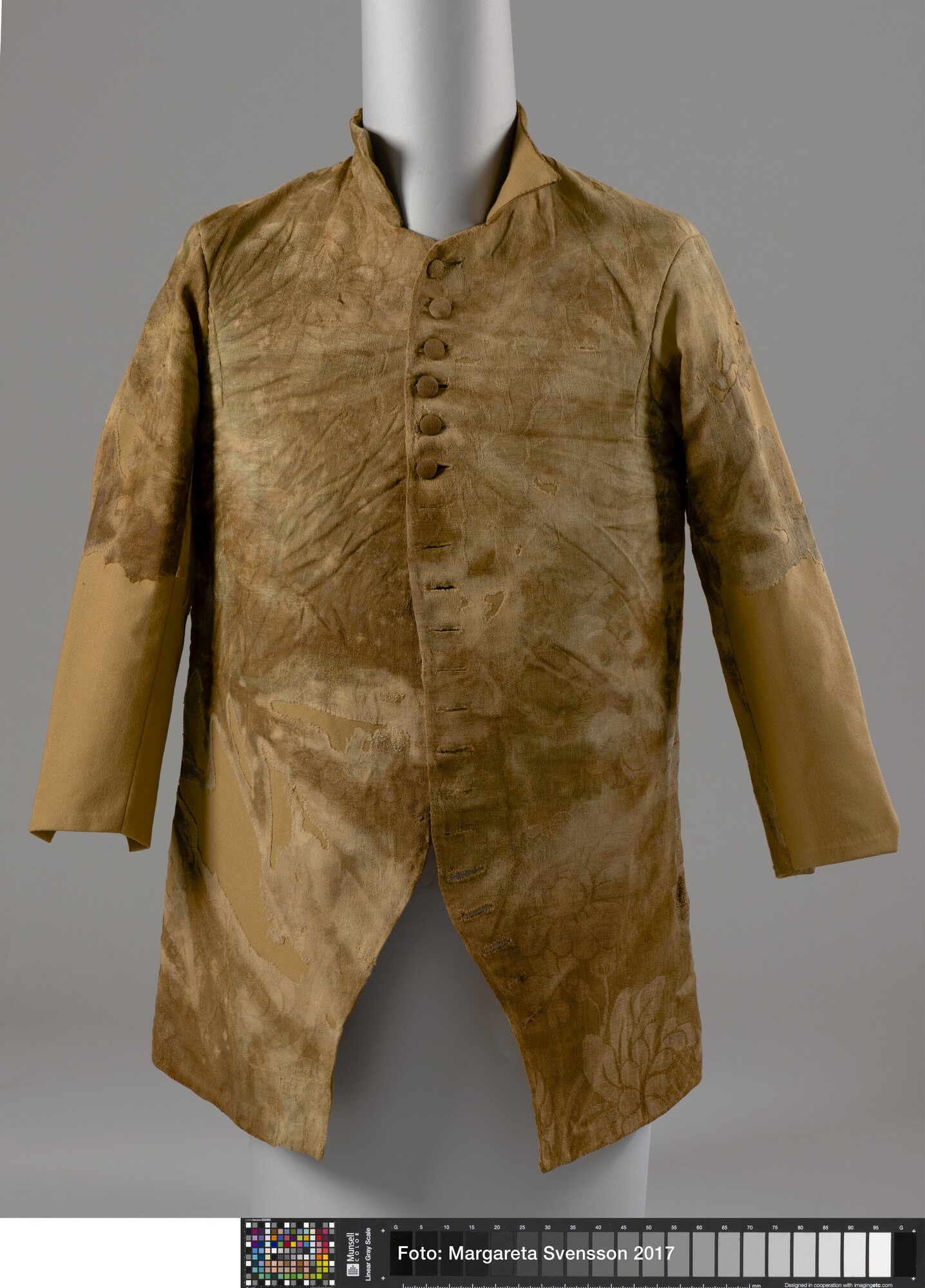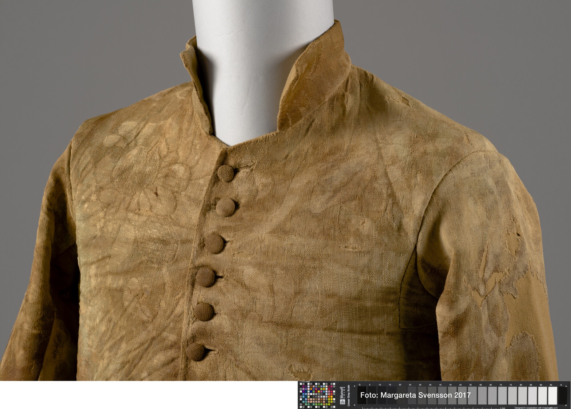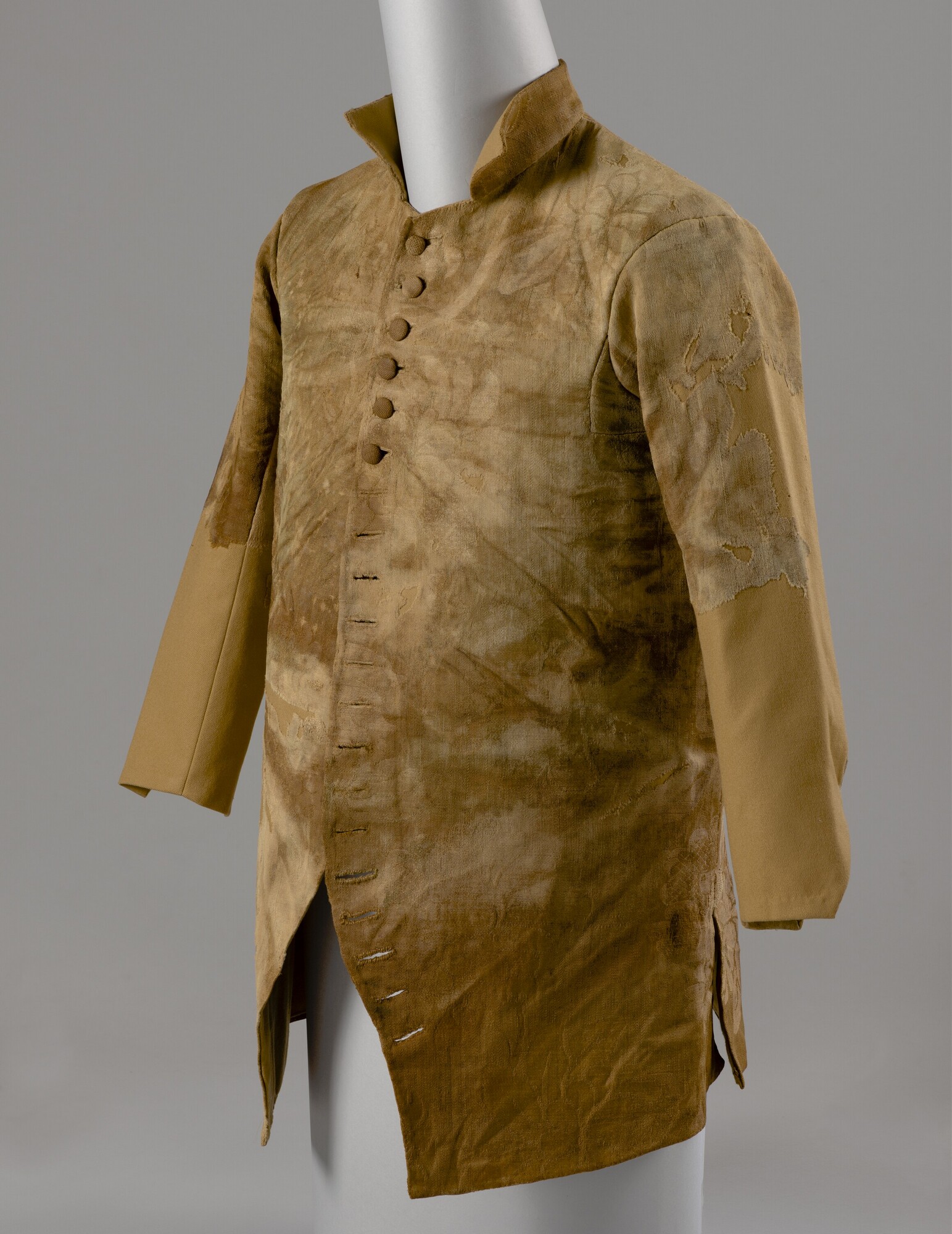 Heren jas; wol; damast geweven; versierd met grote bloemmotieven; opstaande kraag; 20 knoopsgaten, 5 bovenste knopen nog aanwezig; twee bijbehorende losse mouwdelen (6217-01b en c); onbekend los deel (6217-01d)