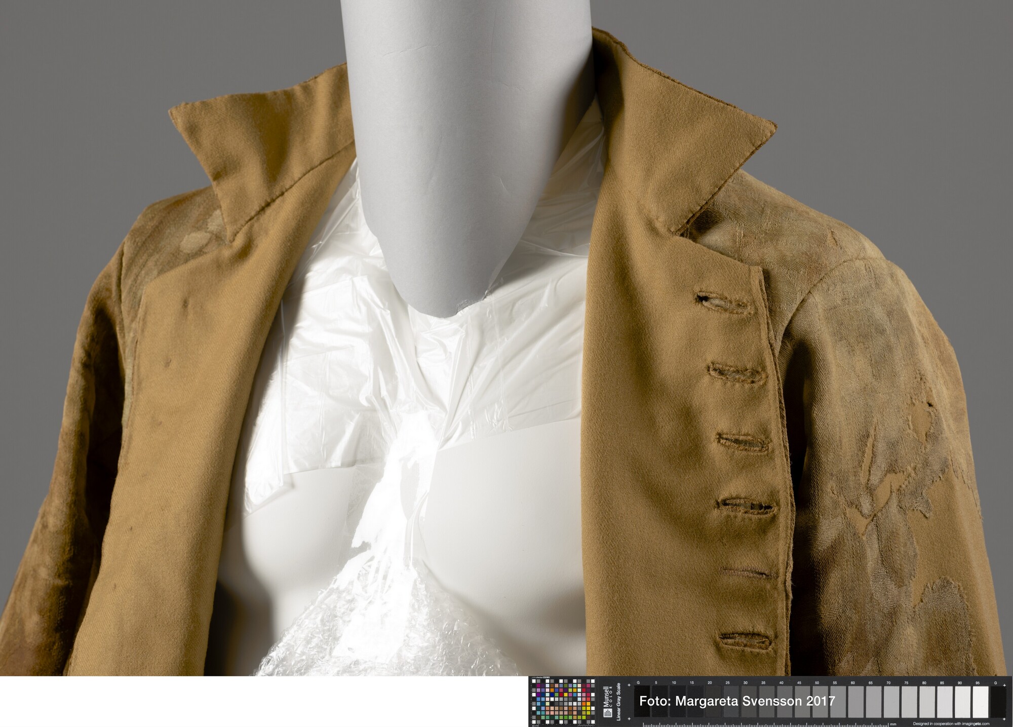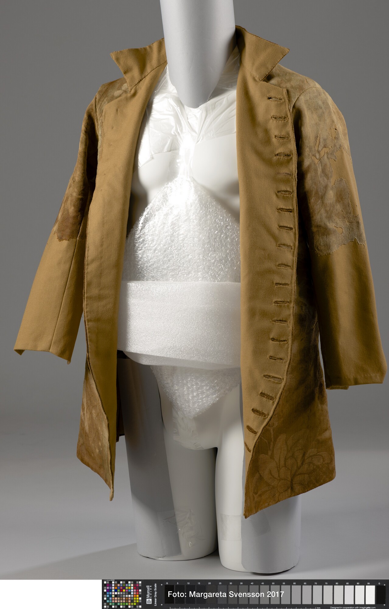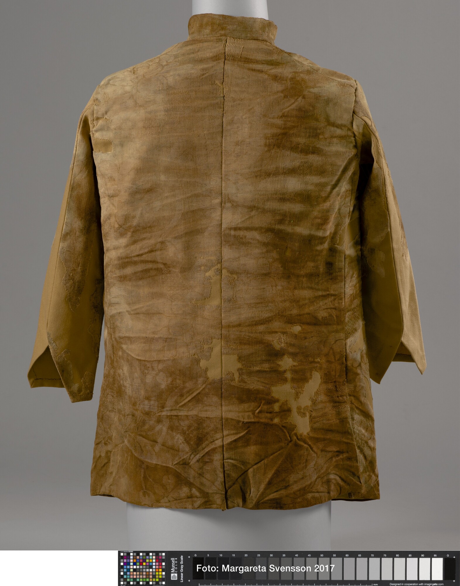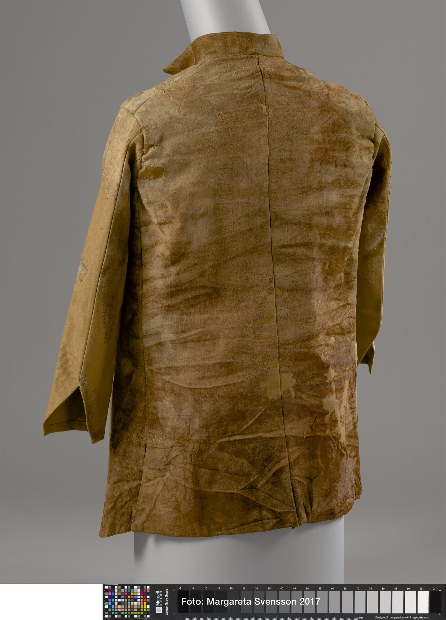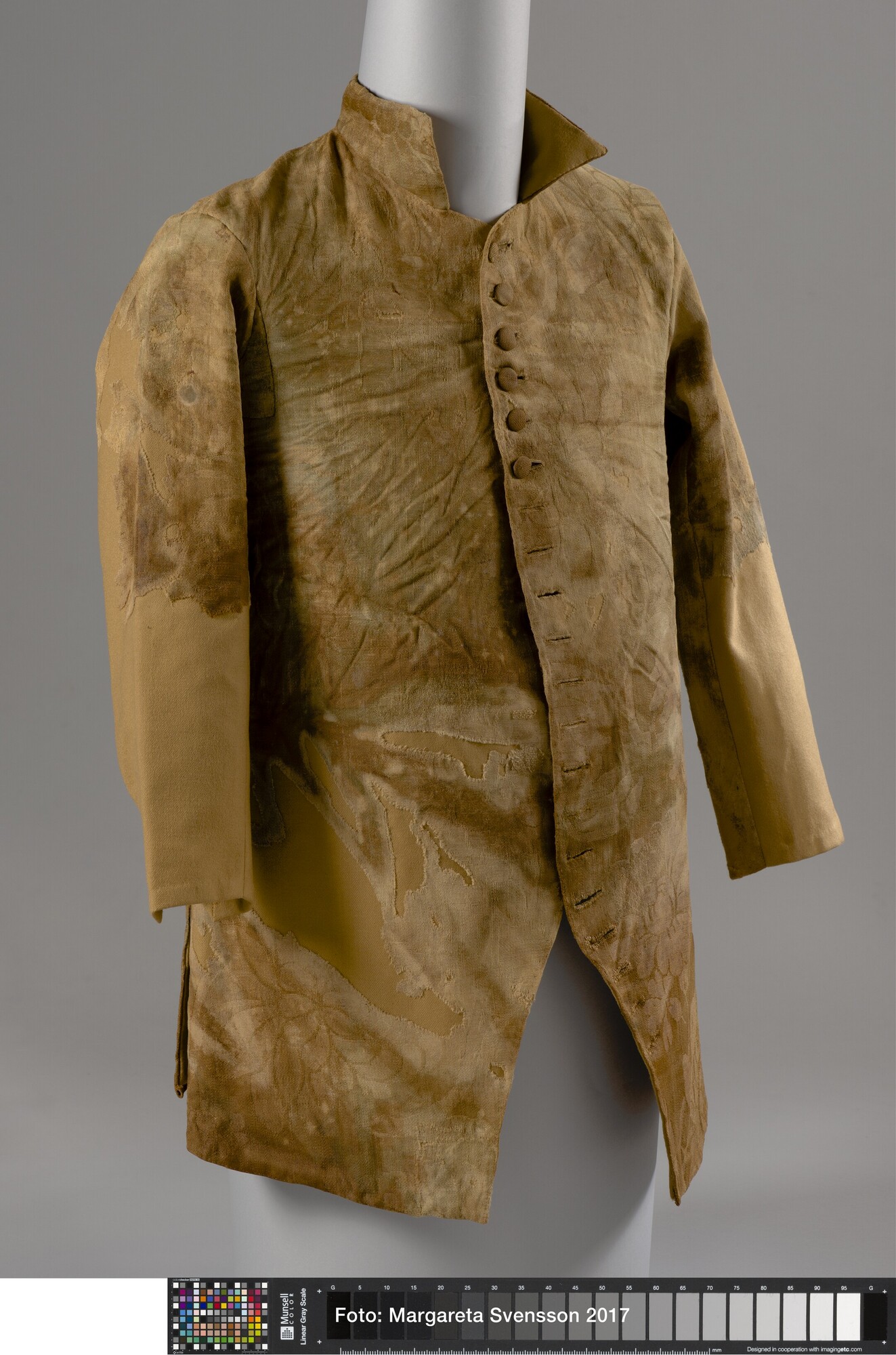 Heren jas; wol; damast geweven; versierd met grote bloemmotieven; opstaande kraag; 20 knoopsgaten, 5 bovenste knopen nog aanwezig; twee bijbehorende losse mouwdelen (6217-01b en c); onbekend los deel (6217-01d)