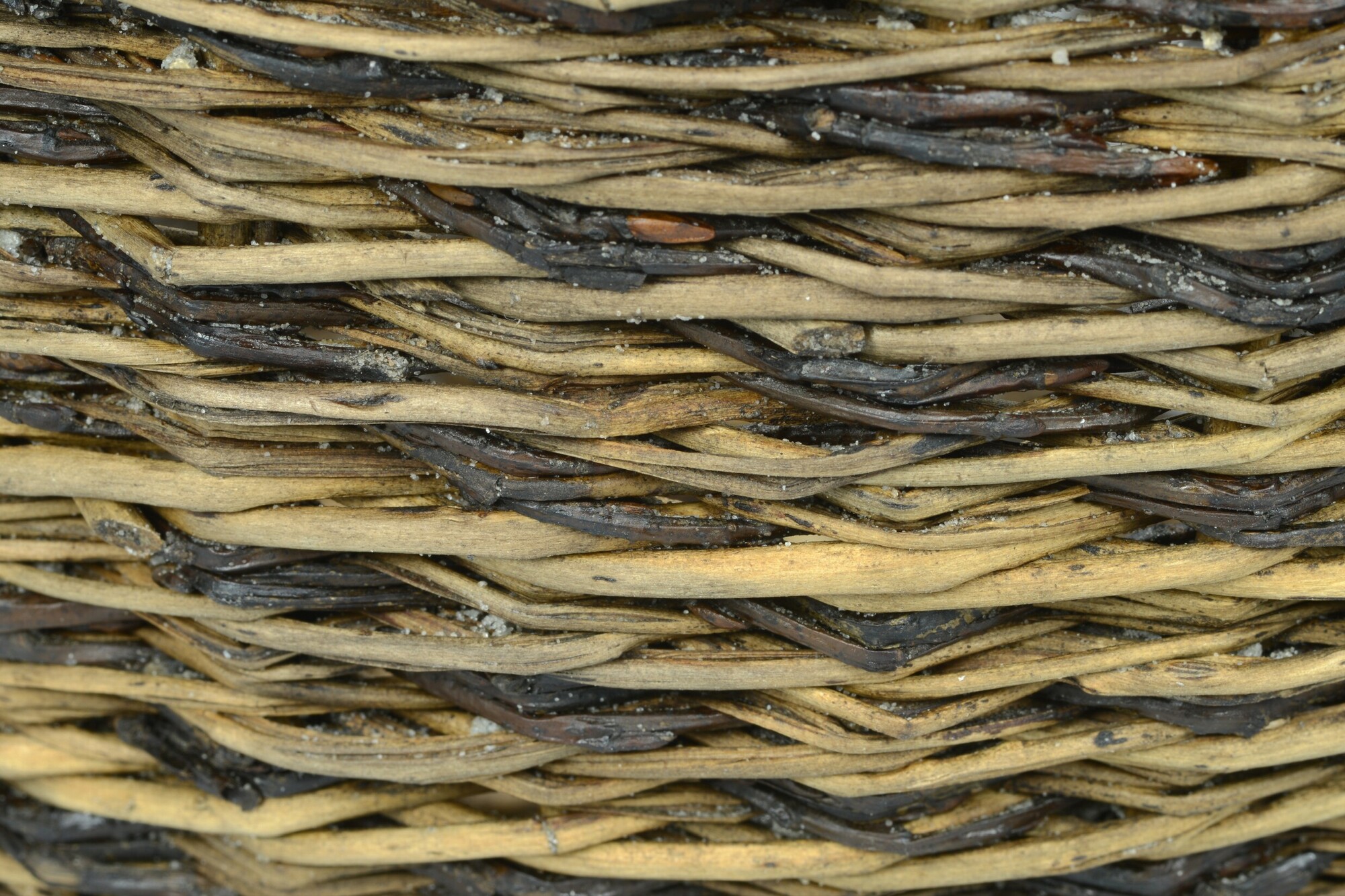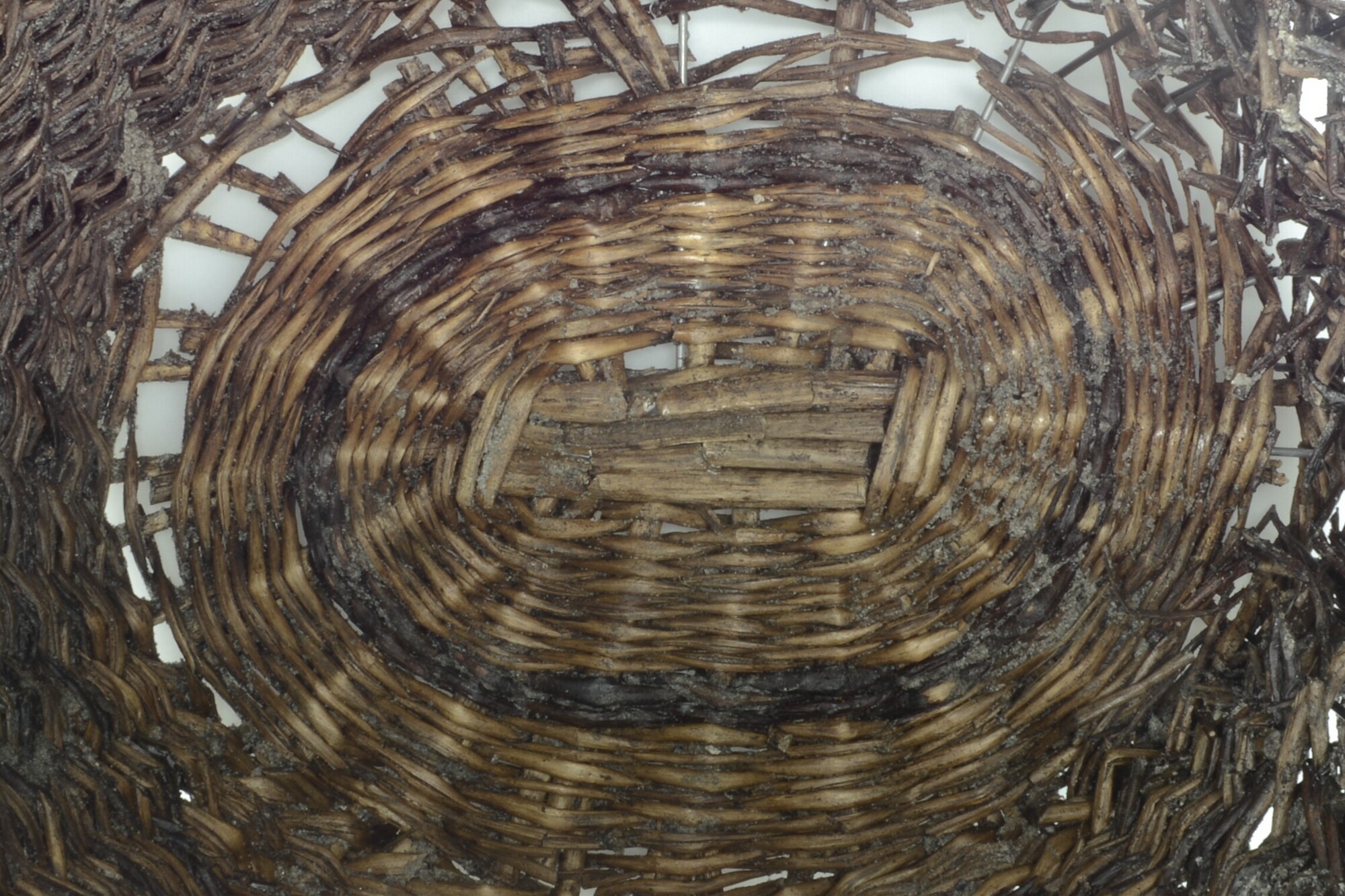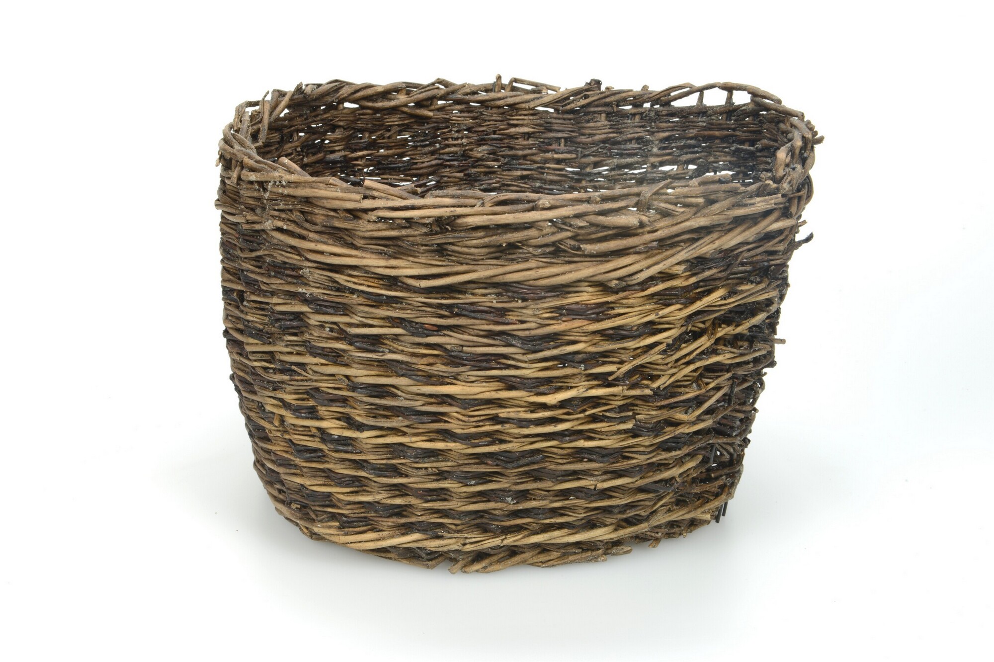 Mand, gevlochten van fijne afwisselend lichtbruine en zwarte twijgen, boven en onder sierbanden; hengsel ontbreekt