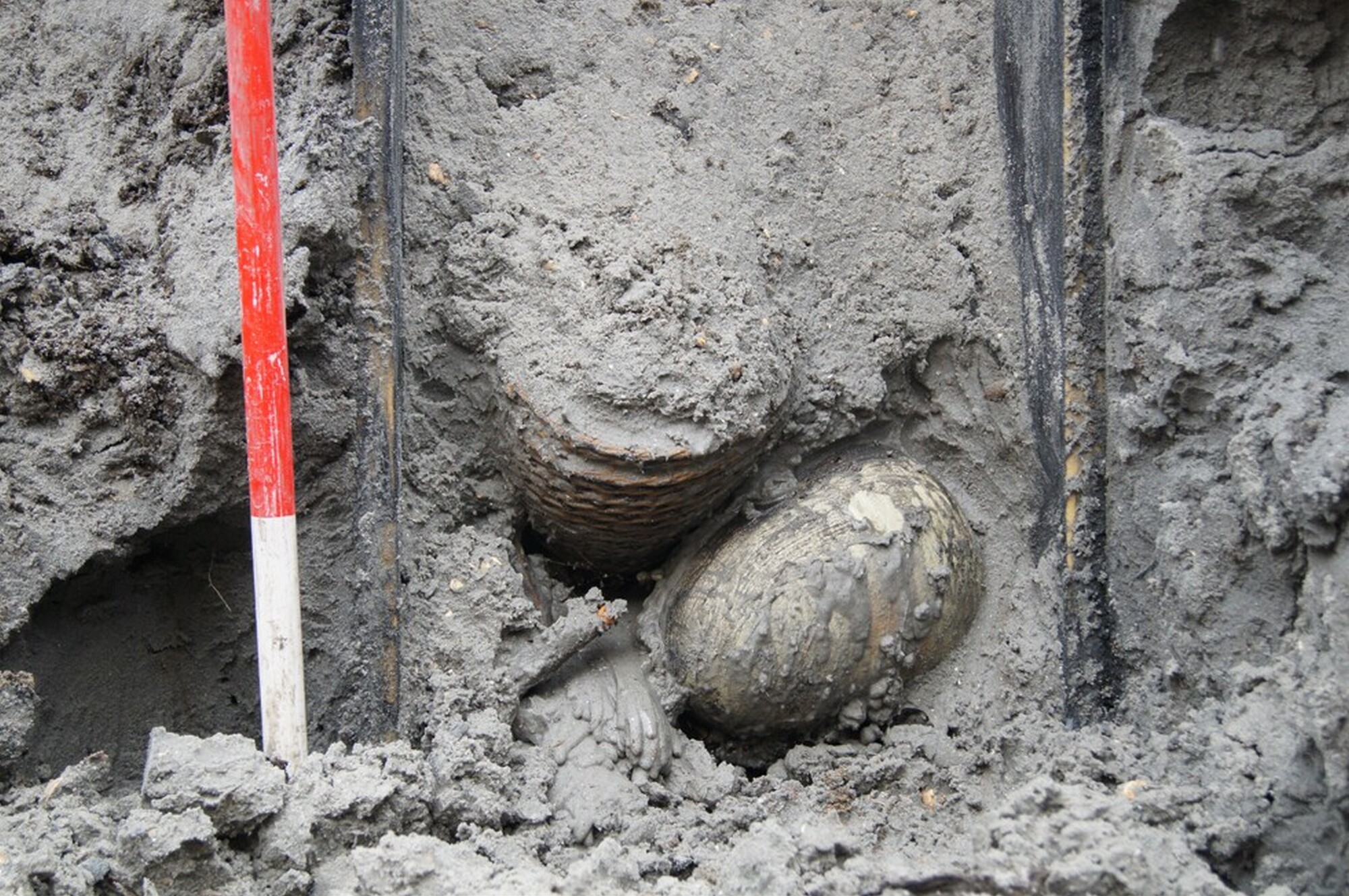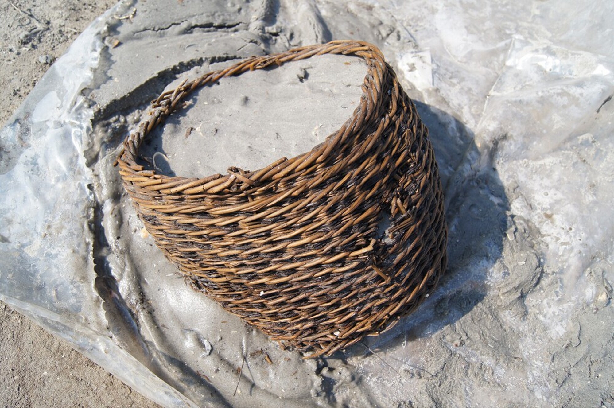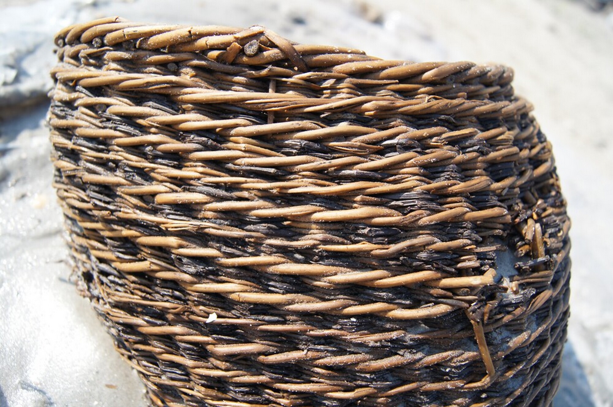 Mand, gevlochten van fijne afwisselend lichtbruine en zwarte twijgen, boven en onder sierbanden; hengsel ontbreekt