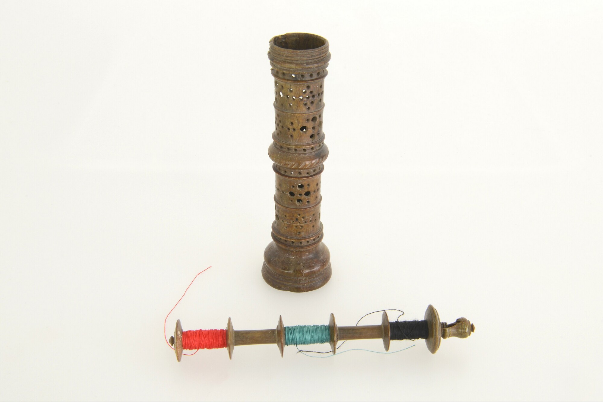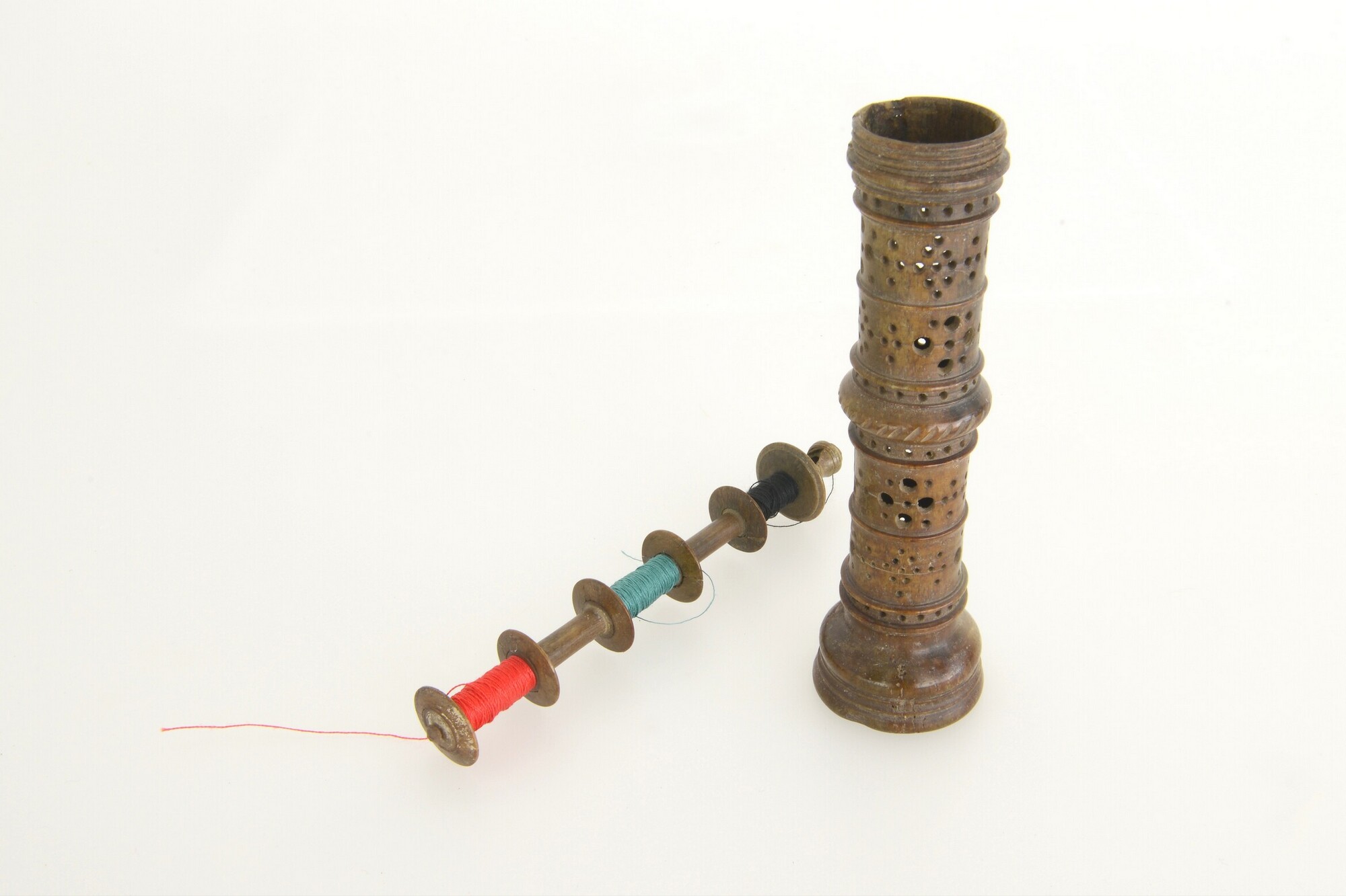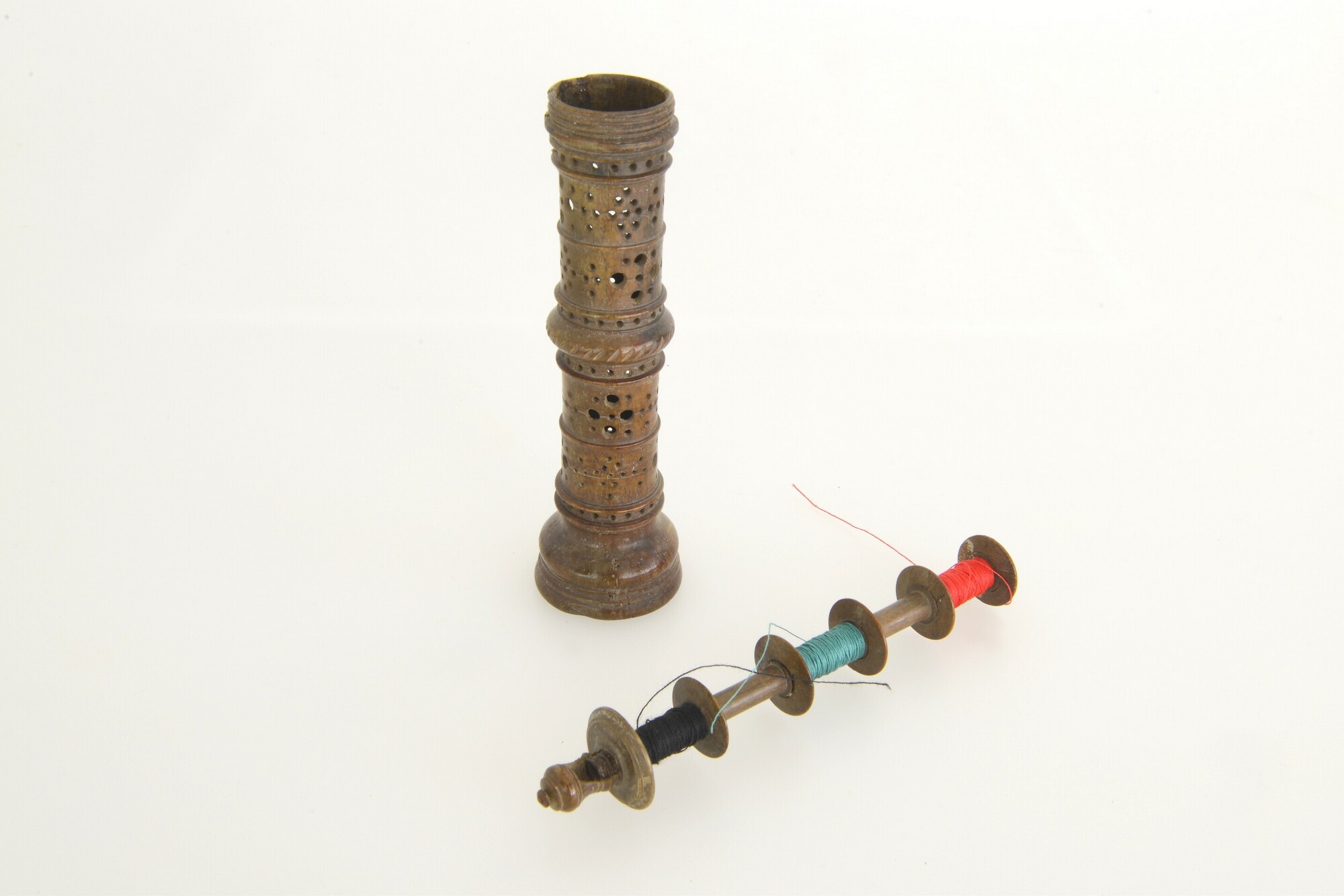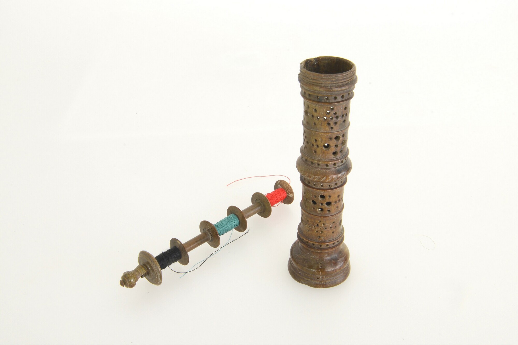Naaigarnituur; de benen houder heeft een opengewerkte versiering en de spoel bestaat uit vijf compartimenten; de schroefdop die diende als afsluiting, ontbreekt