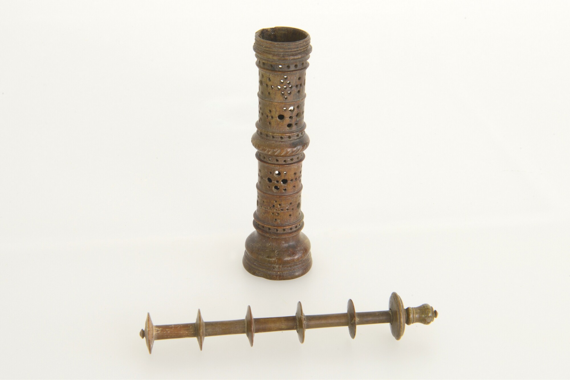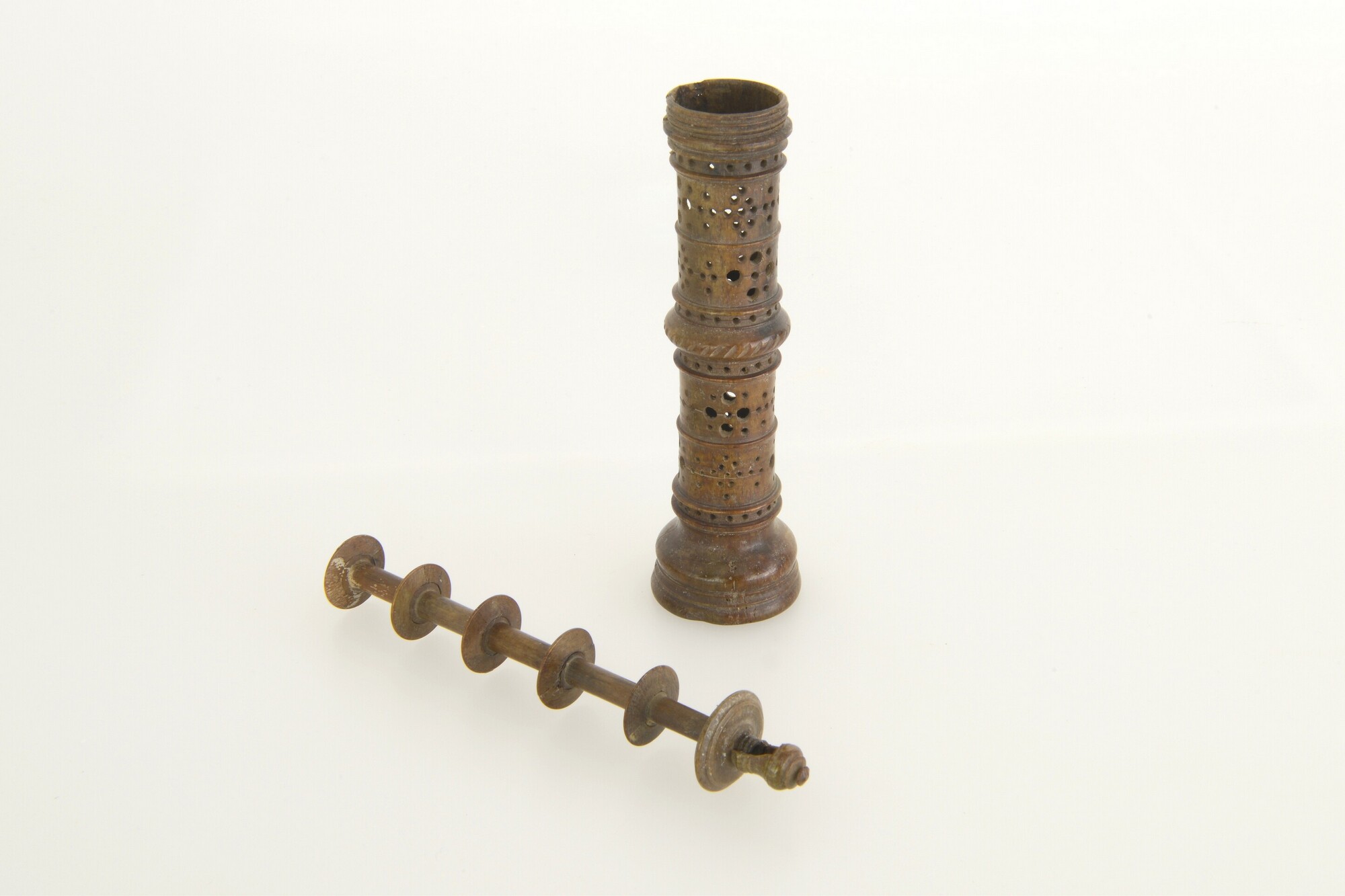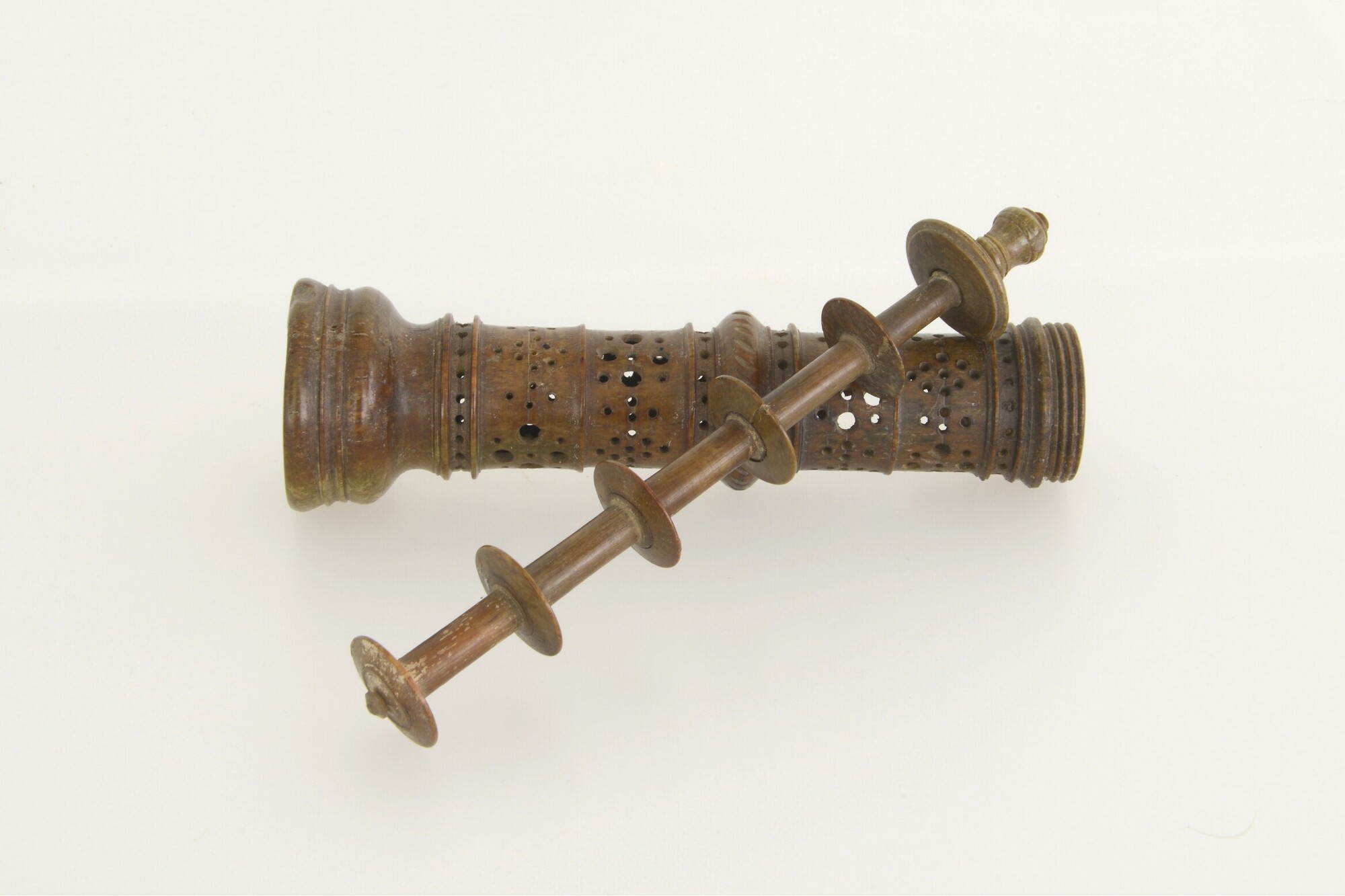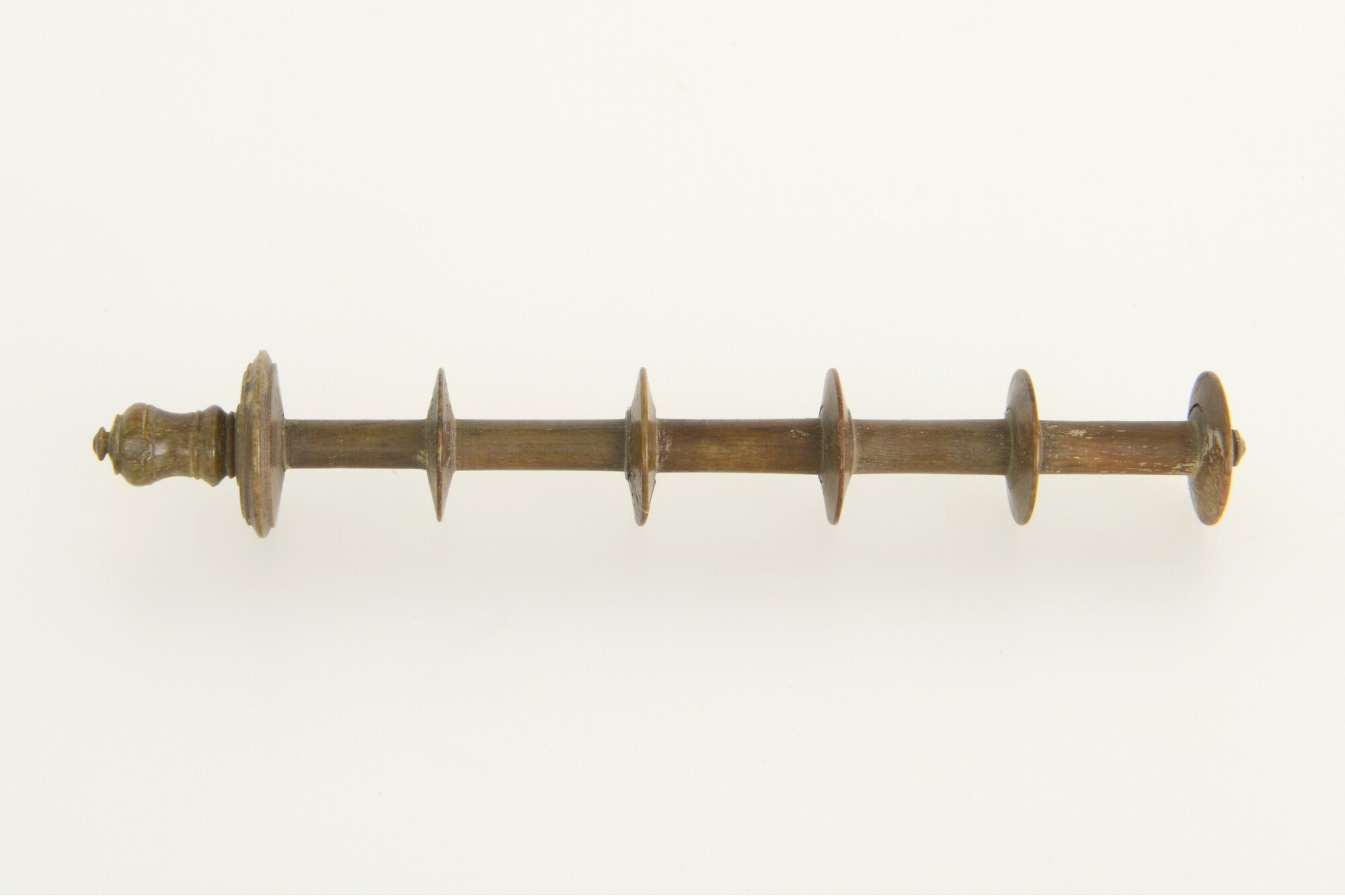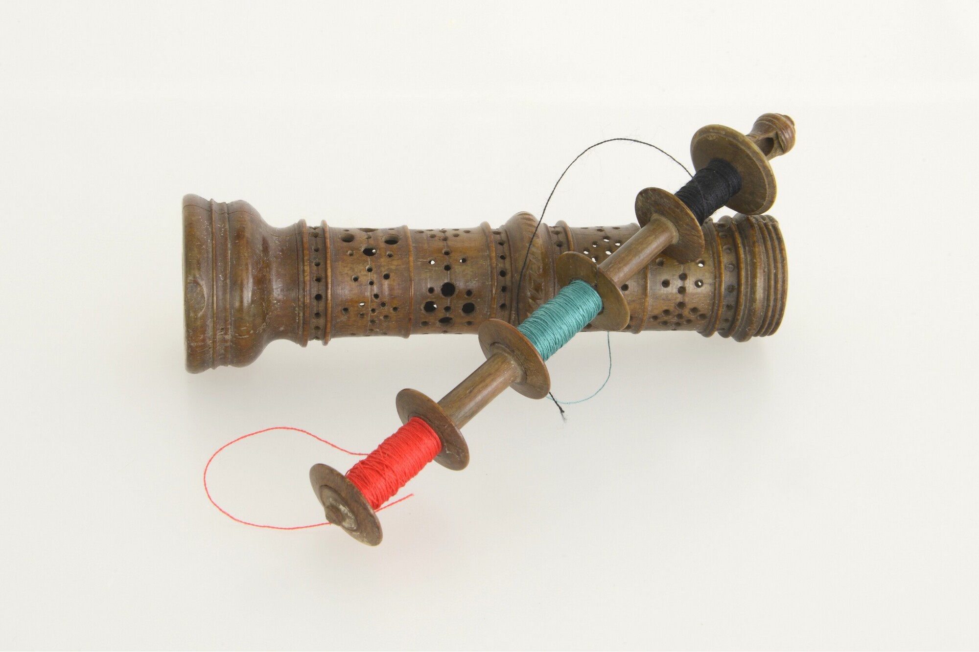 Naaigarnituur; de benen houder heeft een opengewerkte versiering en de spoel bestaat uit vijf compartimenten; de schroefdop die diende als afsluiting, ontbreekt