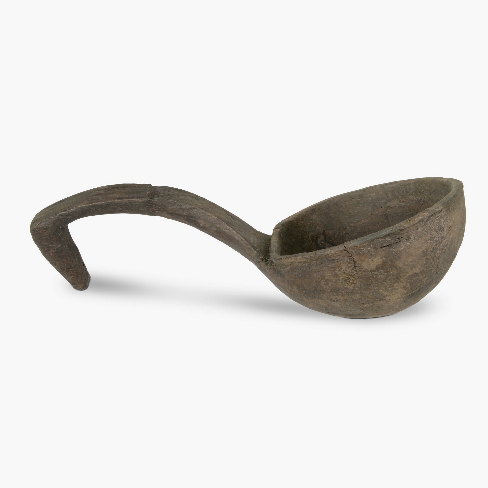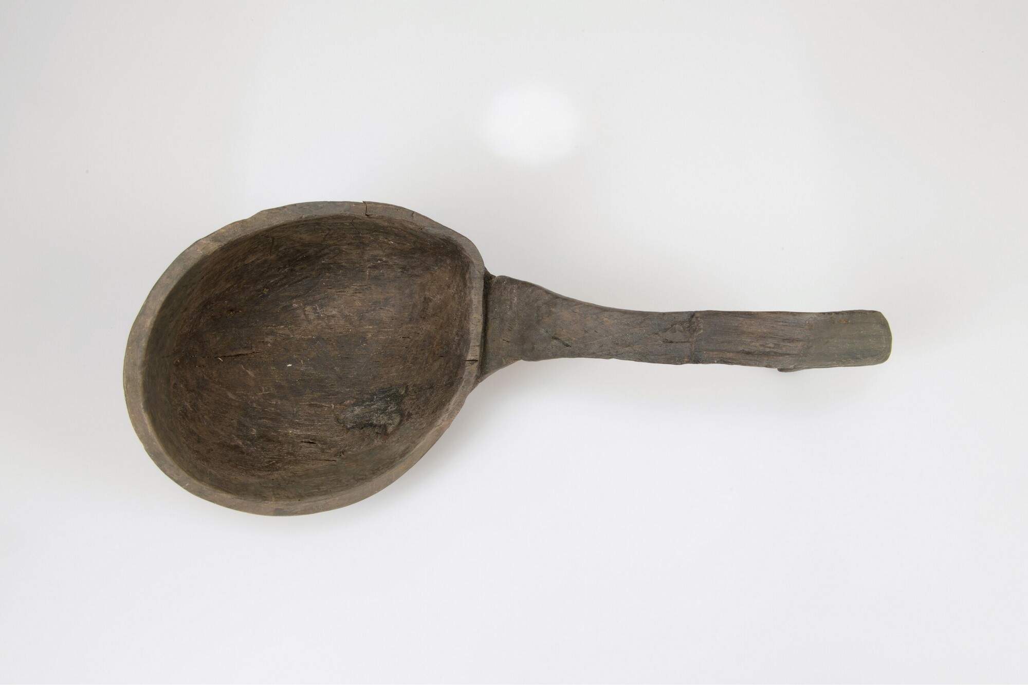 Scheplepel met een korte, in een gebogen vorm gesneden steel met een haakvormig uiteinde, gesneden uit één stuk. Het hout is in lengterichting uit de stam gehaald. De steel met haak heeft een platte bovenkant en geronde onder- en zijkanten. Aan buiten- en binnenkant van de lepelbak zijn de snijsporen van een mes te herkennen.