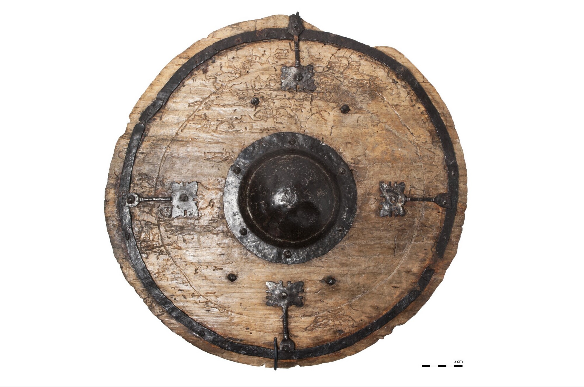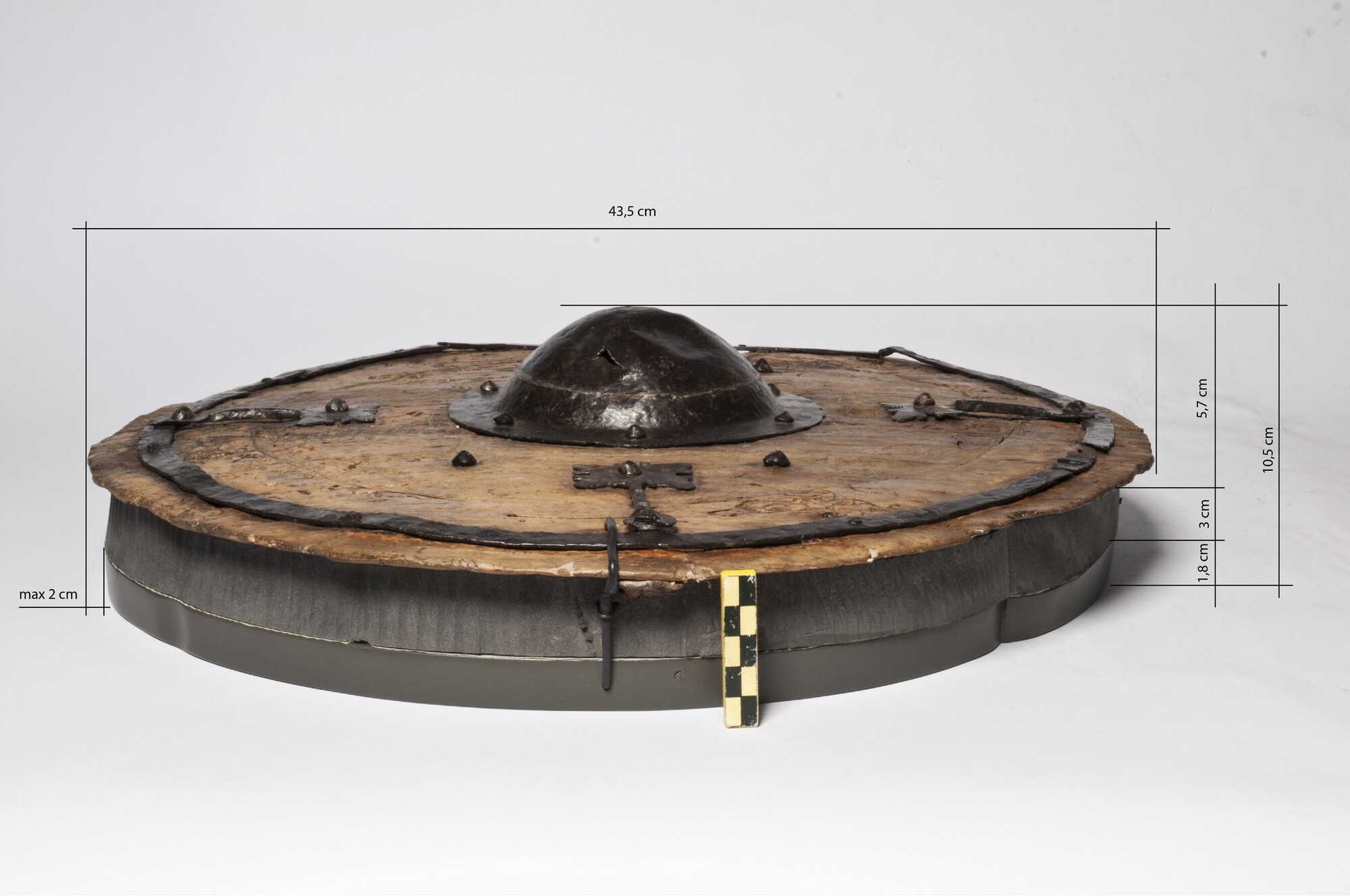 Schild van wilgenhout met een handgreep van populierenhout en ijzeren beslag met versiering van tin?