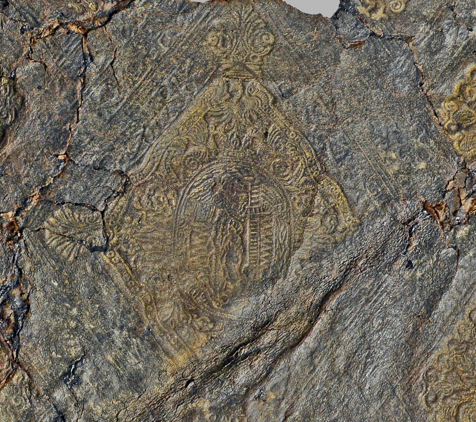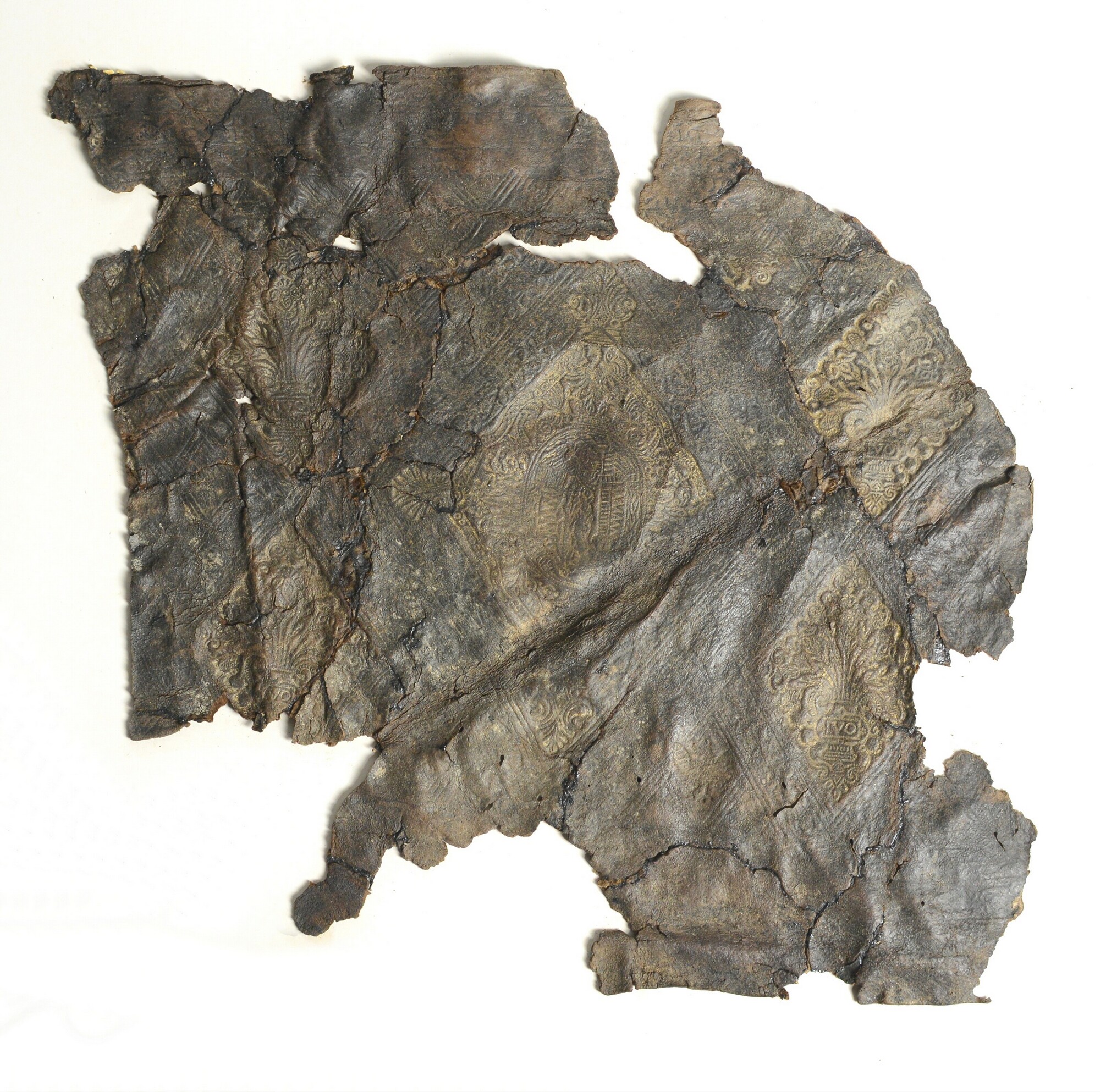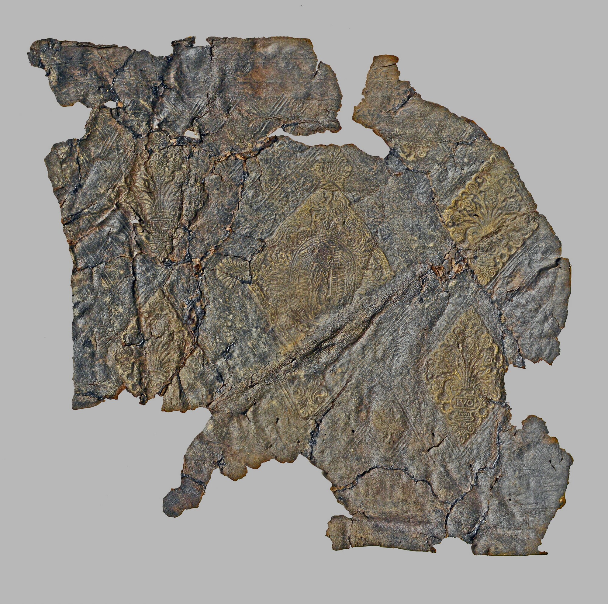Bekleding van een boek; versierd met stempels; resten van goud; afgebeeld: de droom van aartsvader Jakob met een engel en de jakobsladder (Genesis 28:1), rijke bloemenvaas met initialen IVO.
