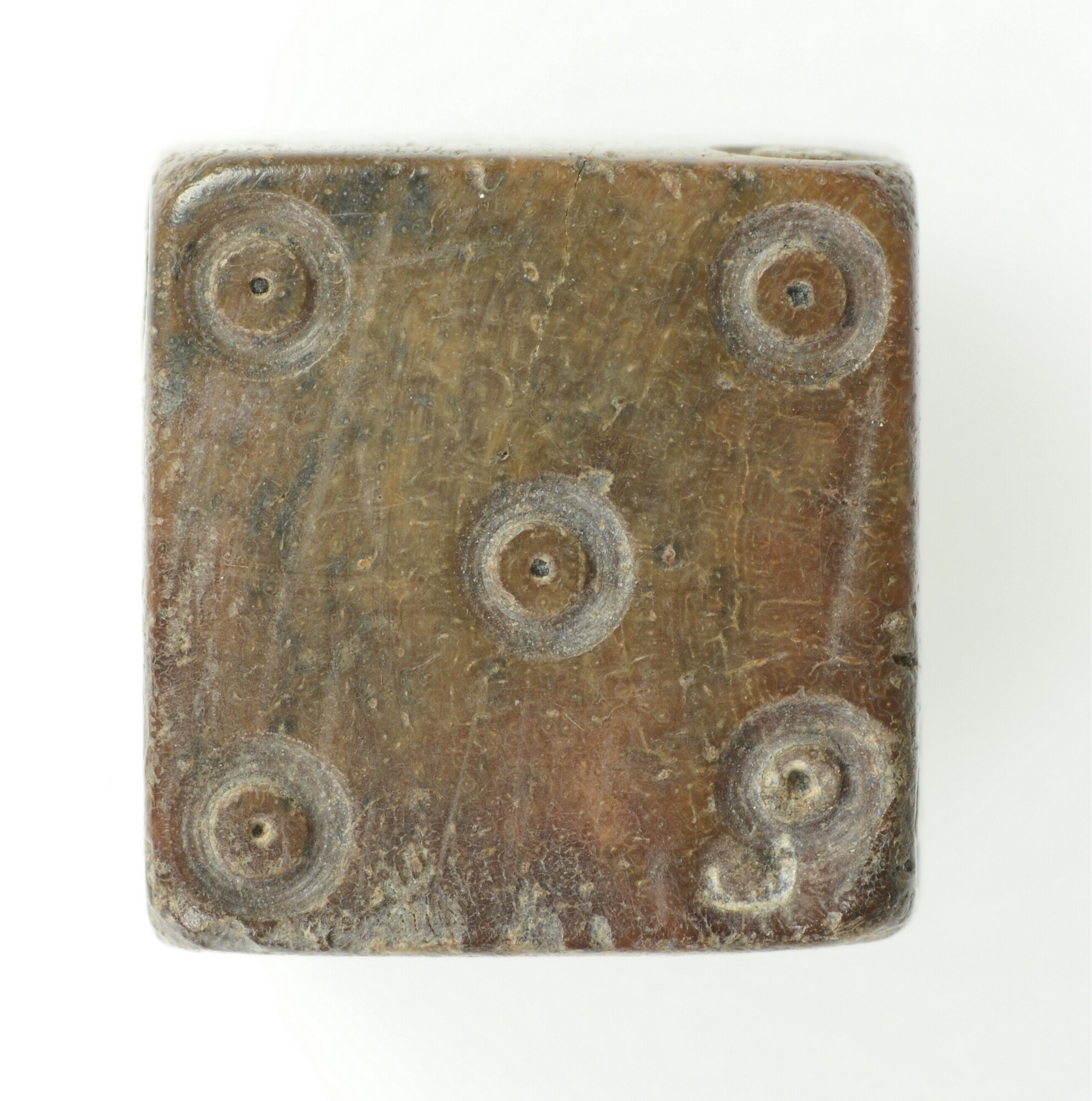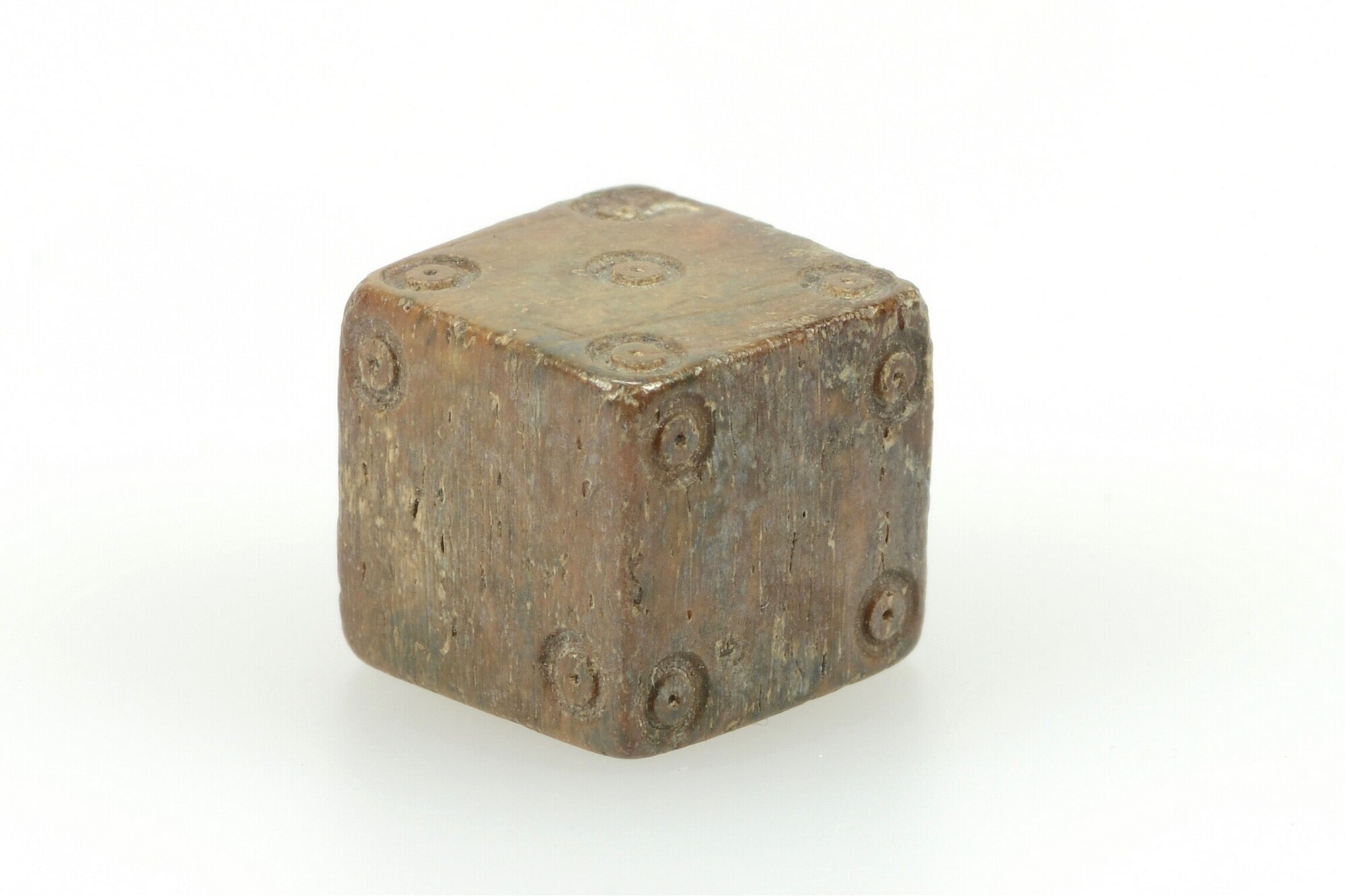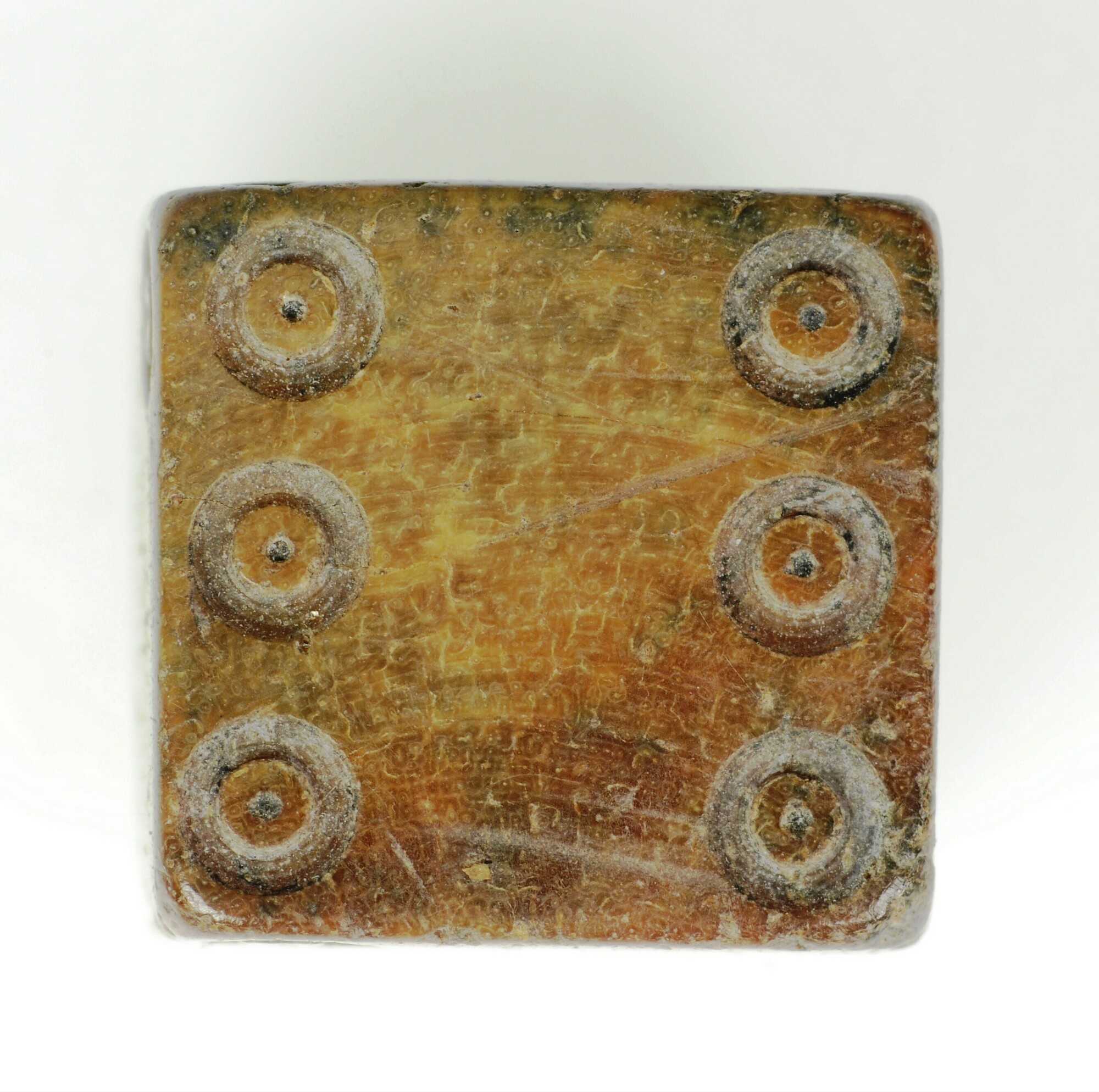 Dobbelsteen; waarde aanduiding met puntcirkel-versiering aangebracht. De ogen 1-2, 3-4 en 5-6 liggen tegenover elkaar