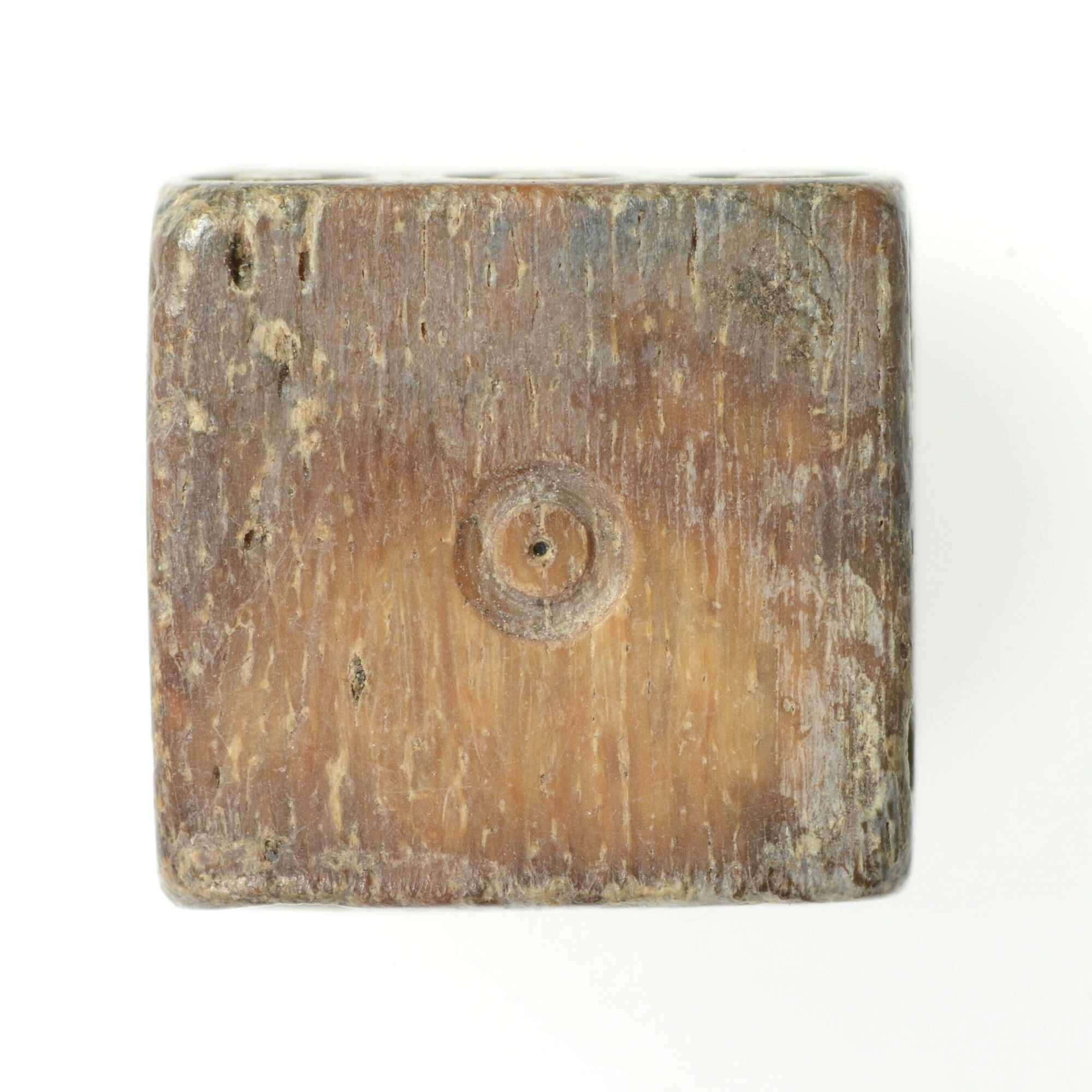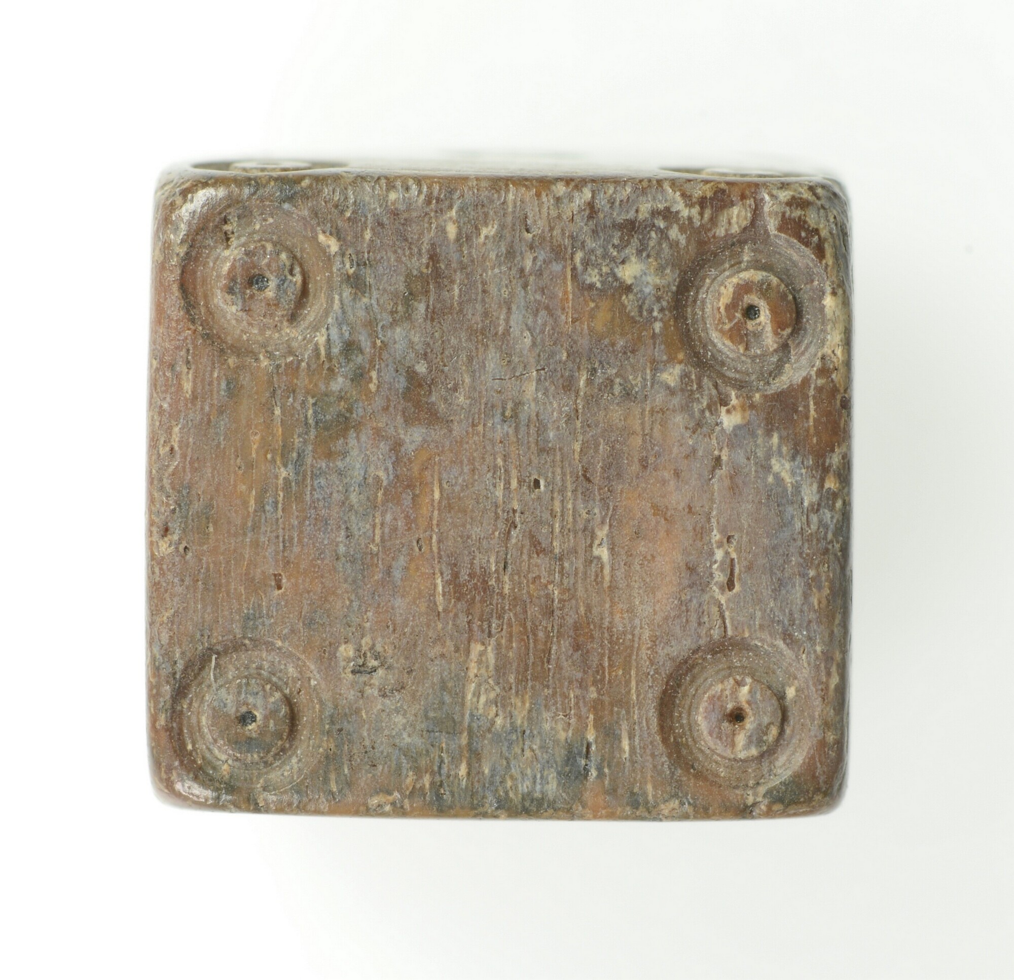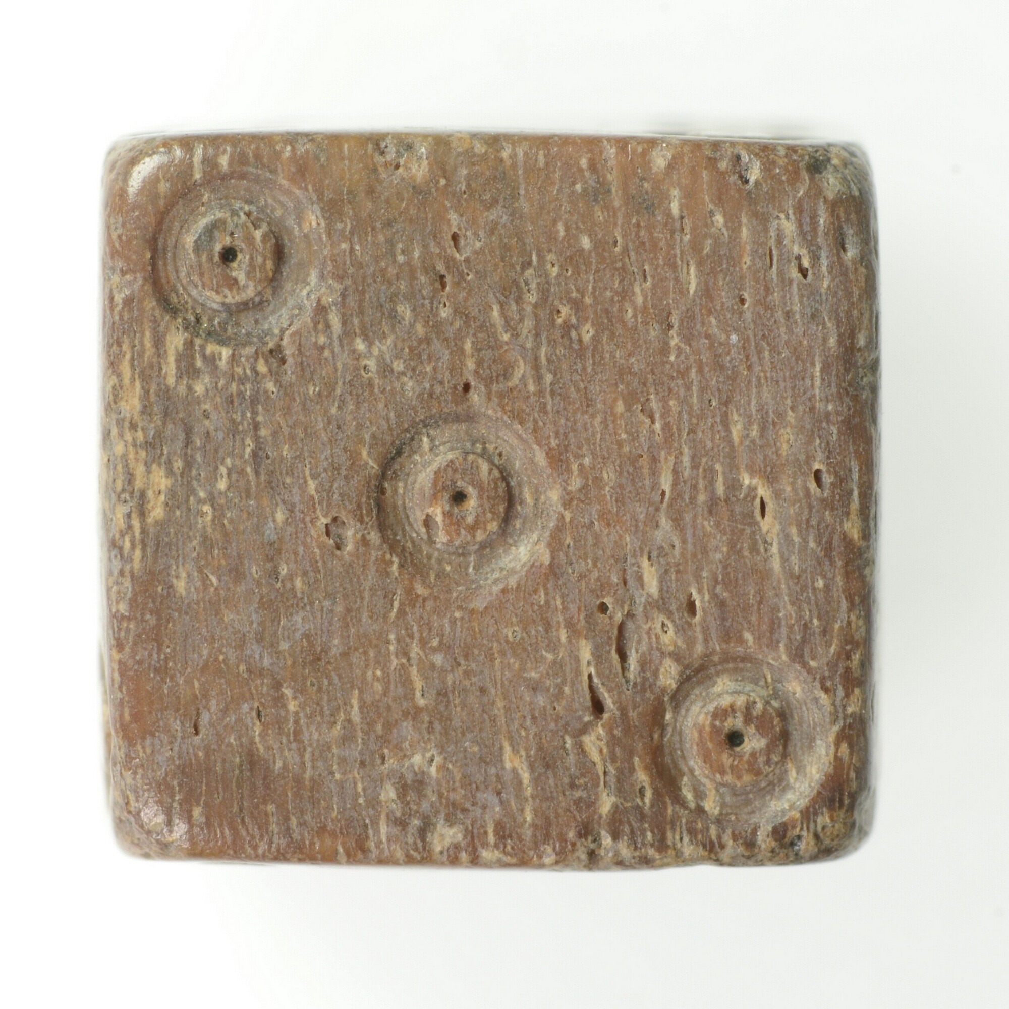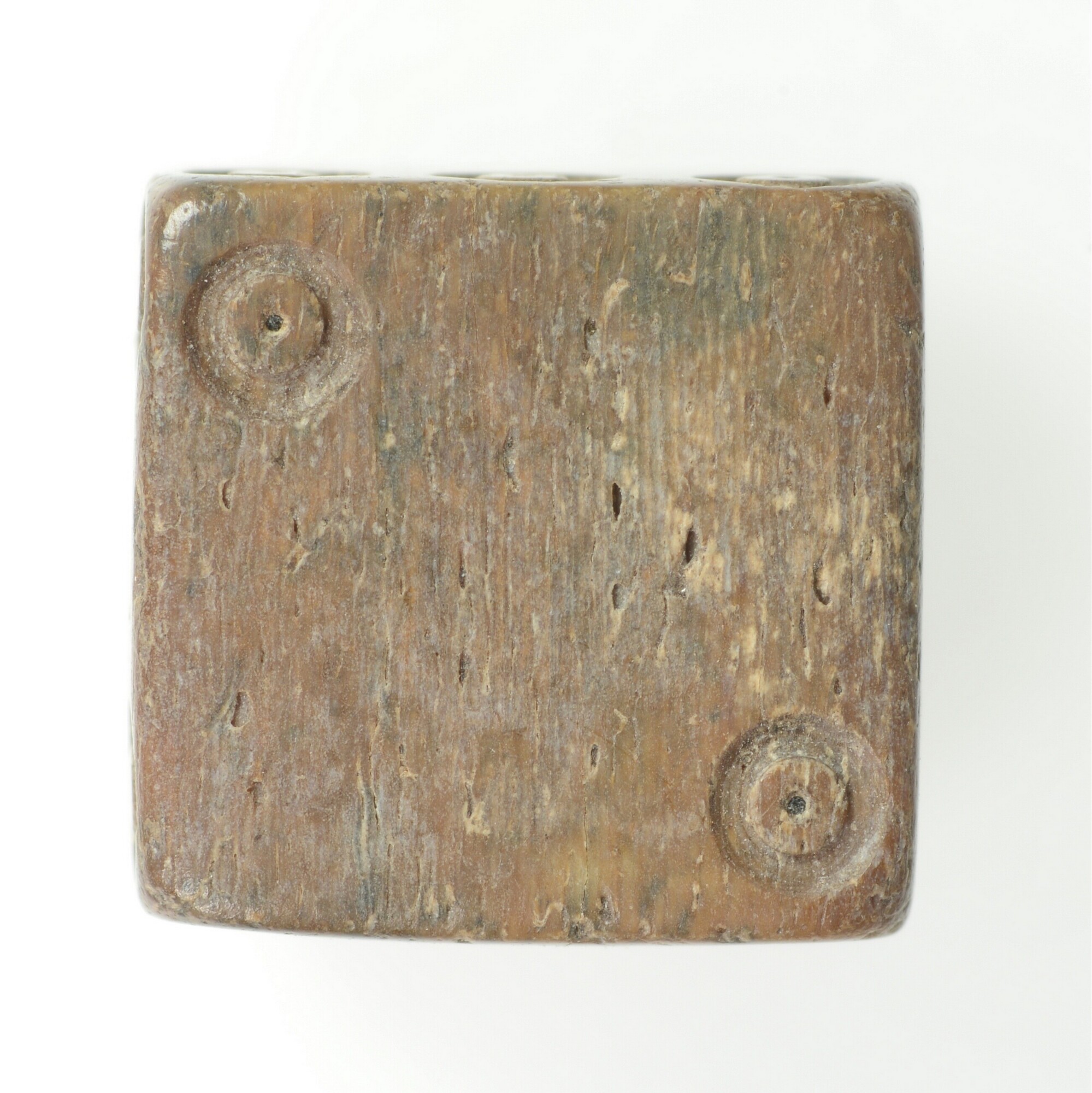 Dobbelsteen; waarde aanduiding met puntcirkel-versiering aangebracht. De ogen 1-2, 3-4 en 5-6 liggen tegenover elkaar