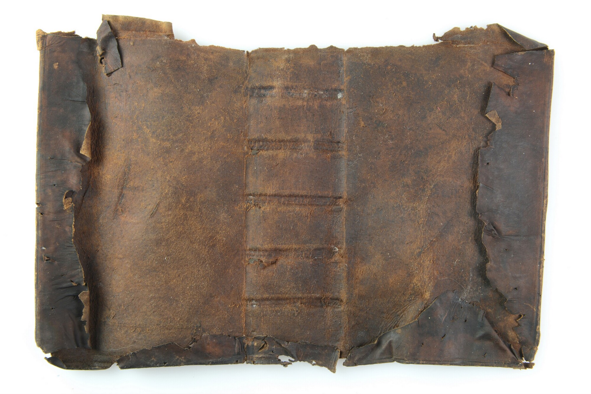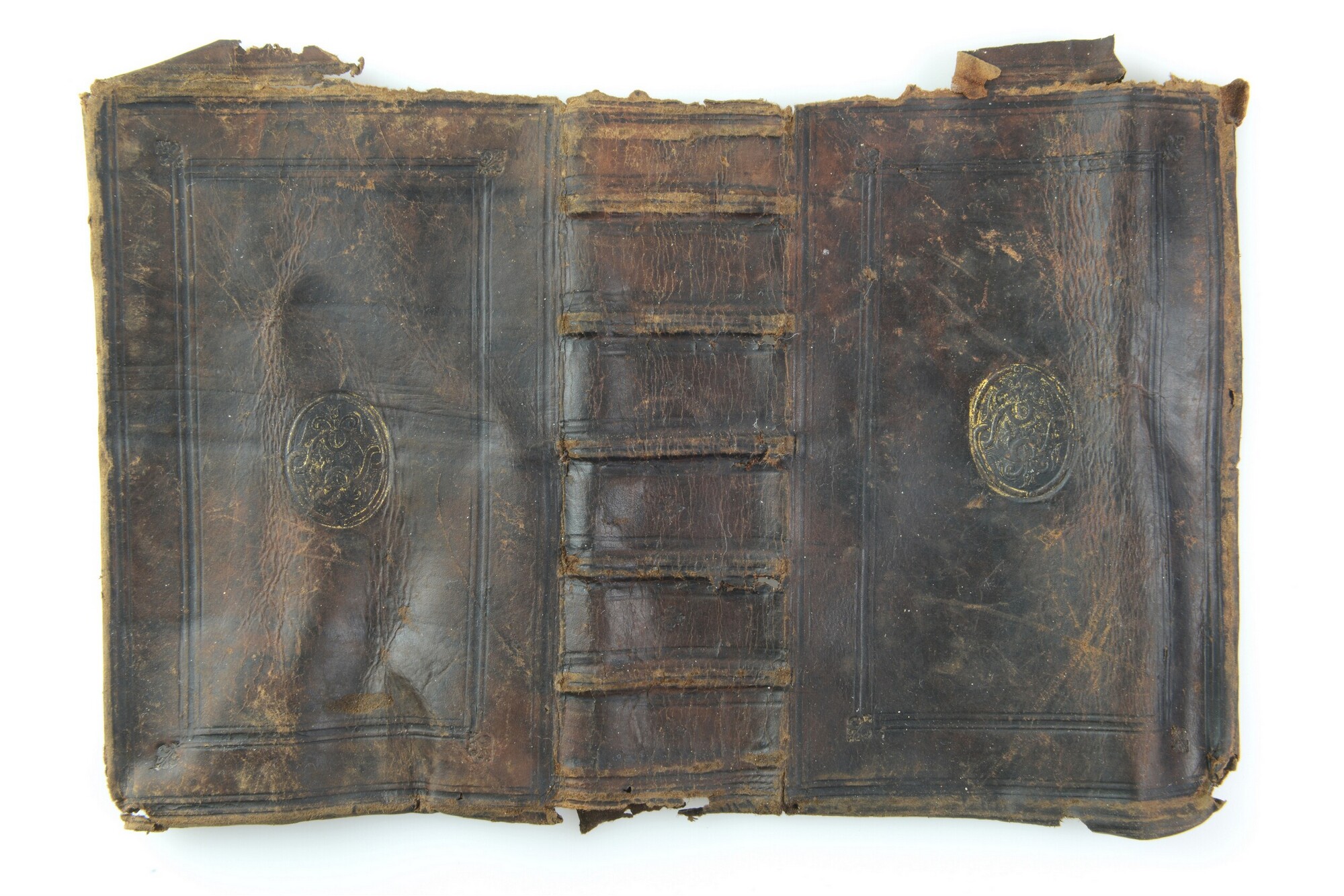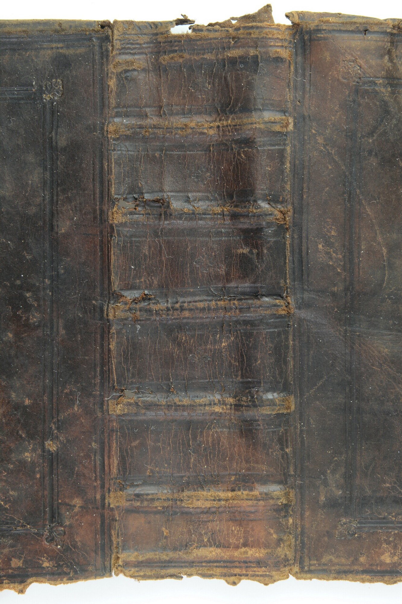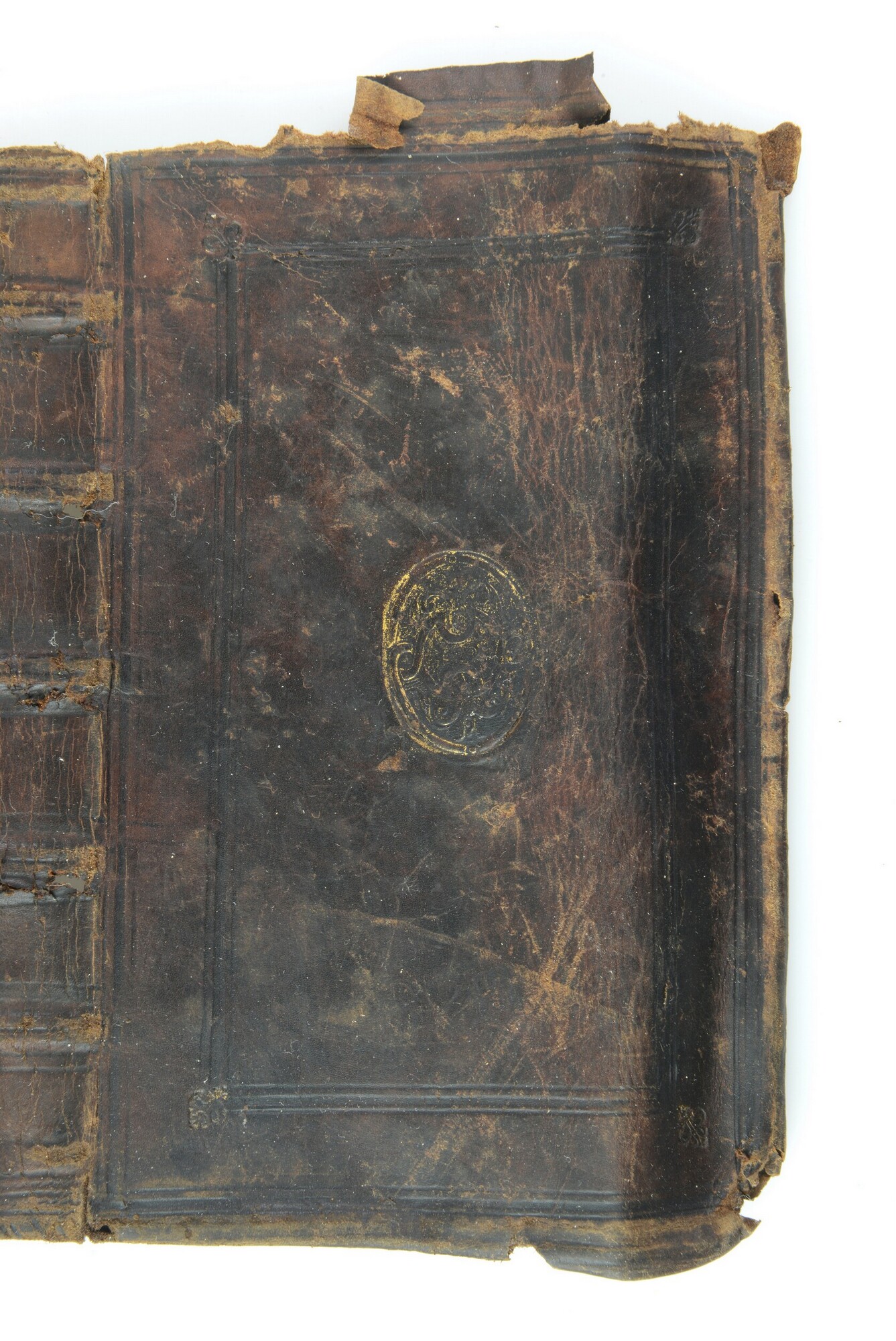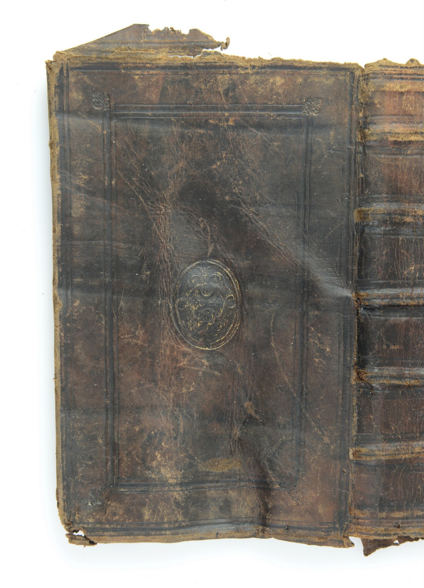 Bekleding van een boekband, met twee kaders van ieder drie blindgedrukte lijnen, met een bloemmotief stempel in de buitenste hoeken, een centraal plaatstempel in goud van linten en met een gearceerde achtergrond op voor- en achterplat.