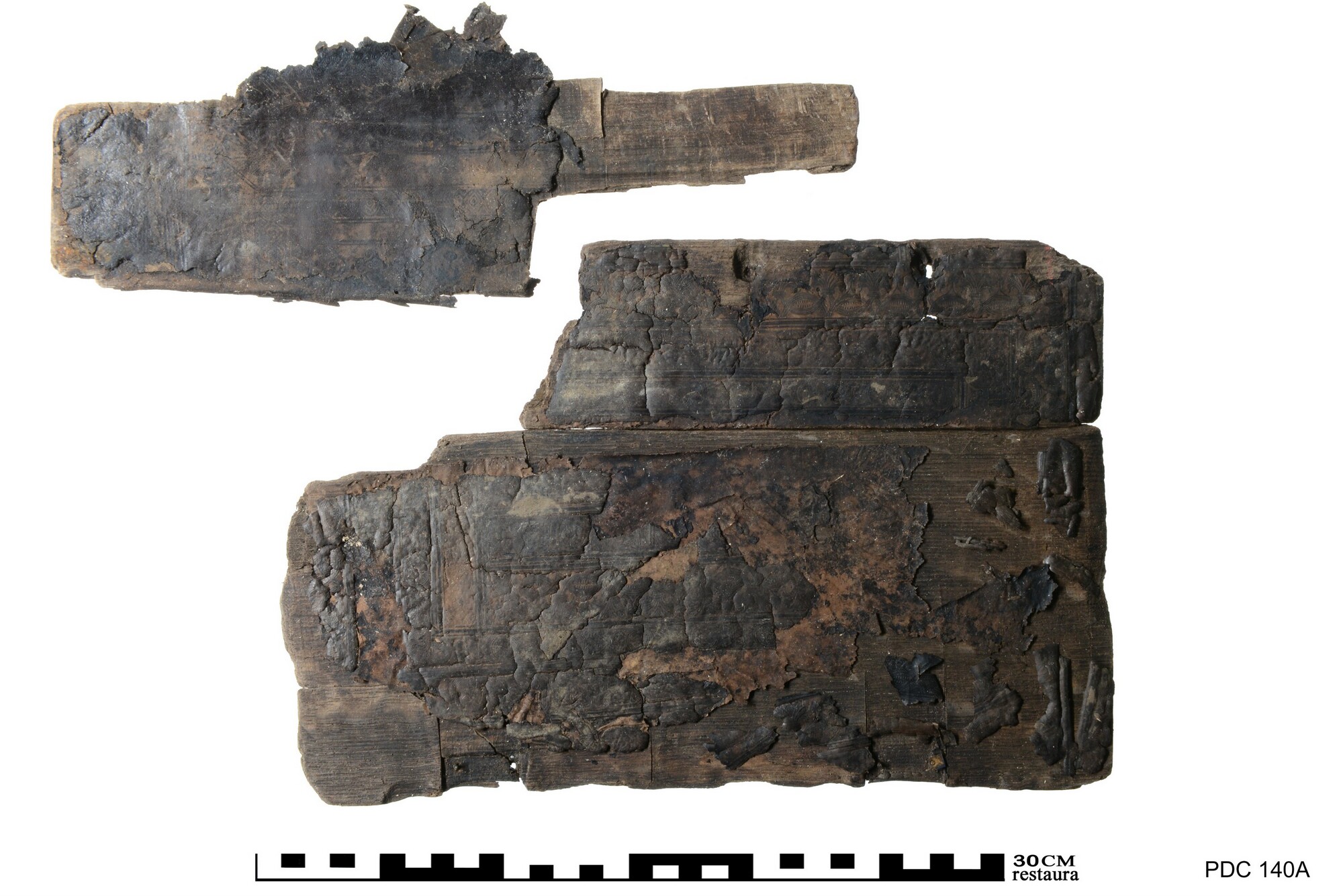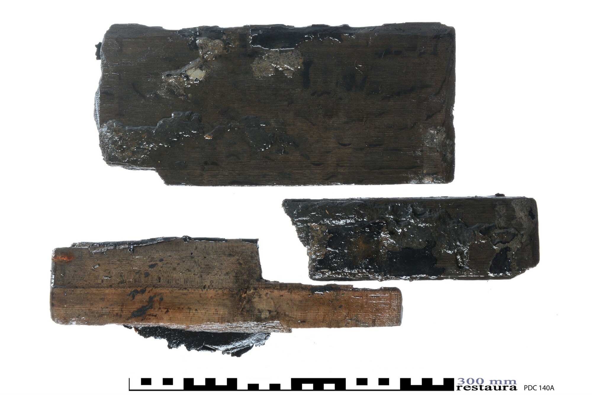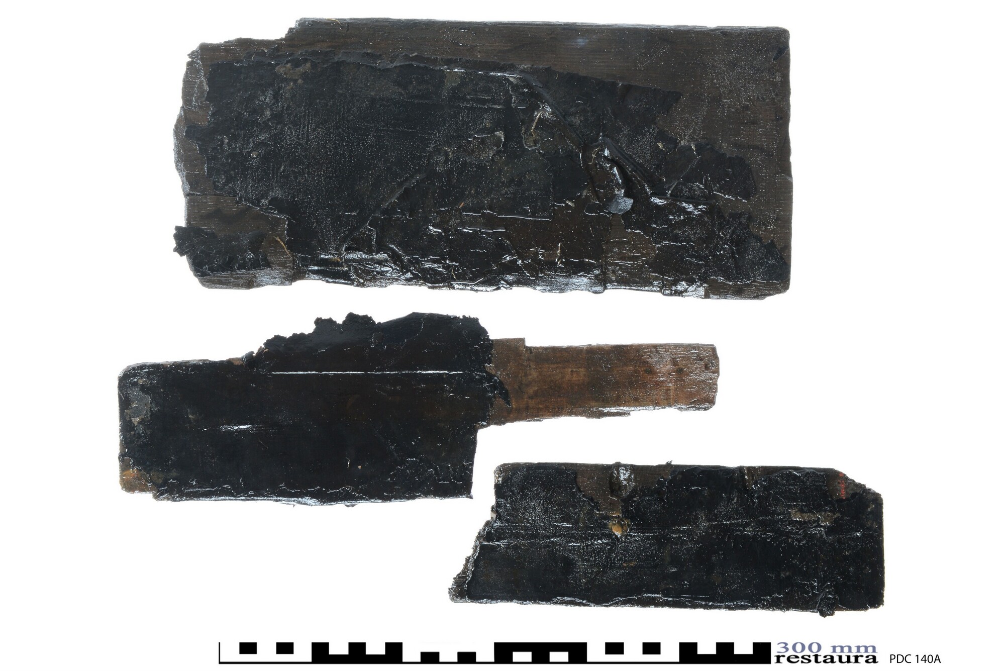 Drie fragmenten (1: 32.1 x 12.0 cm, 2: 23.0 x 7.7 cm, 3: ?? cm) van leer op houten borden met sporen van boeksluitingen en beslag.