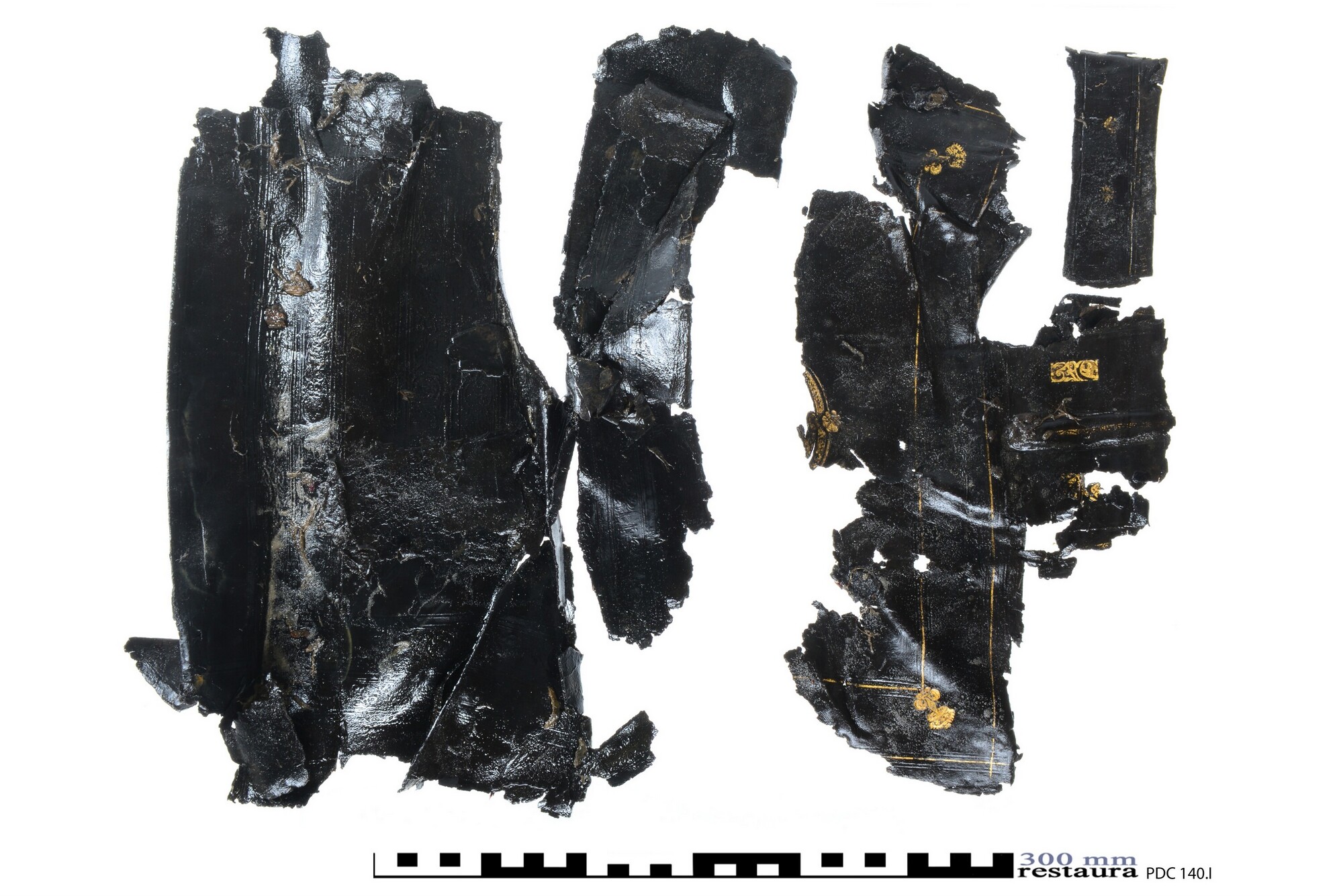 Gedeelte van het achterplat van een boekband bekleding van leer, vermoedelijk om kartonnen platten gezeten. Met rolwerk versierd plat met rollen van vrouwen met hoedjes.