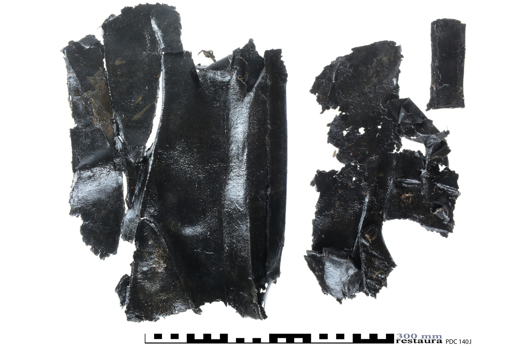 Sporen van beslag: Een paar gaten voor de voorsnede voor de linten of de leren veters van een striksluiting.