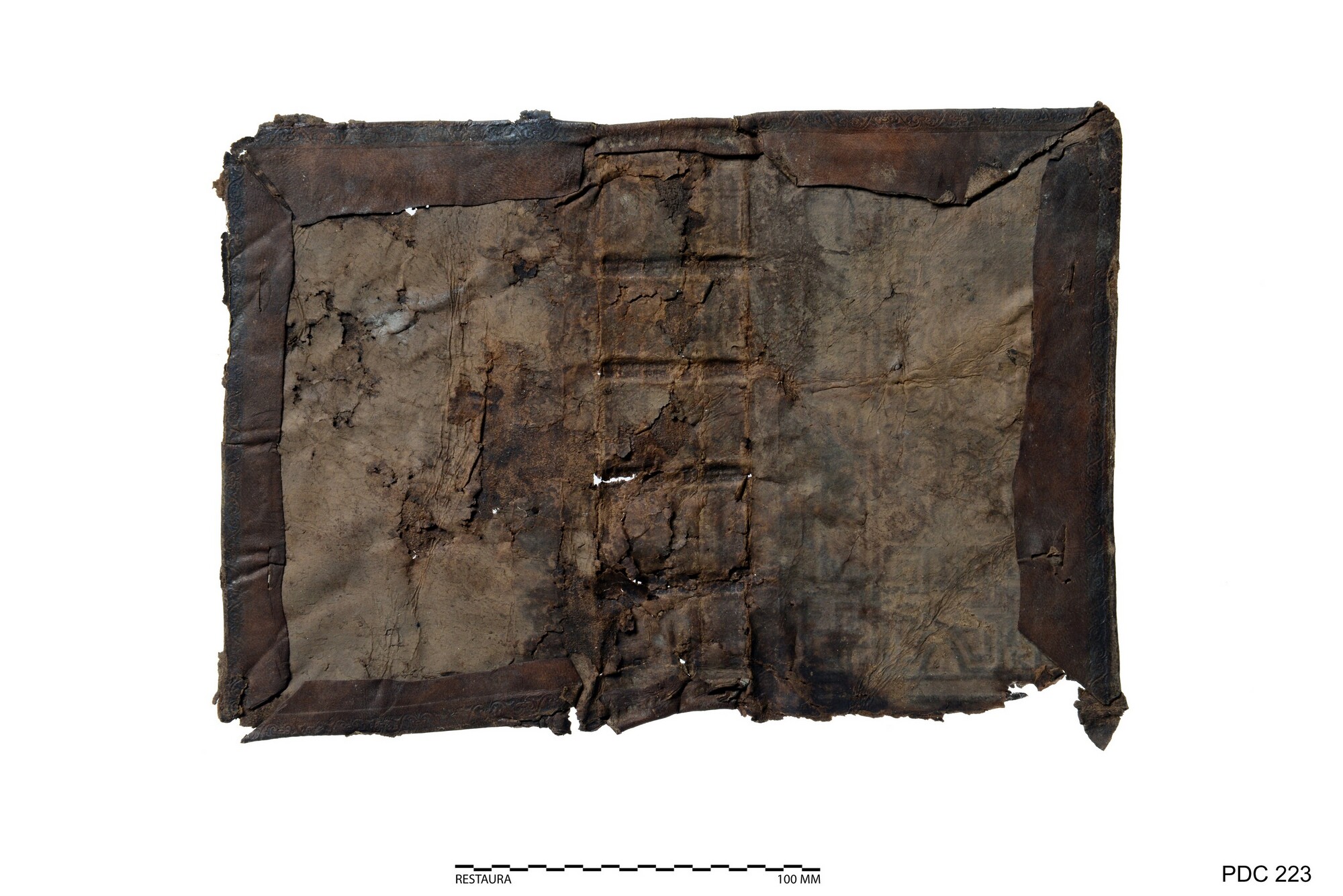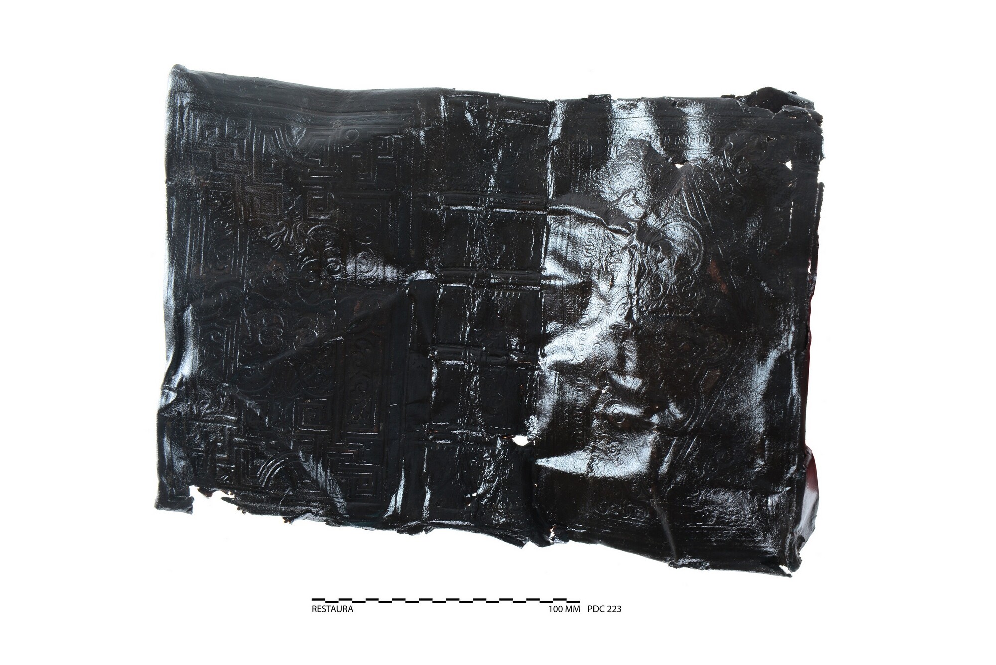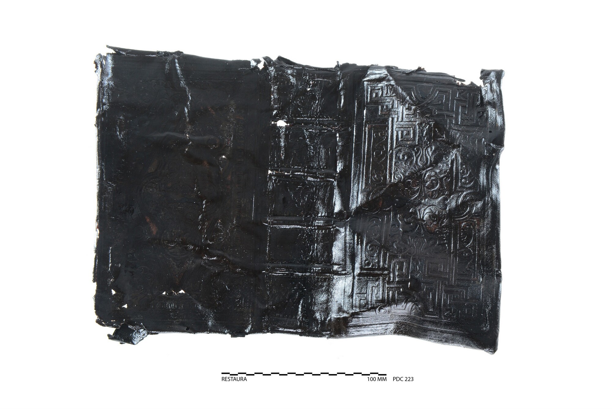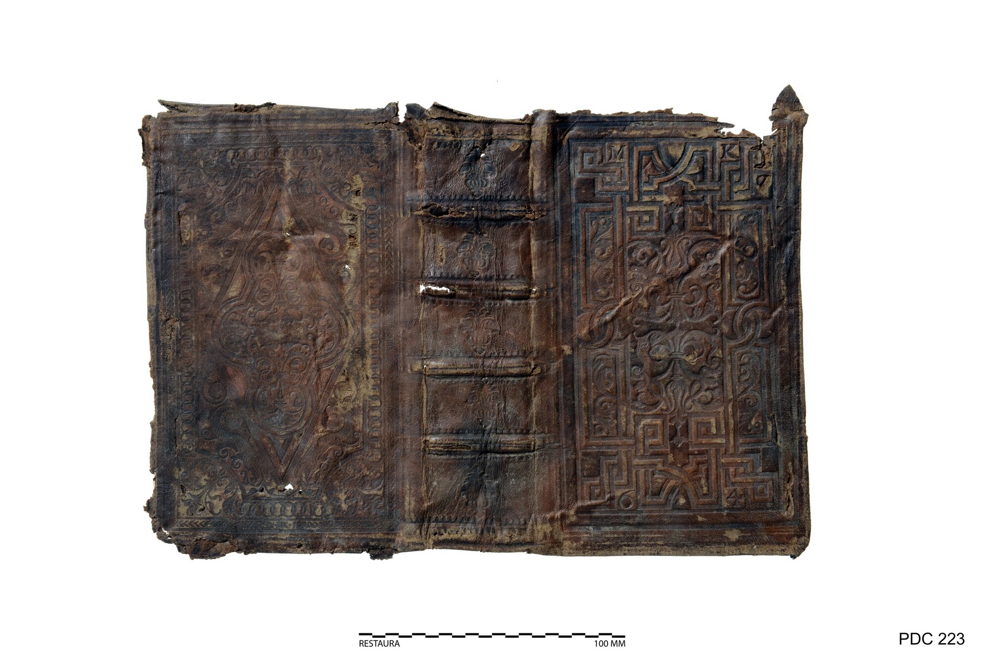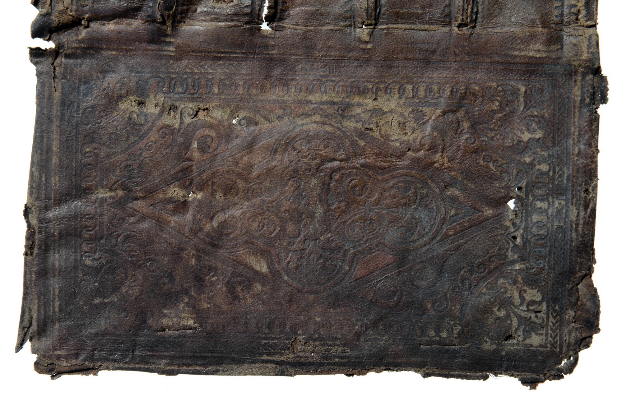 Bekleding van een boekband met een paneel bestempeling in blinddruk en initialen en nummers op het voorplat. Op het achterplat is een ruitvormige bestempeling in blinddruk. Het lijkt of de boekband gekleurd is geweest.