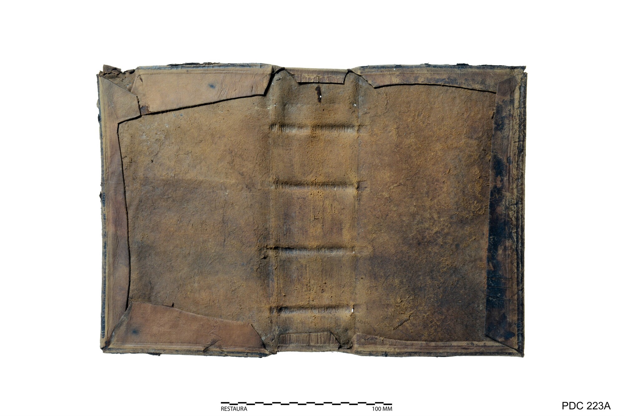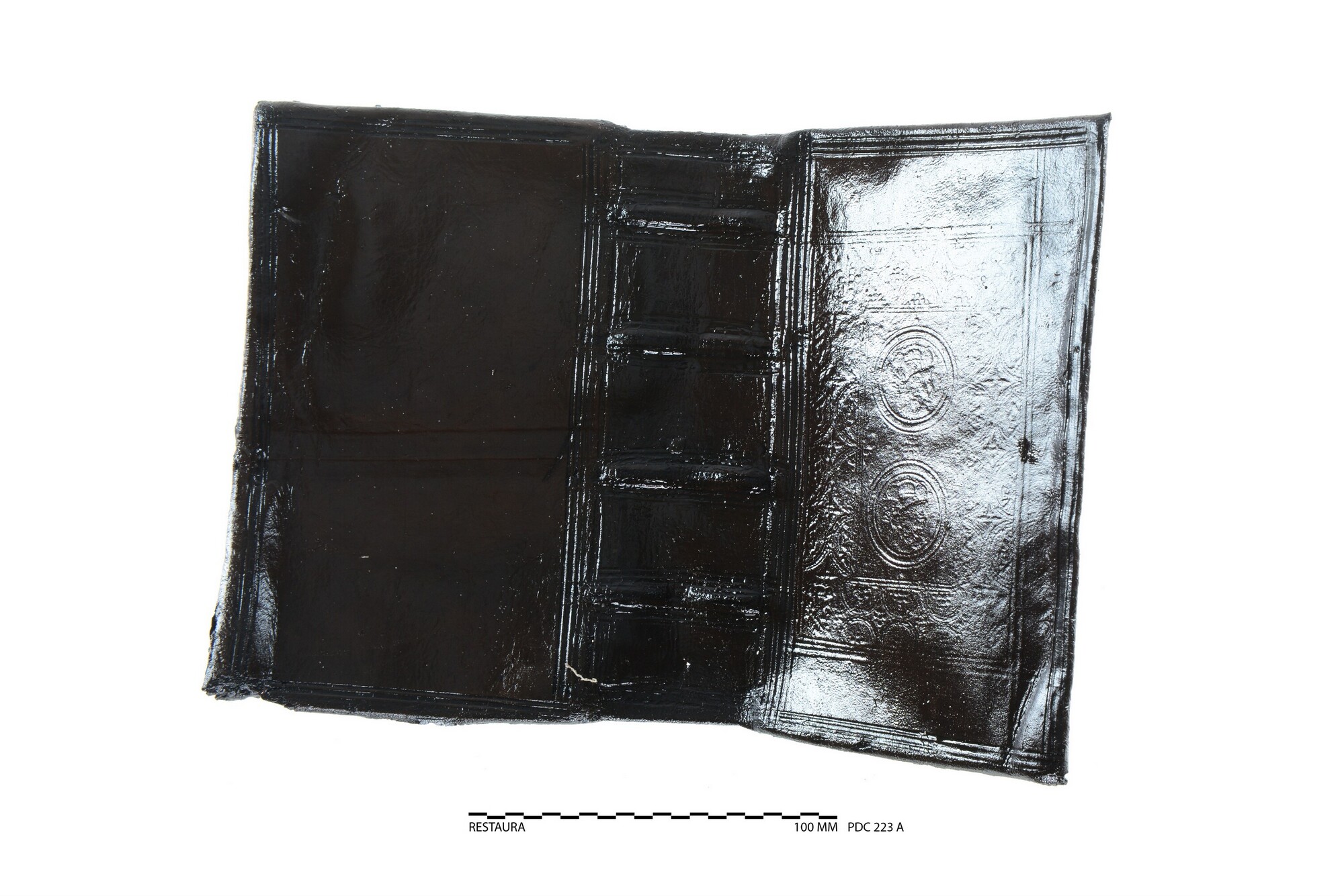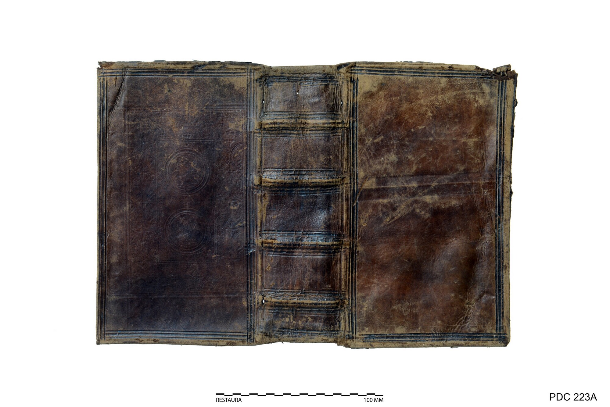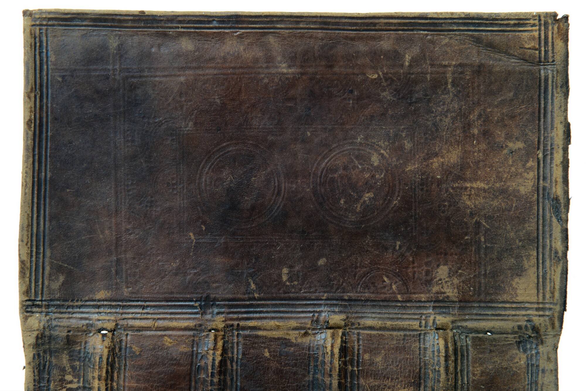 Simpele leren bandbekleding, waarschijnlijk over kartonnen platten, versierd met een kader langs de buitenrand van drie lijnen in blinddruk. Op de inslagen willekeurige afdrukken, het lijkt wel op stro waarmee de boeken mogelijk verpakt zijn geweest. Ook is er op het voorplat de afdruk van 6241-019 achtergelaten. Ze stonden of lagen ondersteboven t.o.v. elkaar.