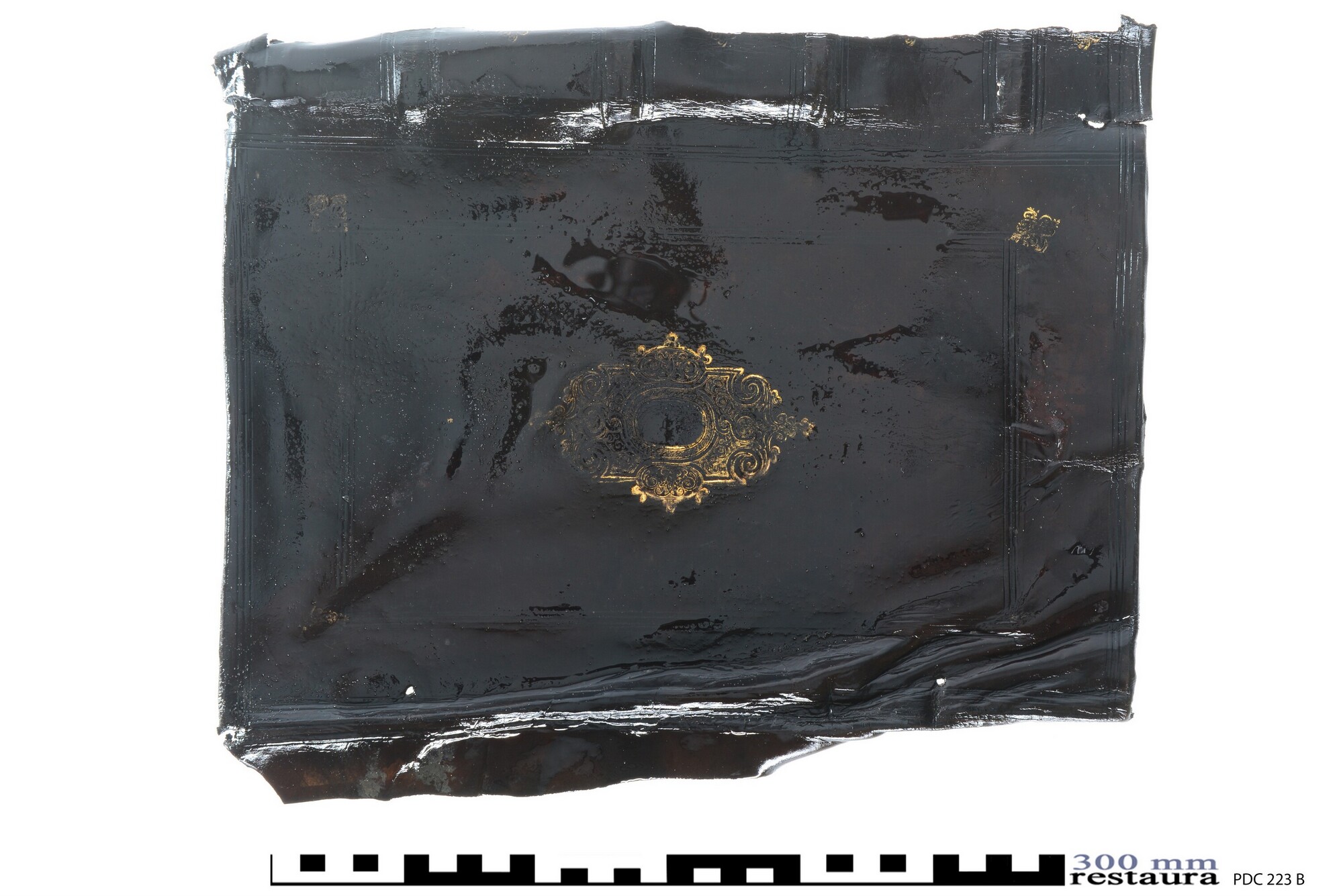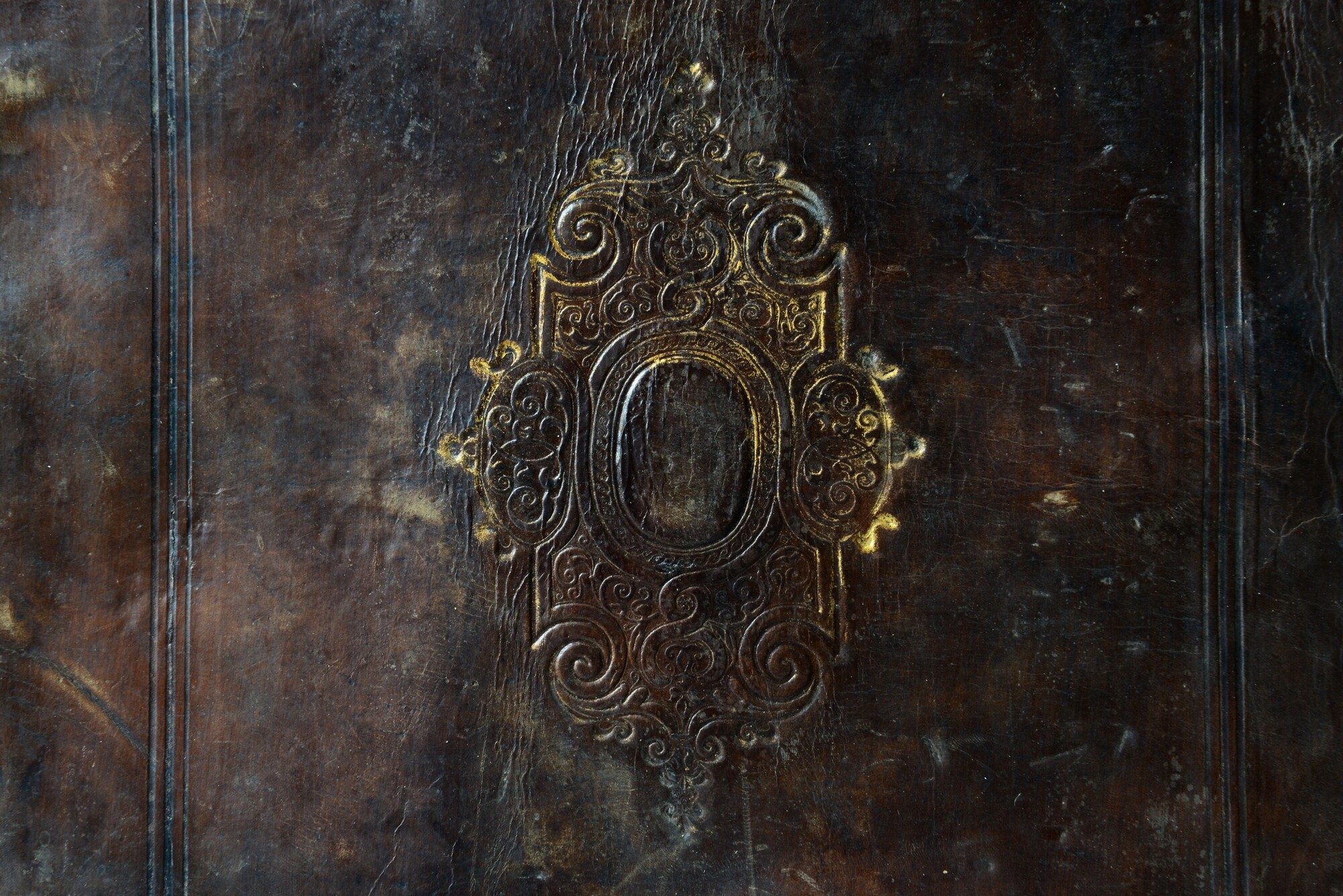 Achterplat van roodbruin leren bekleding van een boekband, vermoedelijk over kartonnen bordkernen met een centraal plaatstempel in goud op beide platten. Het voorplat van deze boekband is 6241-020. Mooi duur leer voor deze wat modernere boeken van deze eigenaar.