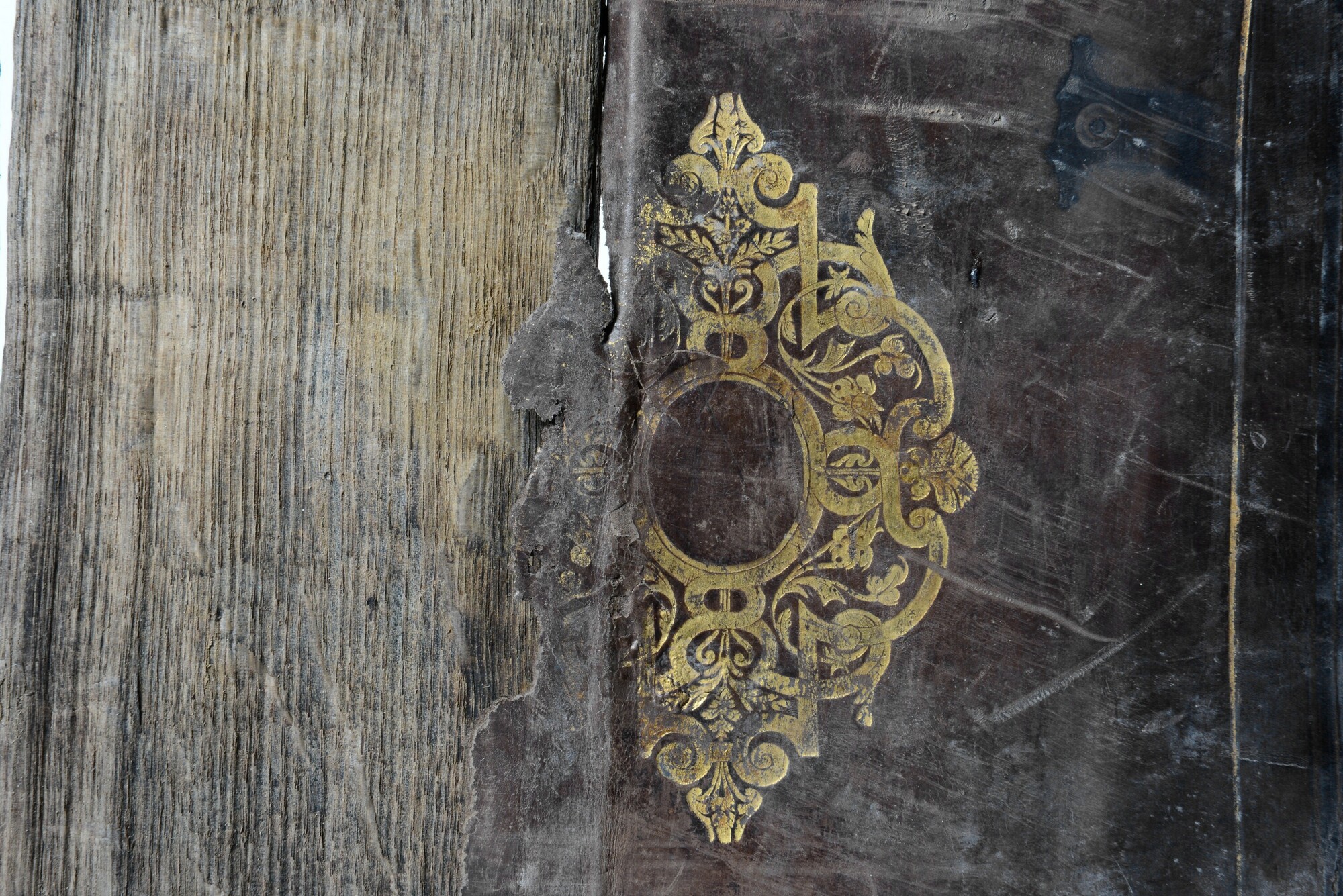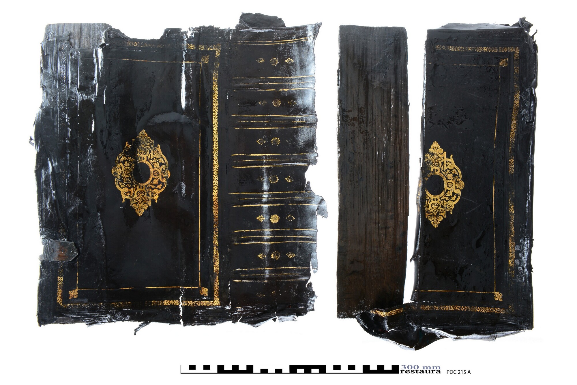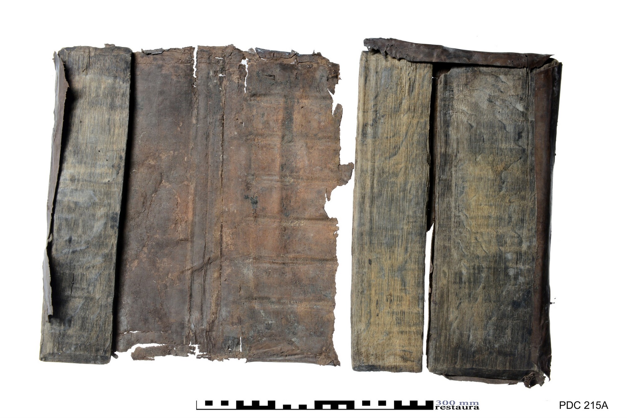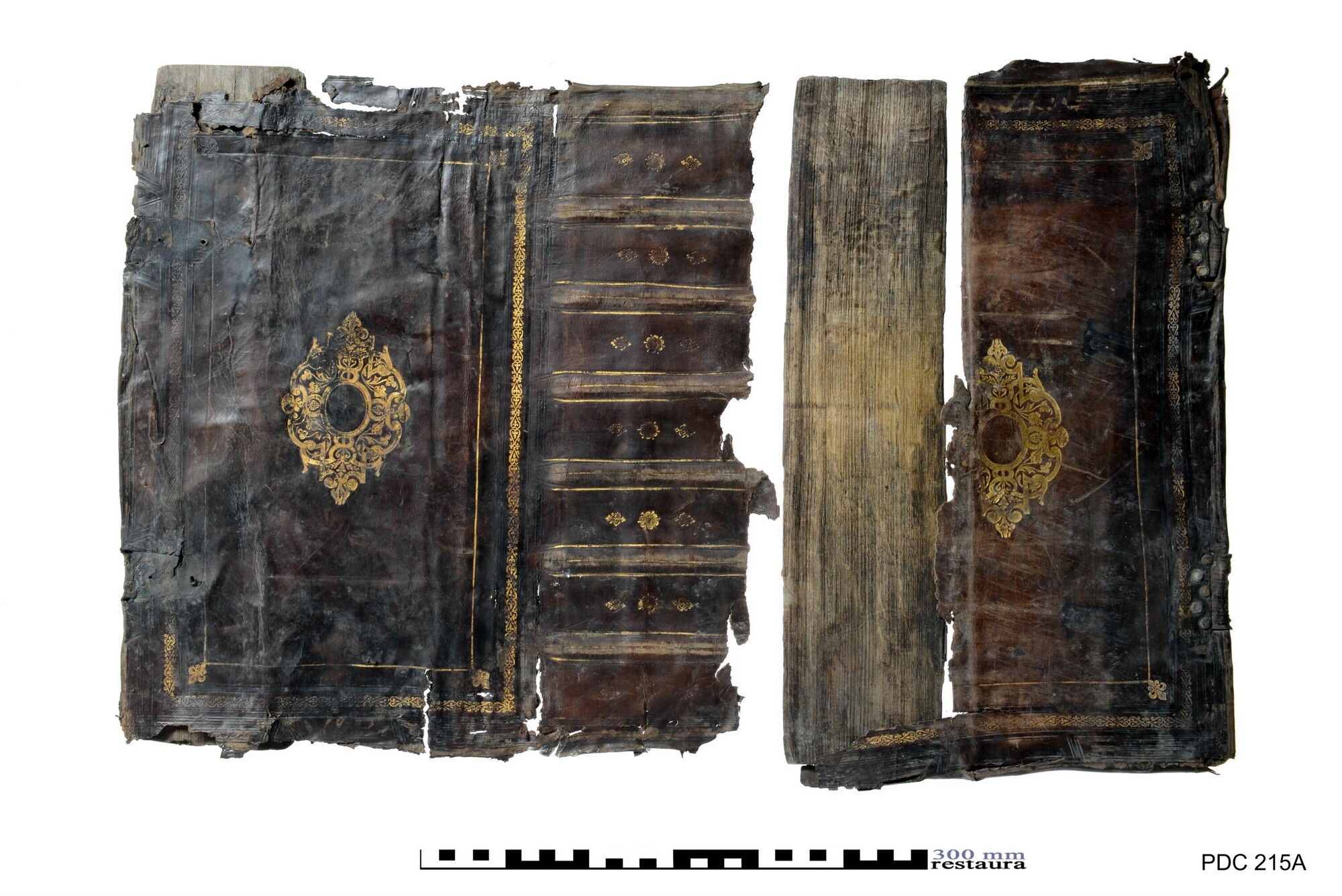 Grote boekband met gedeelte van de eikenhouten bordkernen nog bewaard en de leren bekleding, met resten van de boeksluitingen. Een klamparm 5372-131 is los bewaard. Een afdruk van de sluitingen van het buurboek (spookboek) staat op het achterplat, de afmetingen van deze sluitingen komen niet overeen met een ander opgedoken boek.