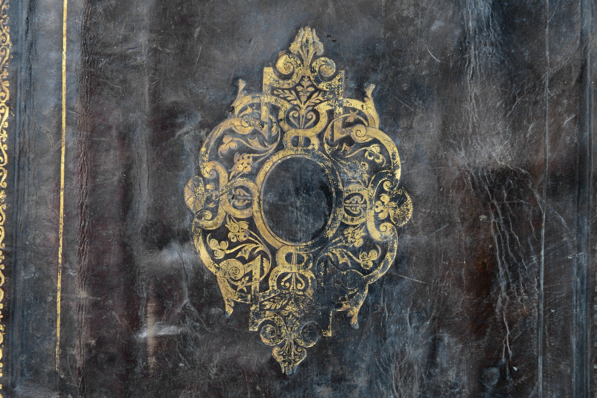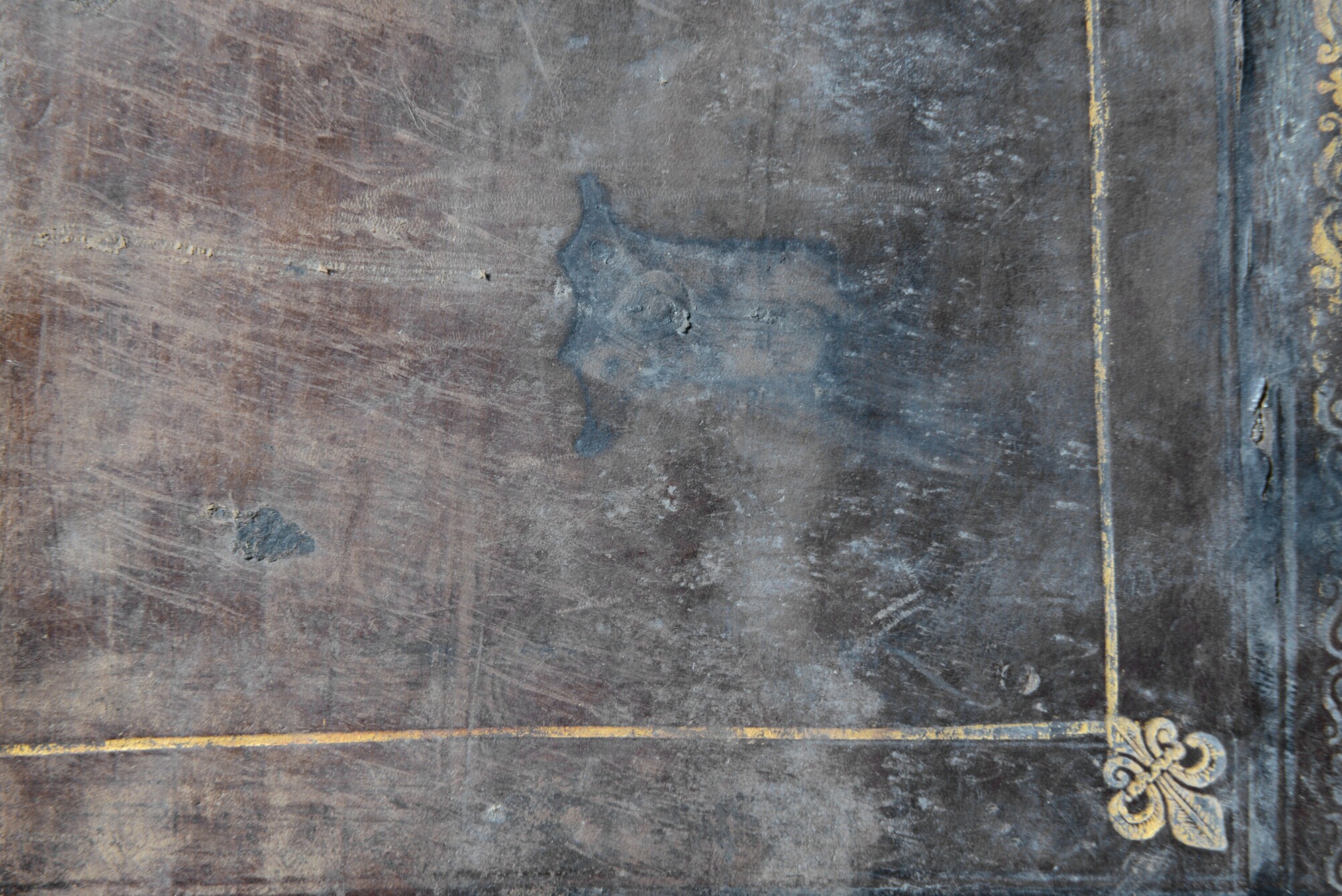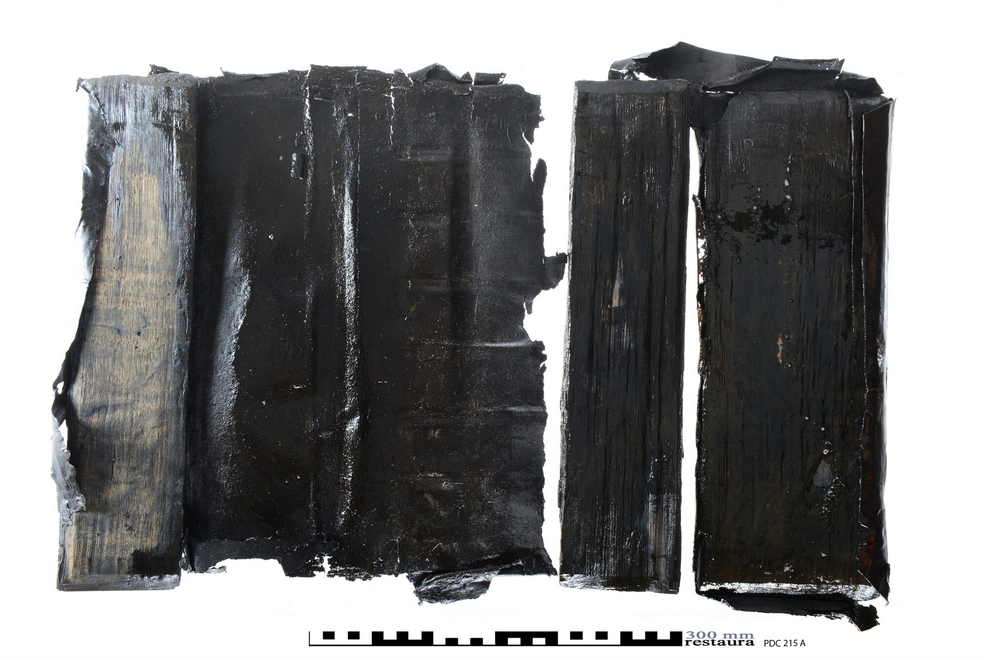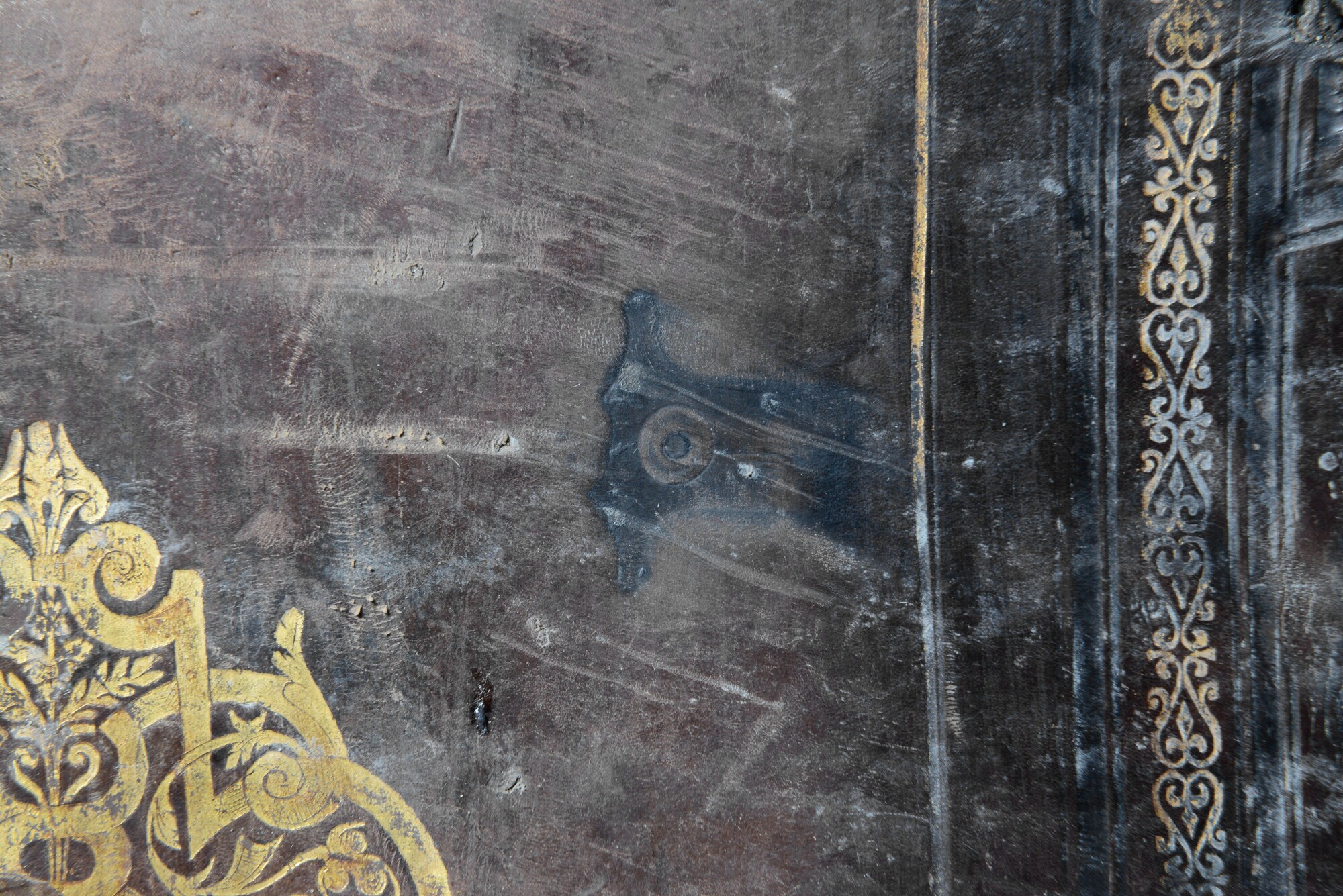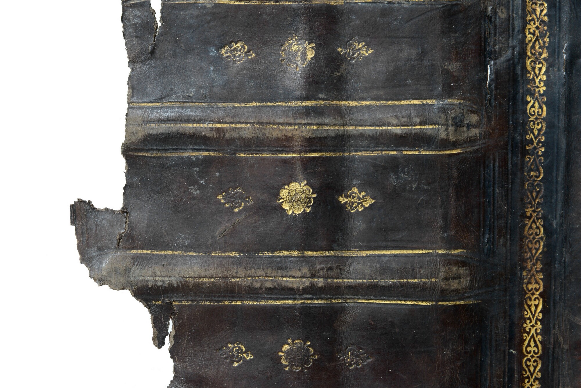 Grote boekband met gedeelte van de eikenhouten bordkernen nog bewaard en de leren bekleding, met resten van de boeksluitingen. Een klamparm 5372-131 is los bewaard. Een afdruk van de sluitingen van het buurboek (spookboek) staat op het achterplat, de afmetingen van deze sluitingen komen niet overeen met een ander opgedoken boek.