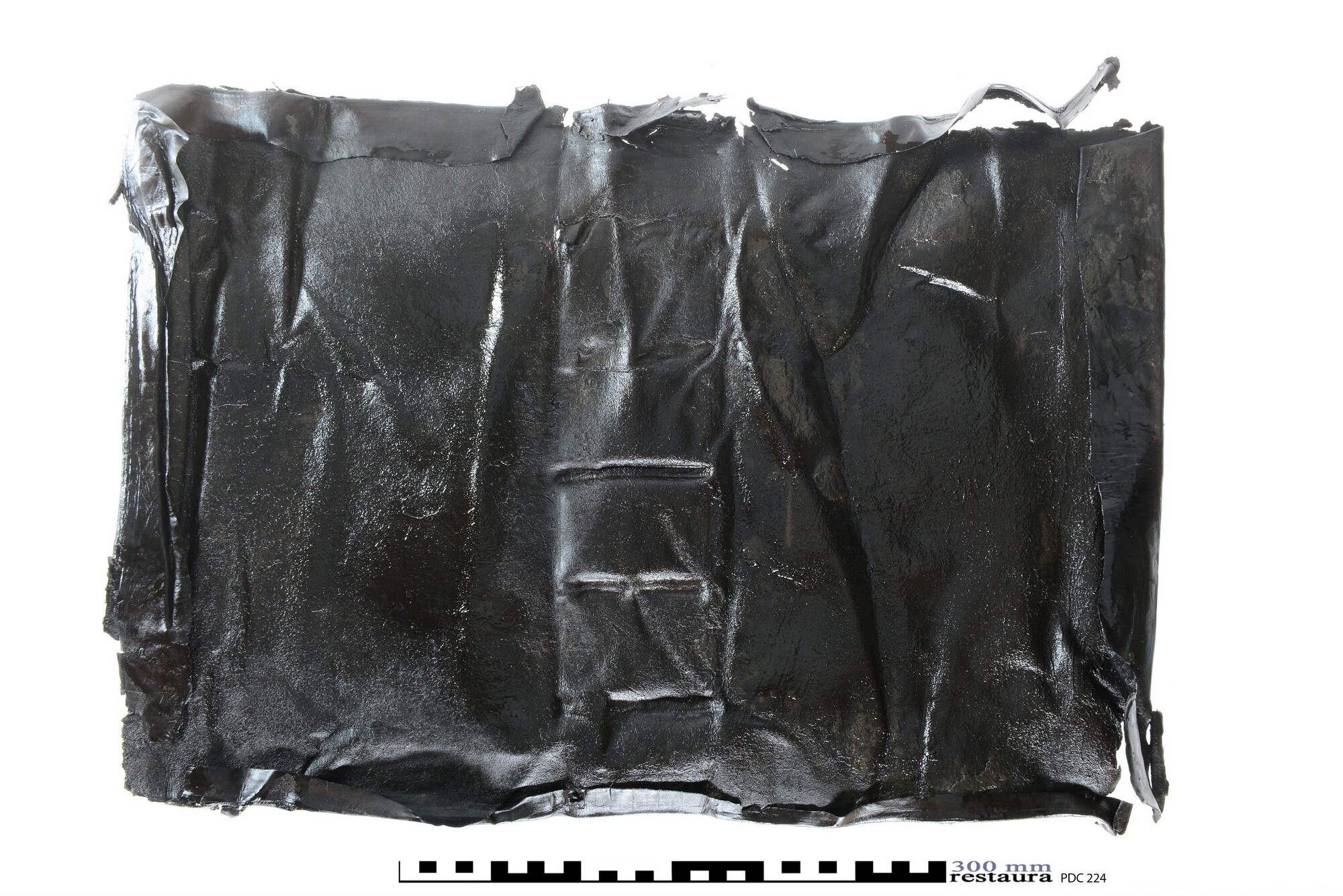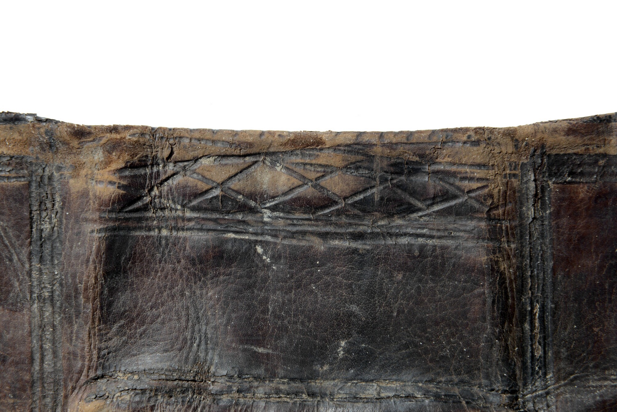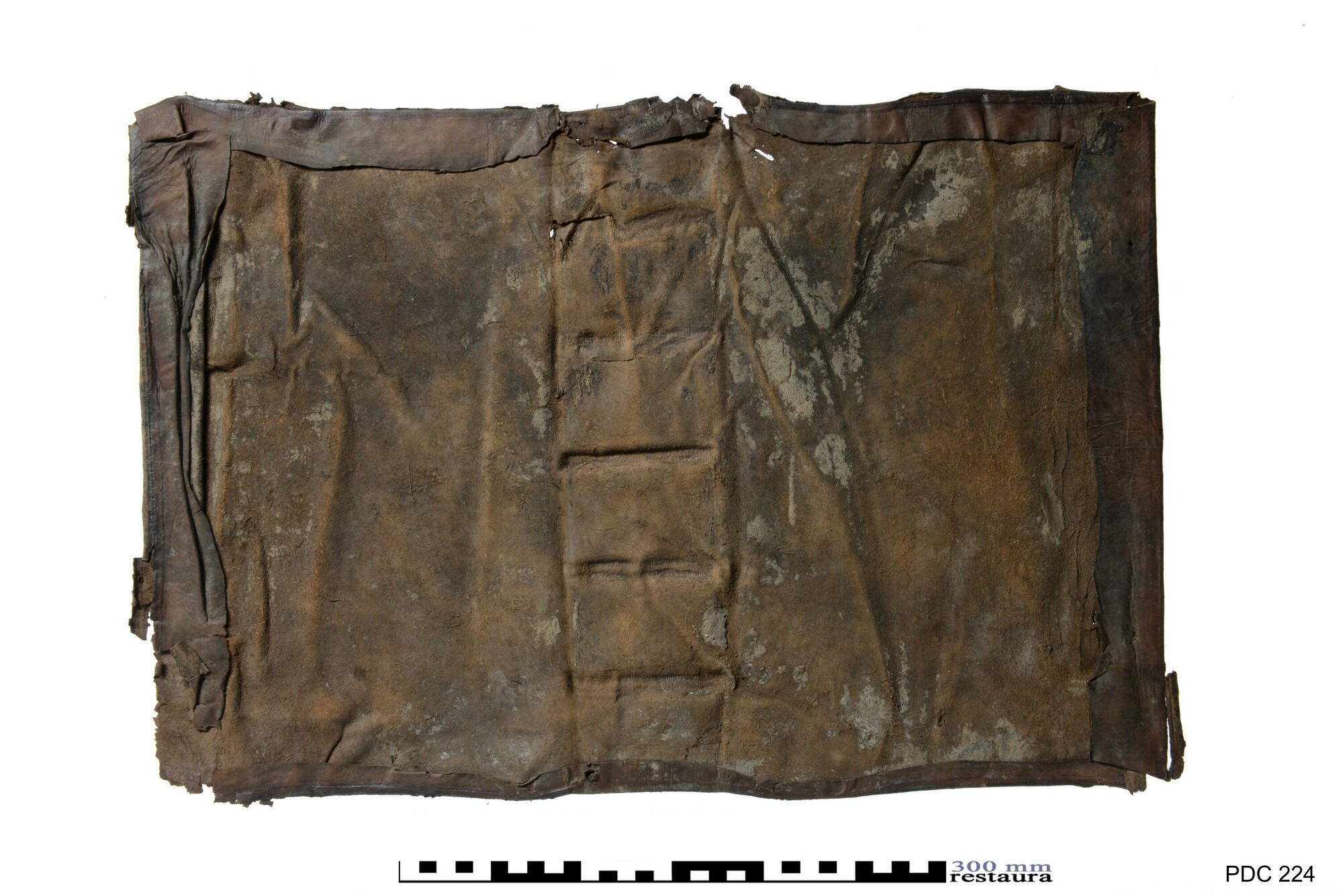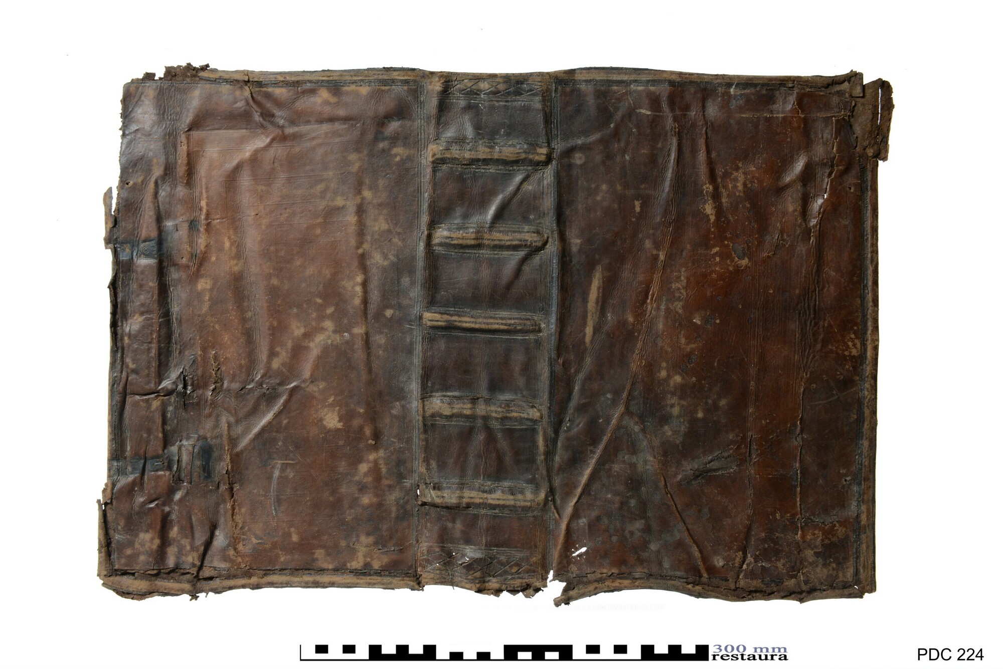 Leren bekleding van een grote boekband, vermoedelik om dikke, kartonnen platten. Twee paar sluitingen van leer of huid veters. Op het achterplat de afdruk van een andere boekband.