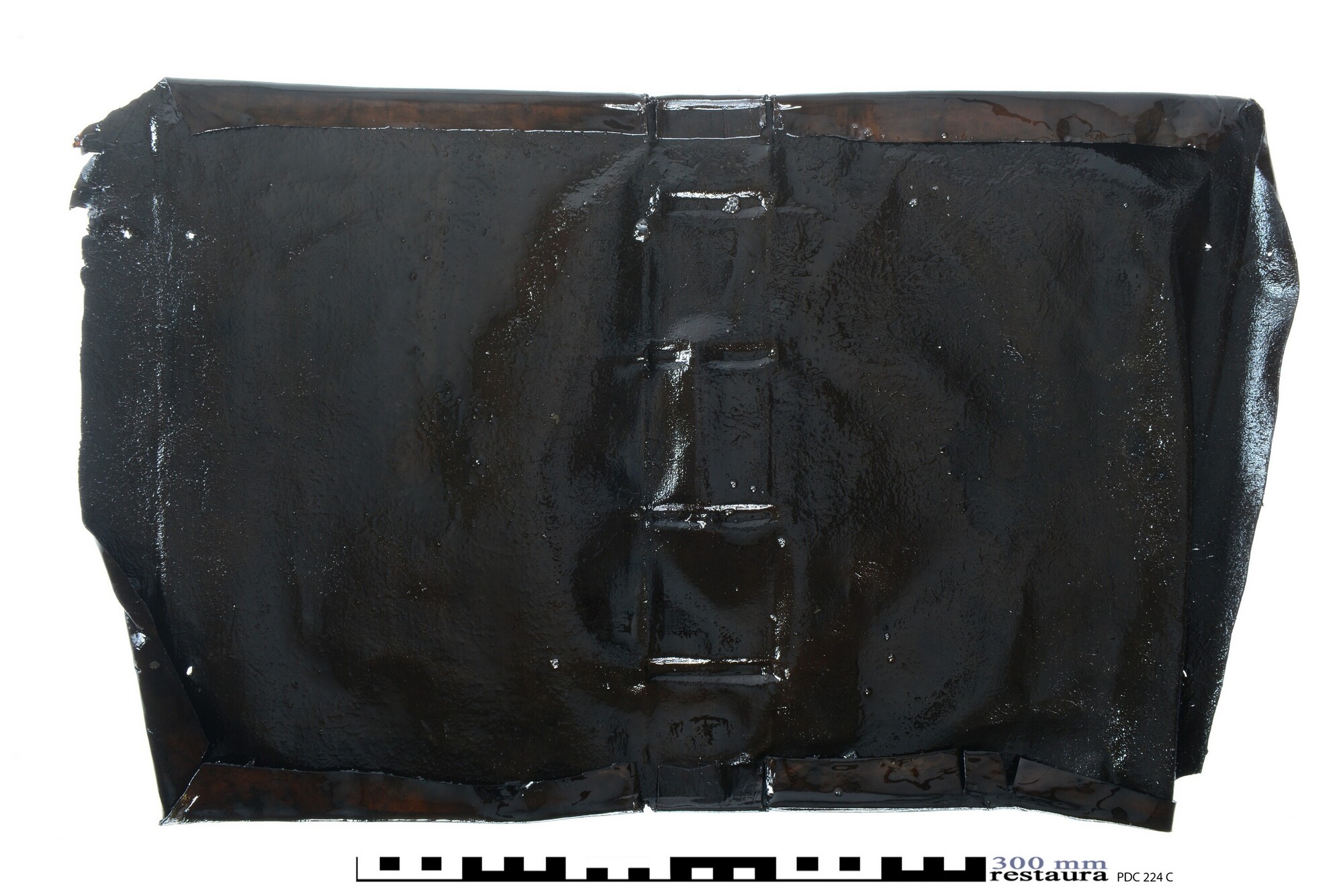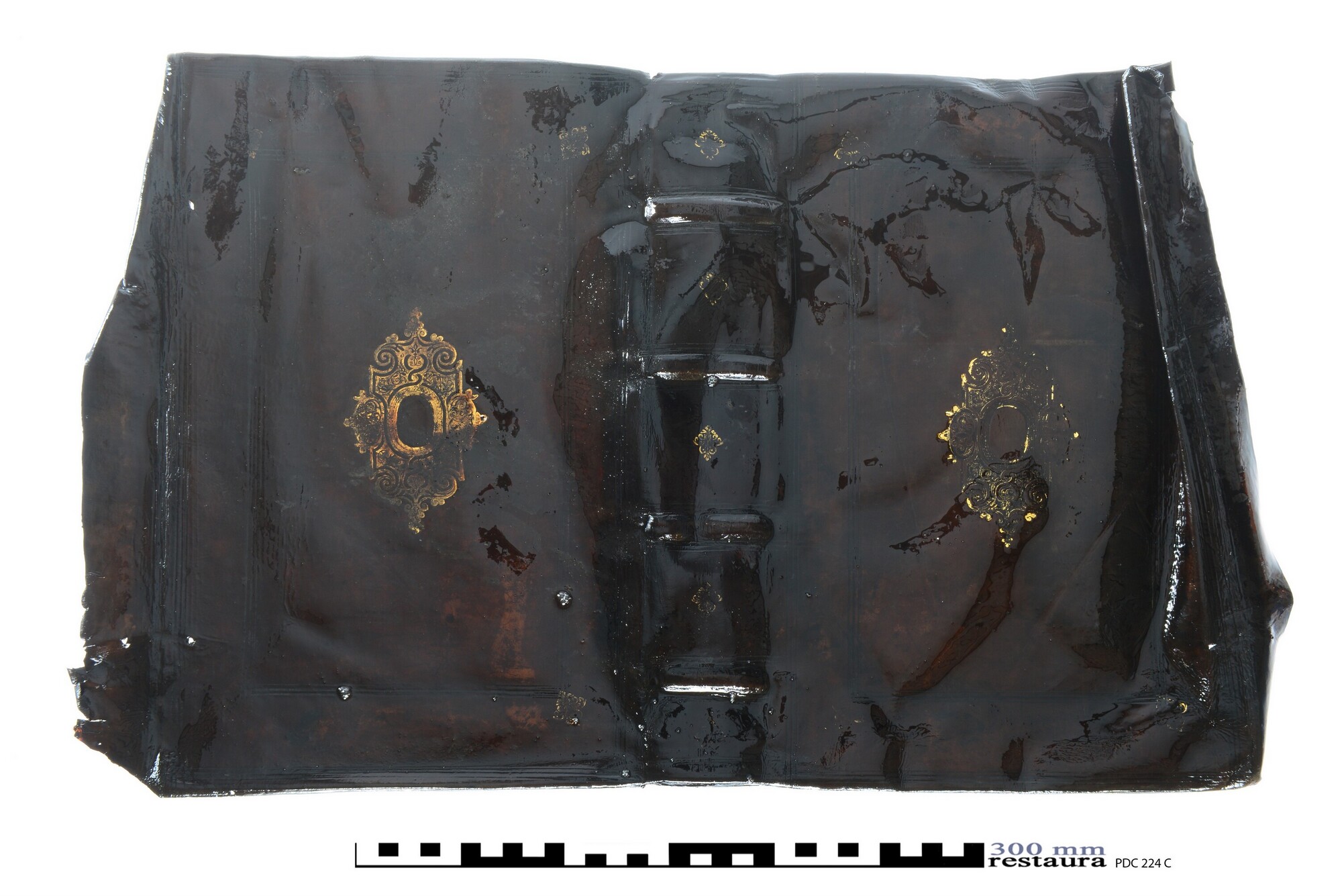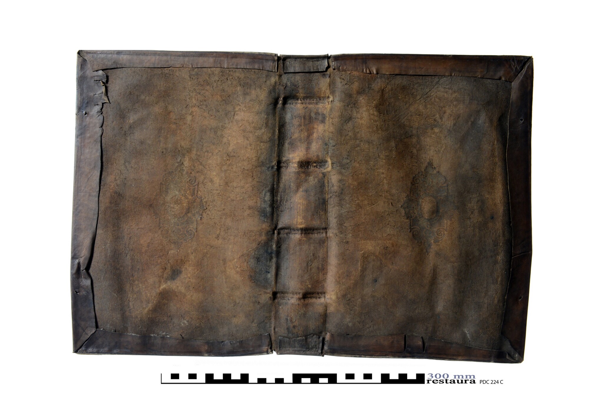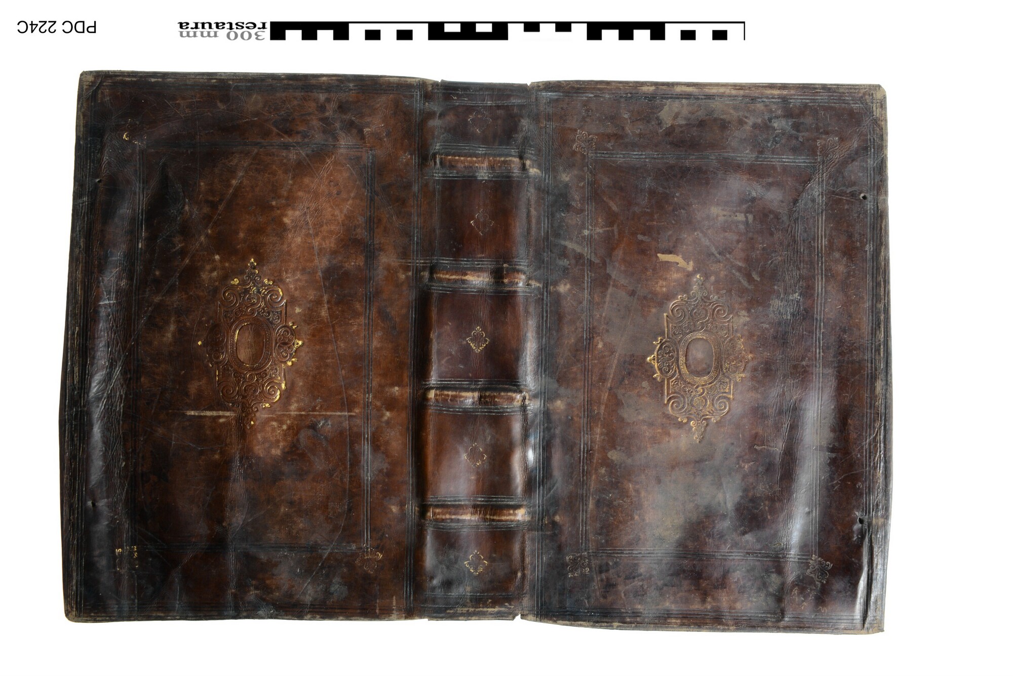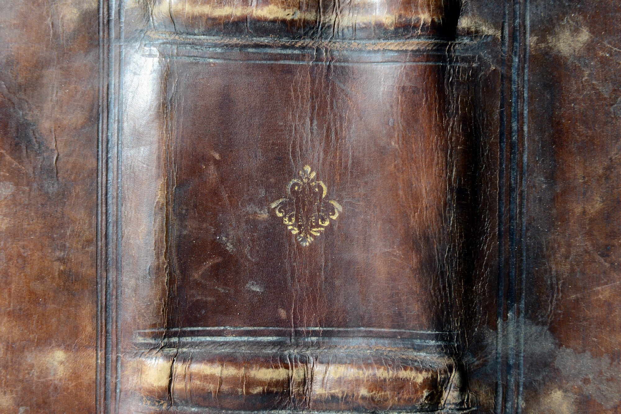 Roodbruine leren bekleding van een boekband, vermoedelijk over kartonnen bordkernen met een centraal plaatstempel in goud op beide platten. Het voorplat van deze boekband is 6241-020. Mooi duur leer voor de wat modernere boeken van deze eigenaar.