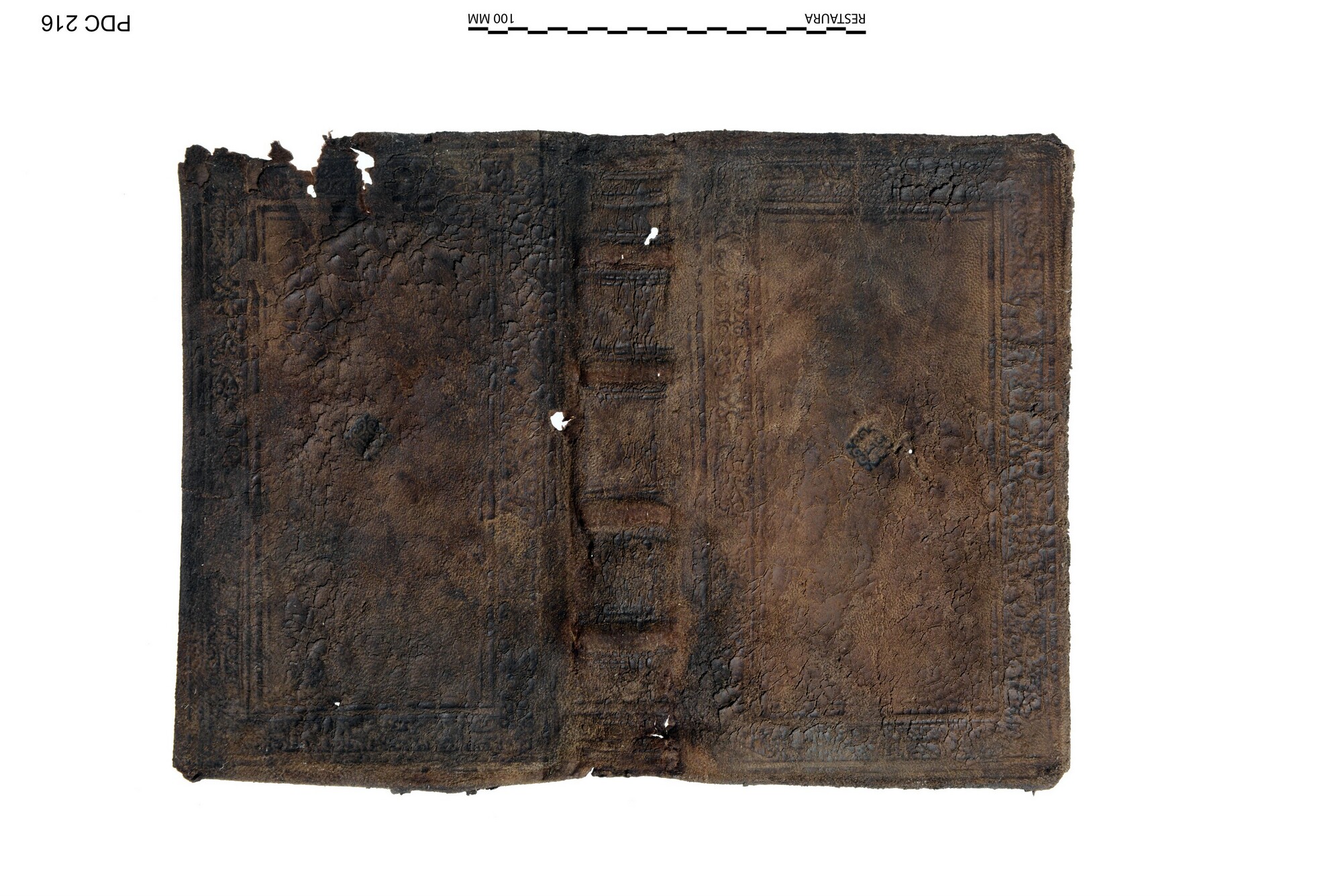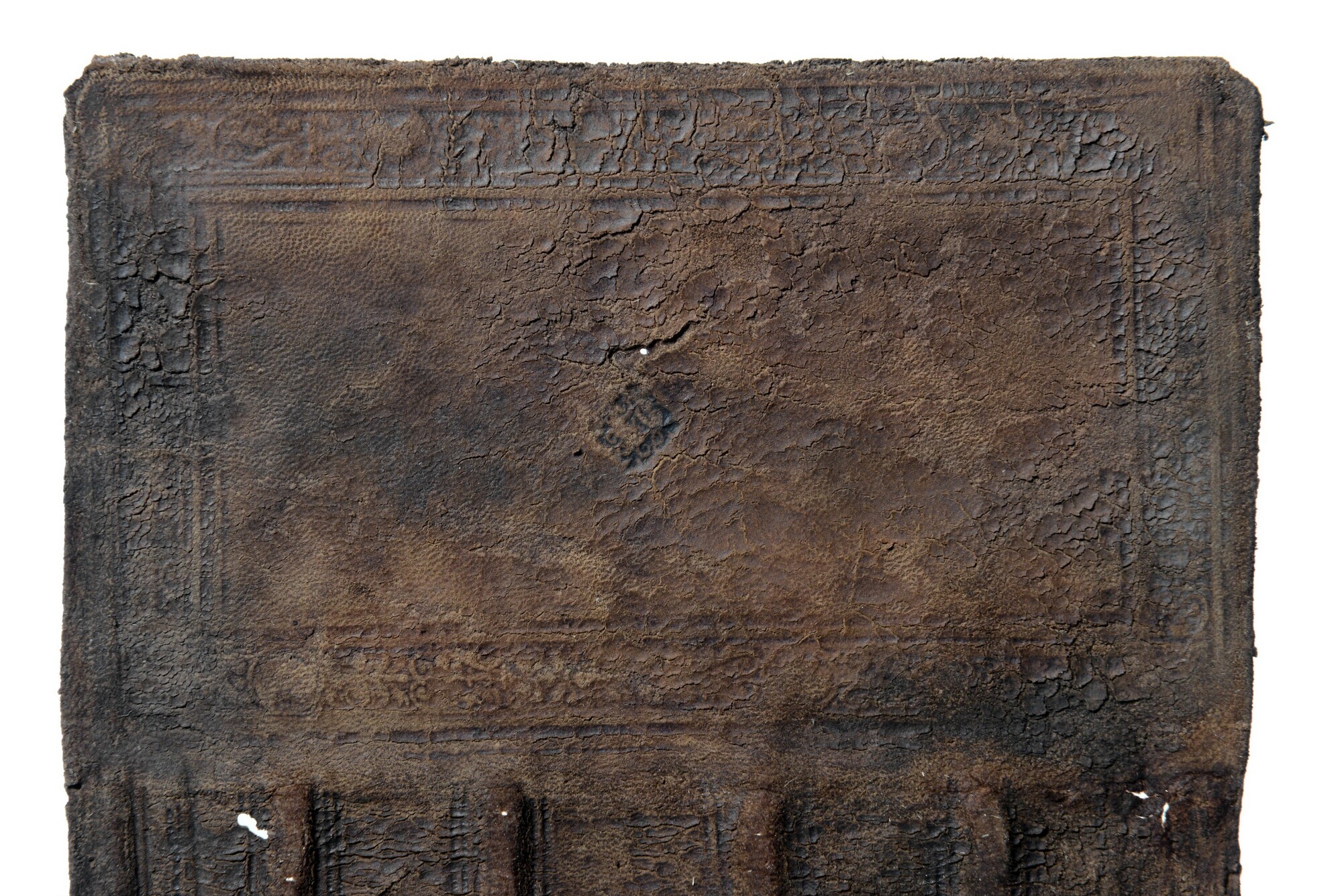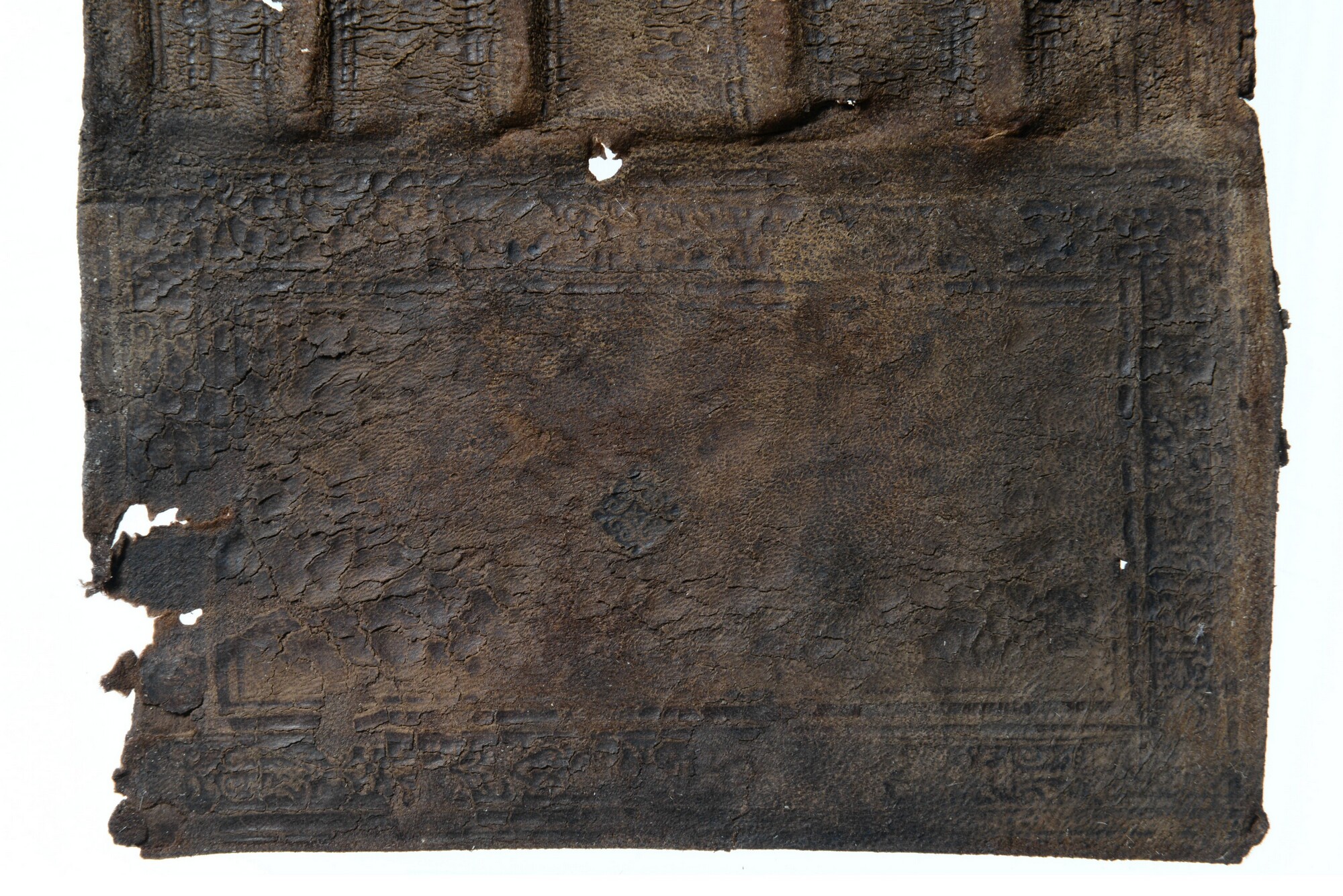 Leren bekleding van een boekband, met een versiering in blinddruk: een kader van een gedecoreerde, symmetrische rol, met een klein stempel als centraalstuk op het voor- en achterplat.