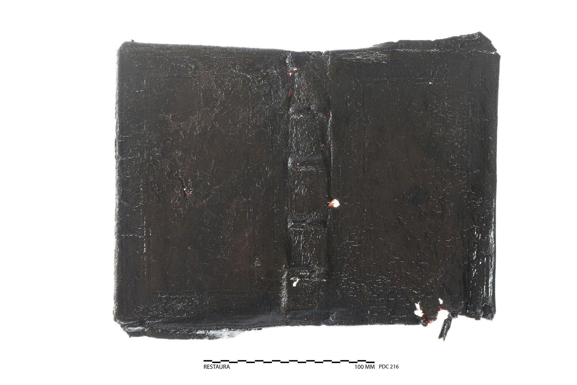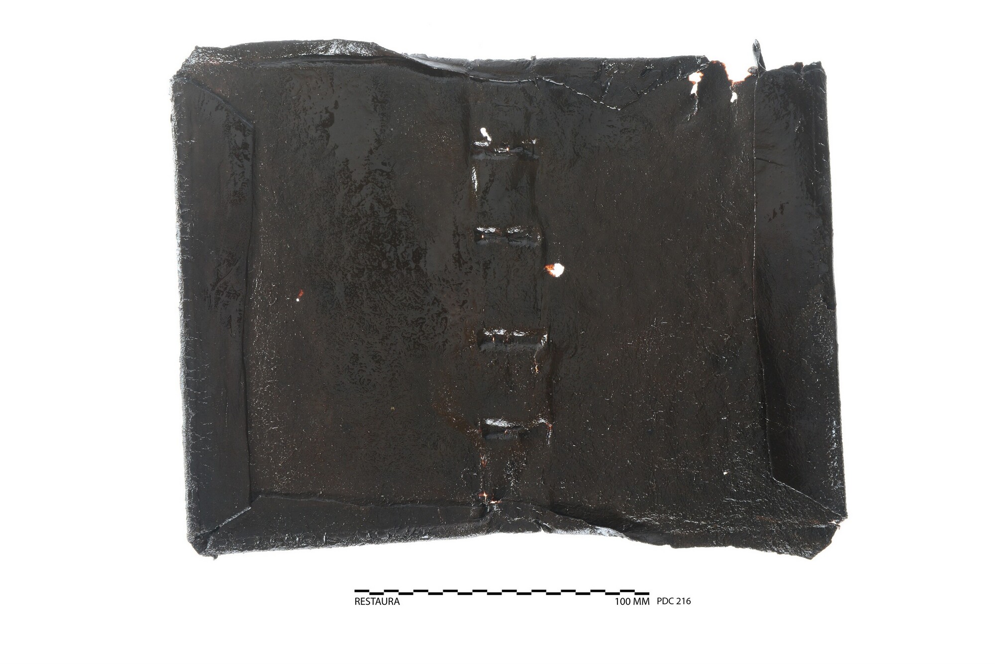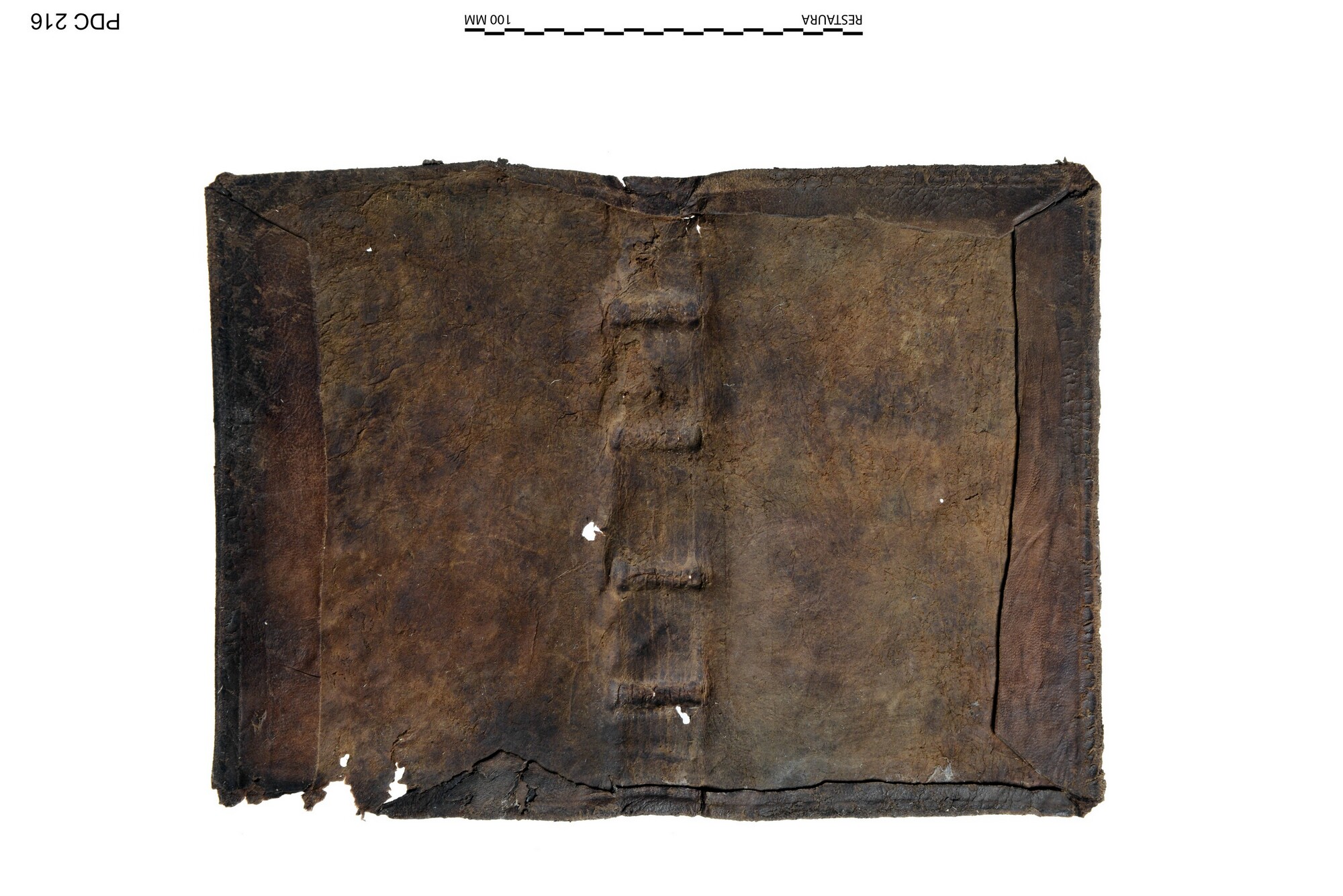 Leren bekleding van een boekband, met een versiering in blinddruk: een kader van een gedecoreerde, symmetrische rol, met een klein stempel als centraalstuk op het voor- en achterplat.