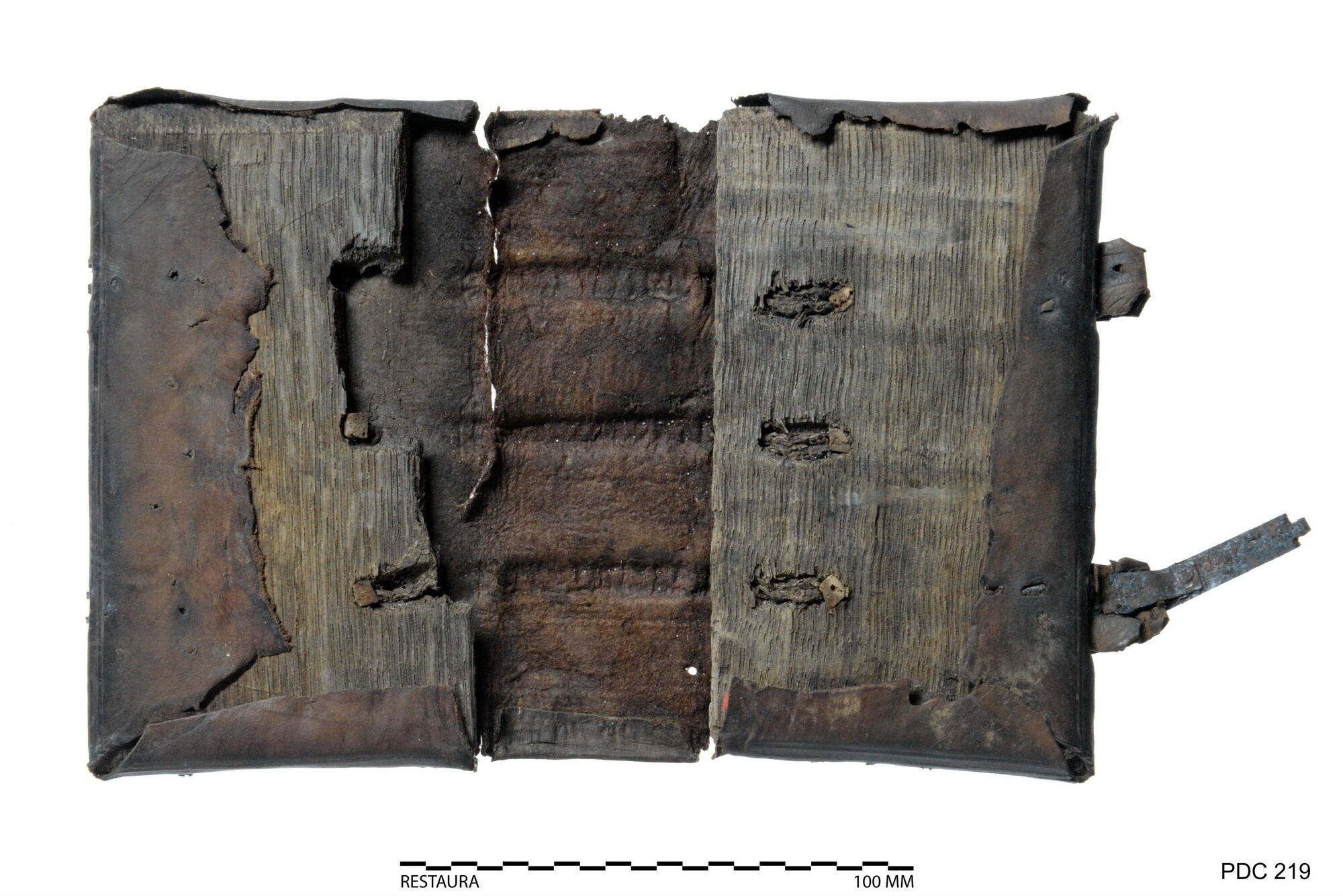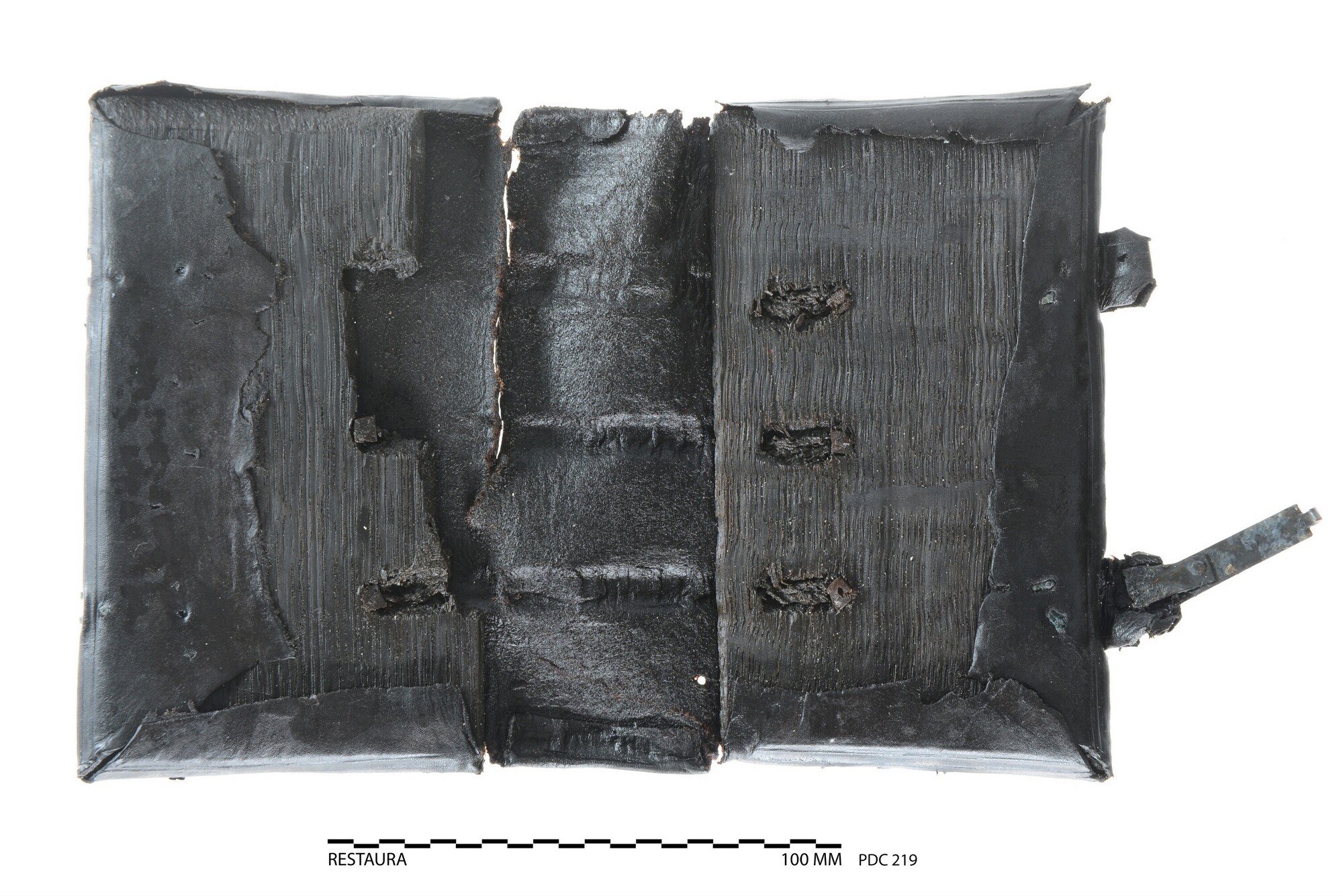 Sporen van beslag: Een complete set van een klampriem-kantsluiting. De klamp is enkel gevouwen, 1 mist er, van beiden zijn de slotlippen en ...