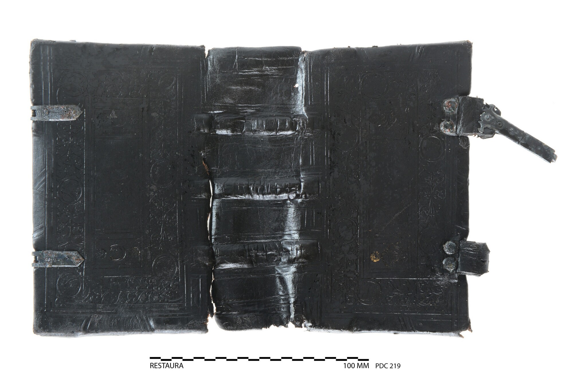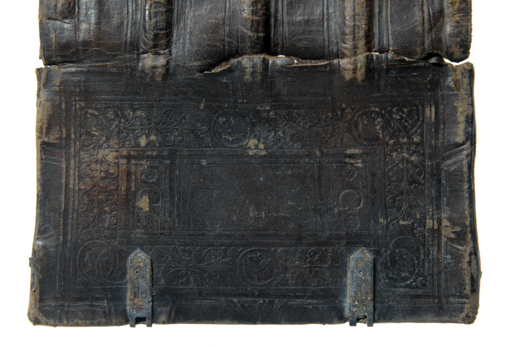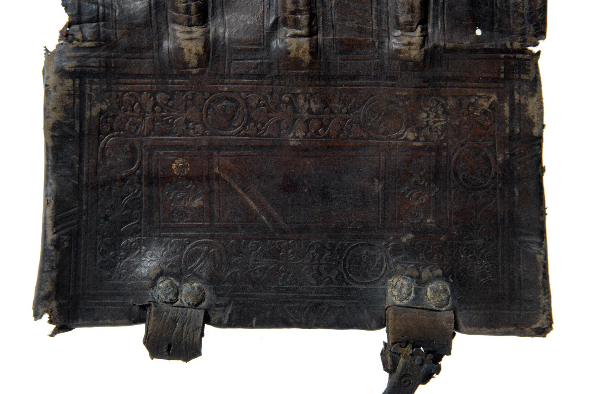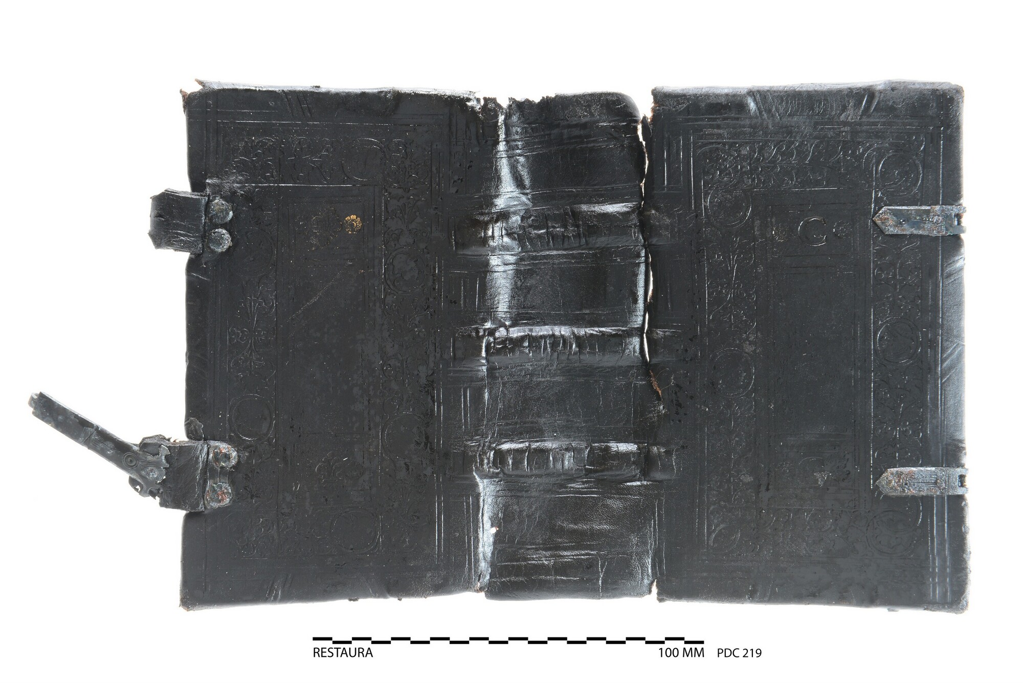 Leren bekleding van een boekband met blinddruk en vergulde bestempeling versierd. 'C G' op het voorplat in verguld. Het meeste van de houten platten is bewaard gebleven, evenals de klampriem-kantsluitingen van een koperlegering.