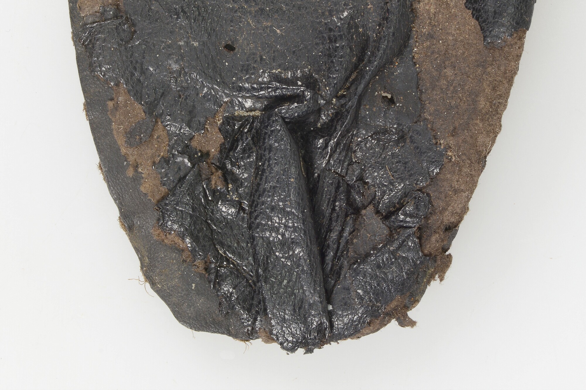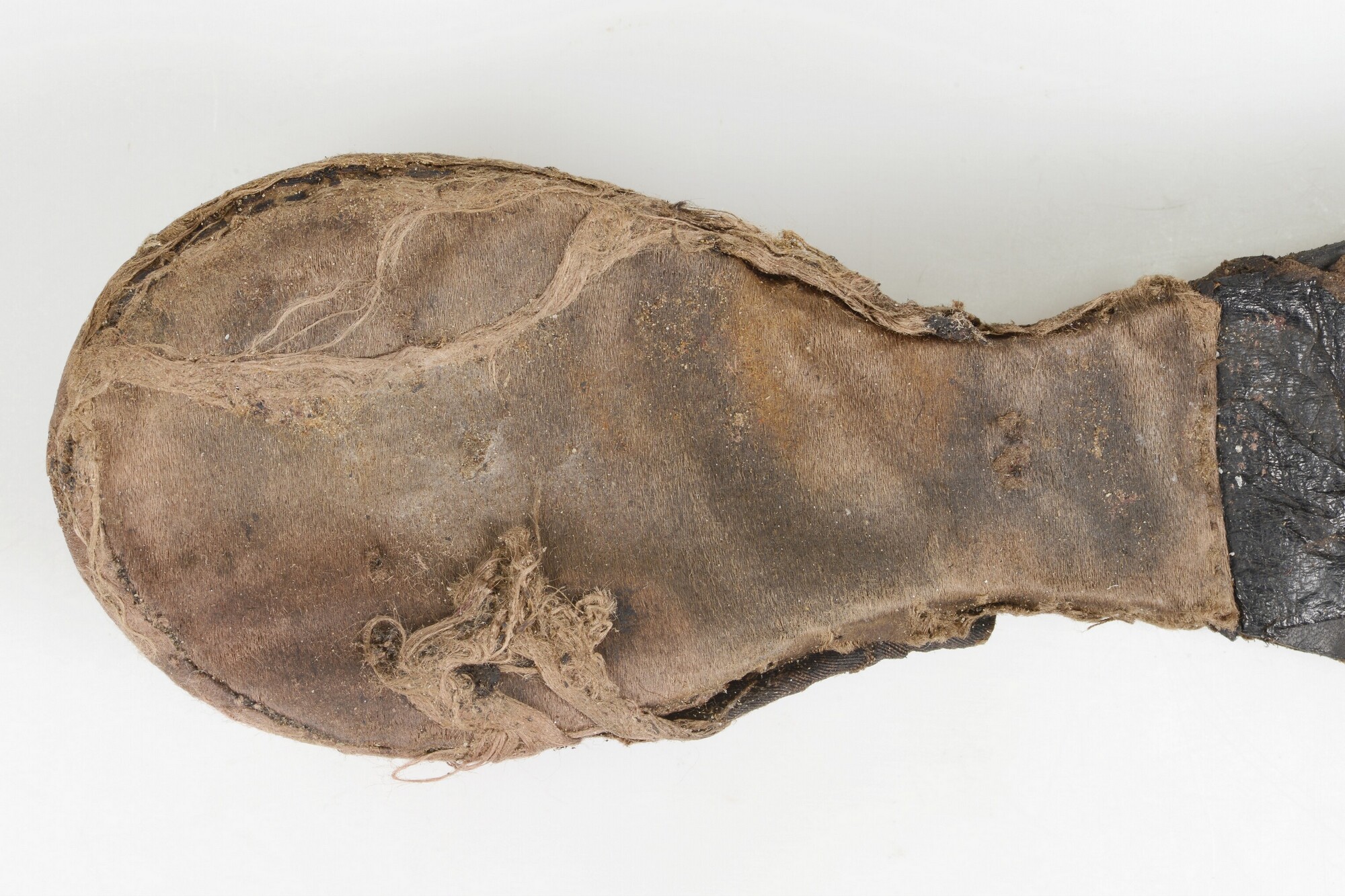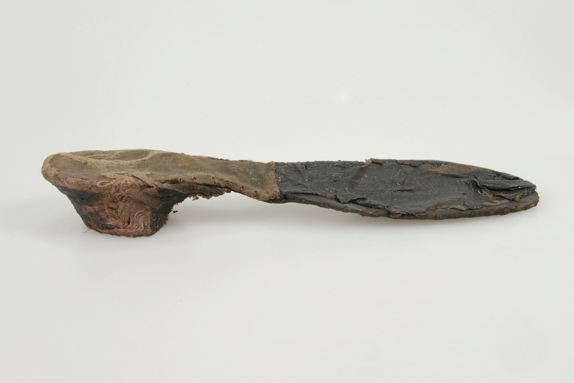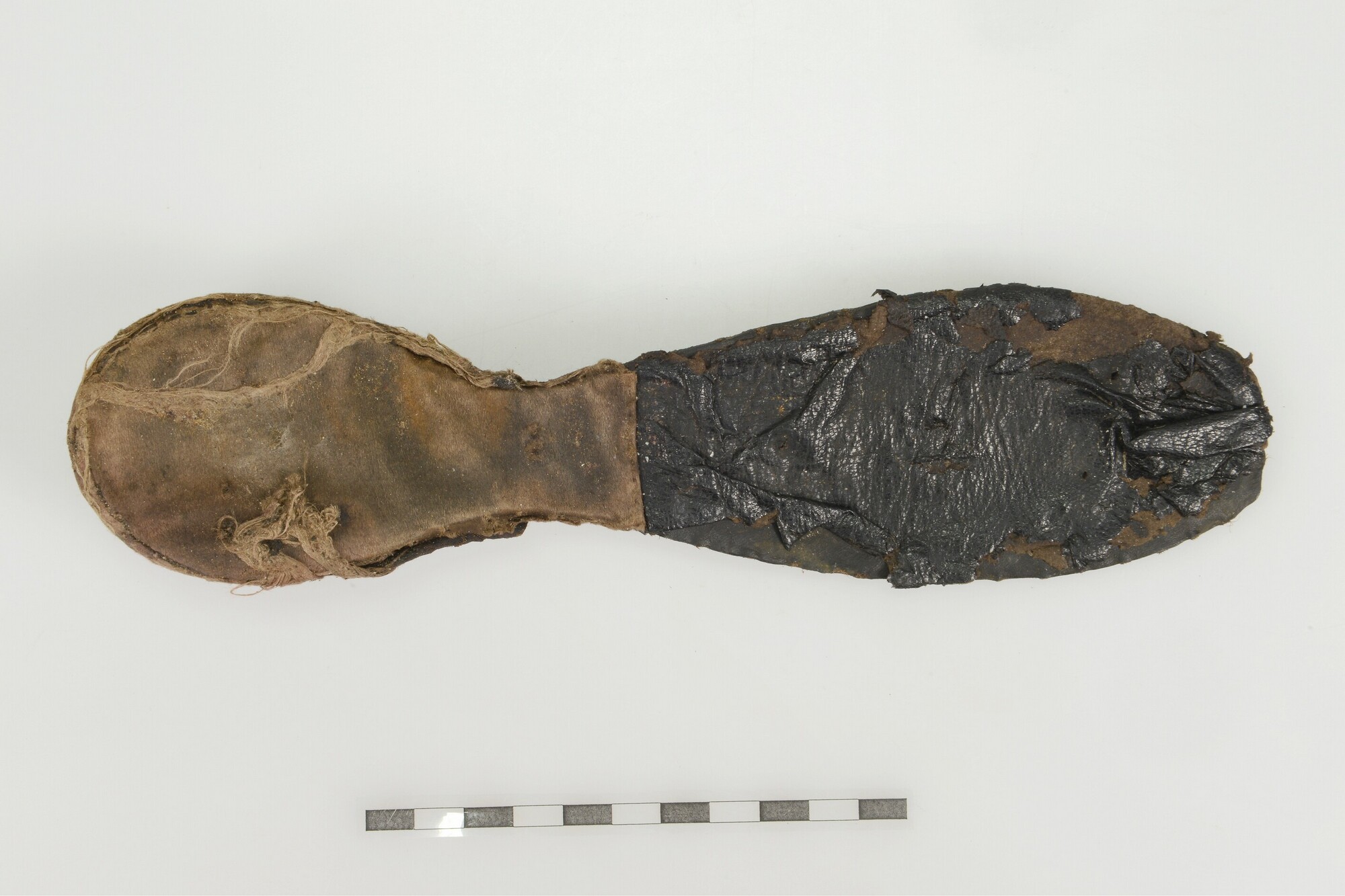 Binnenzool van leer met houten hak en resten zijden bekleding