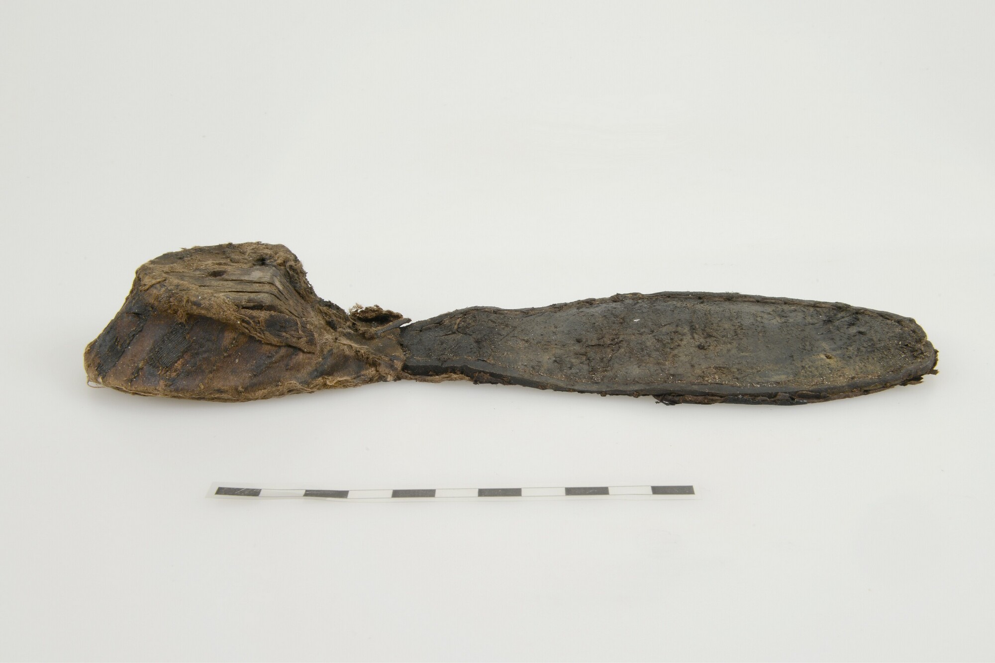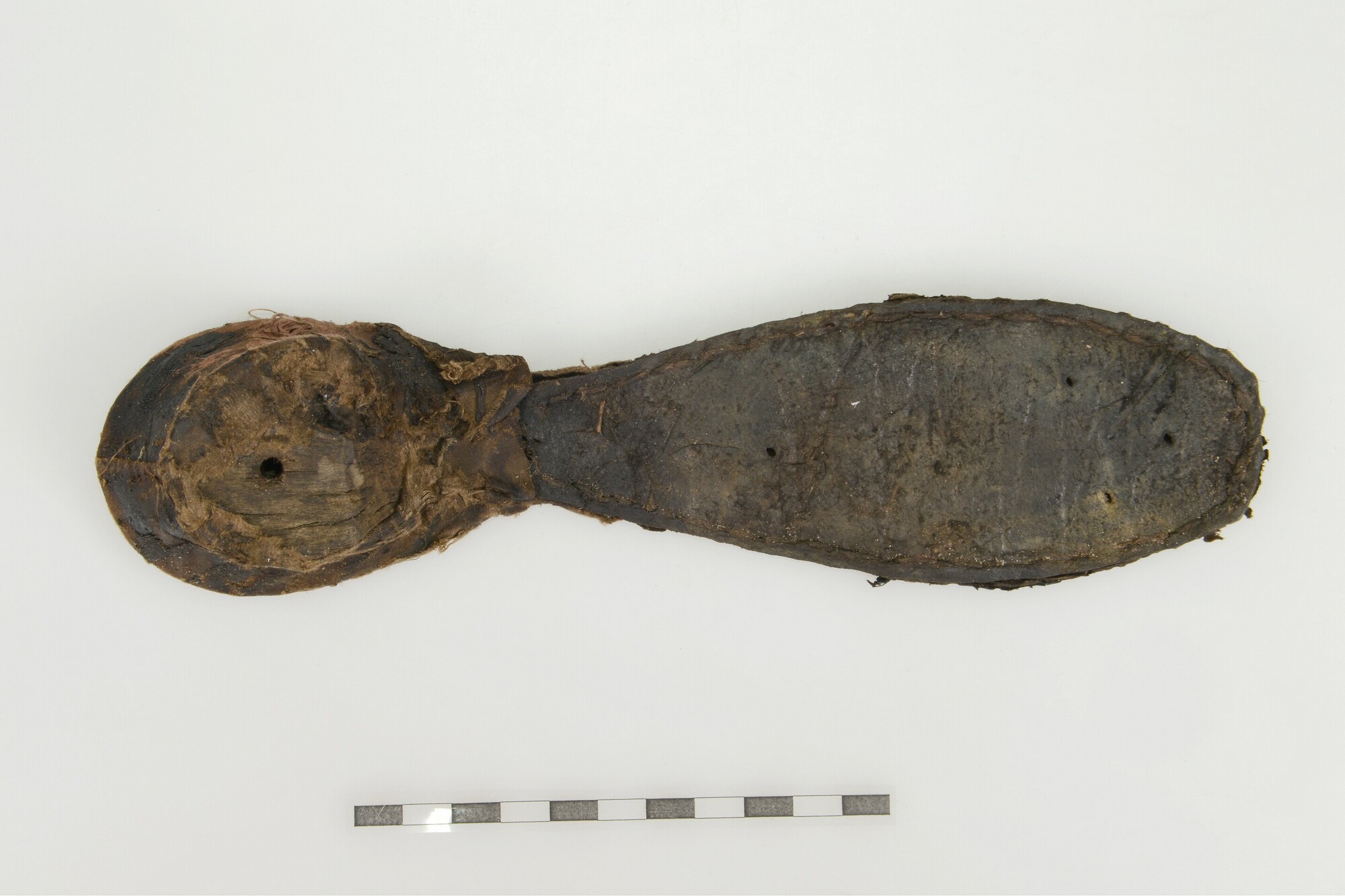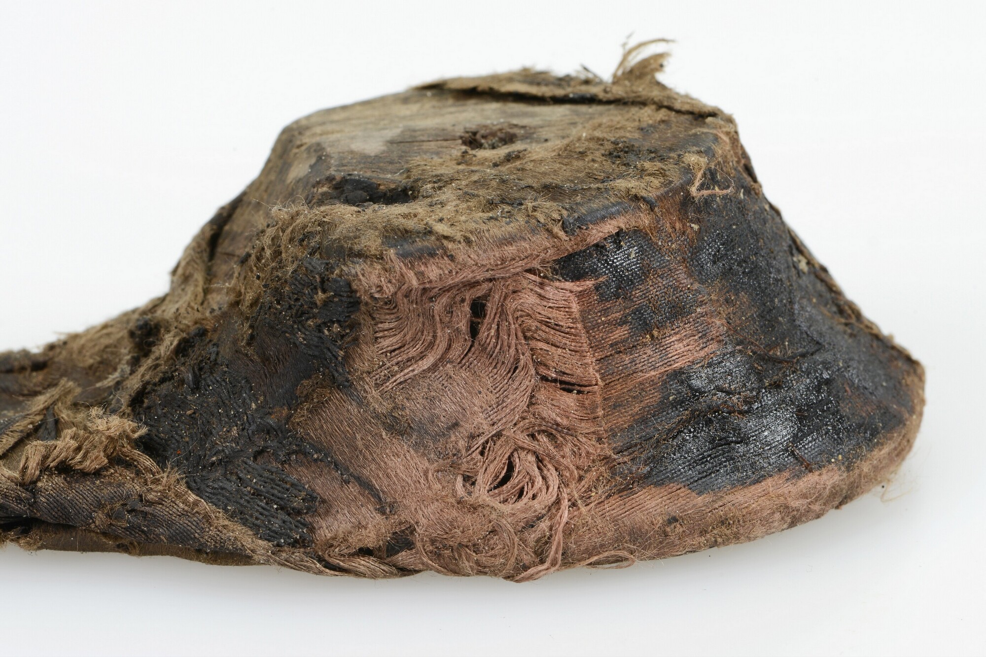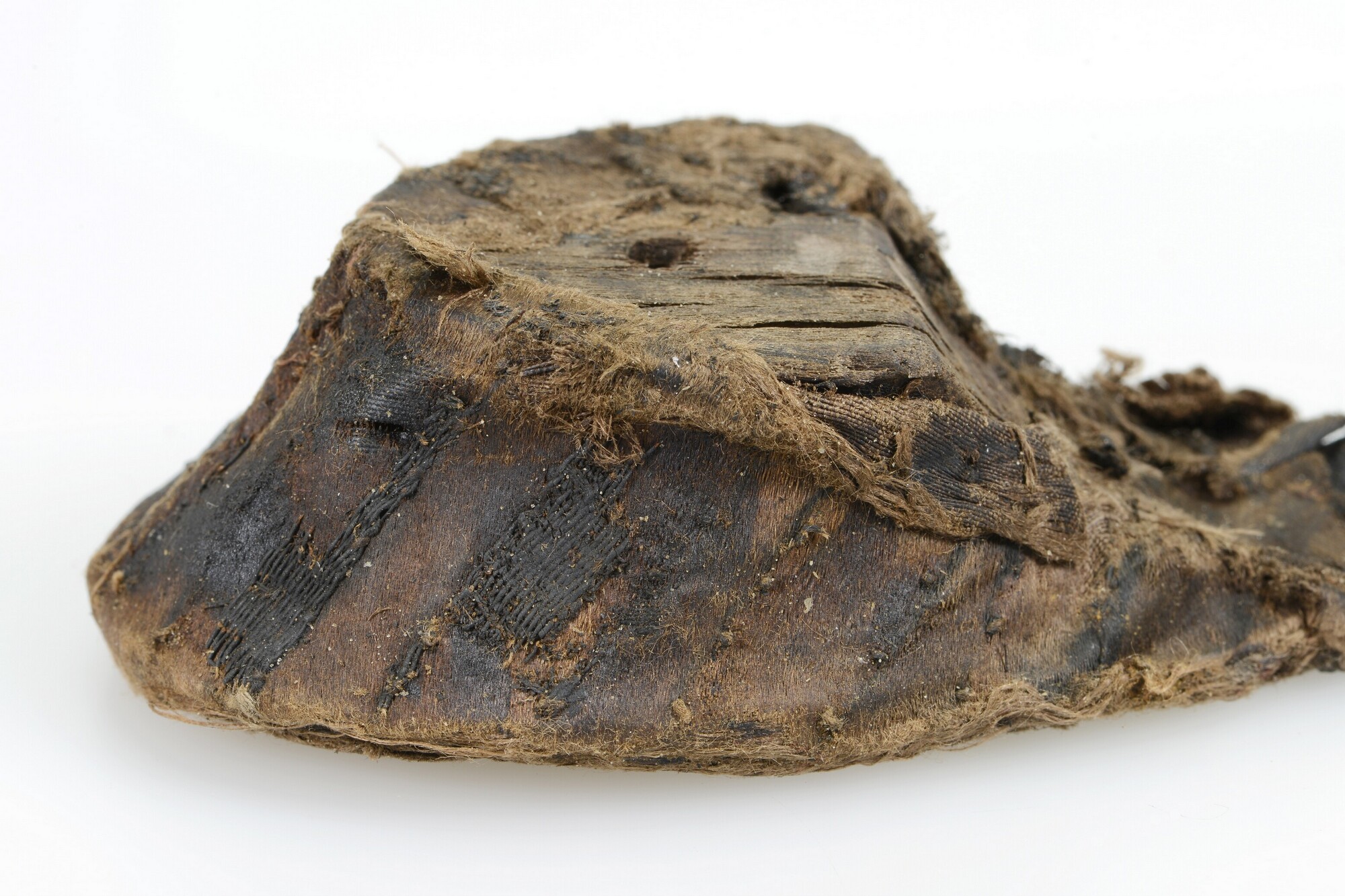 Binnenzool van leer met houten hak en resten zijden bekleding