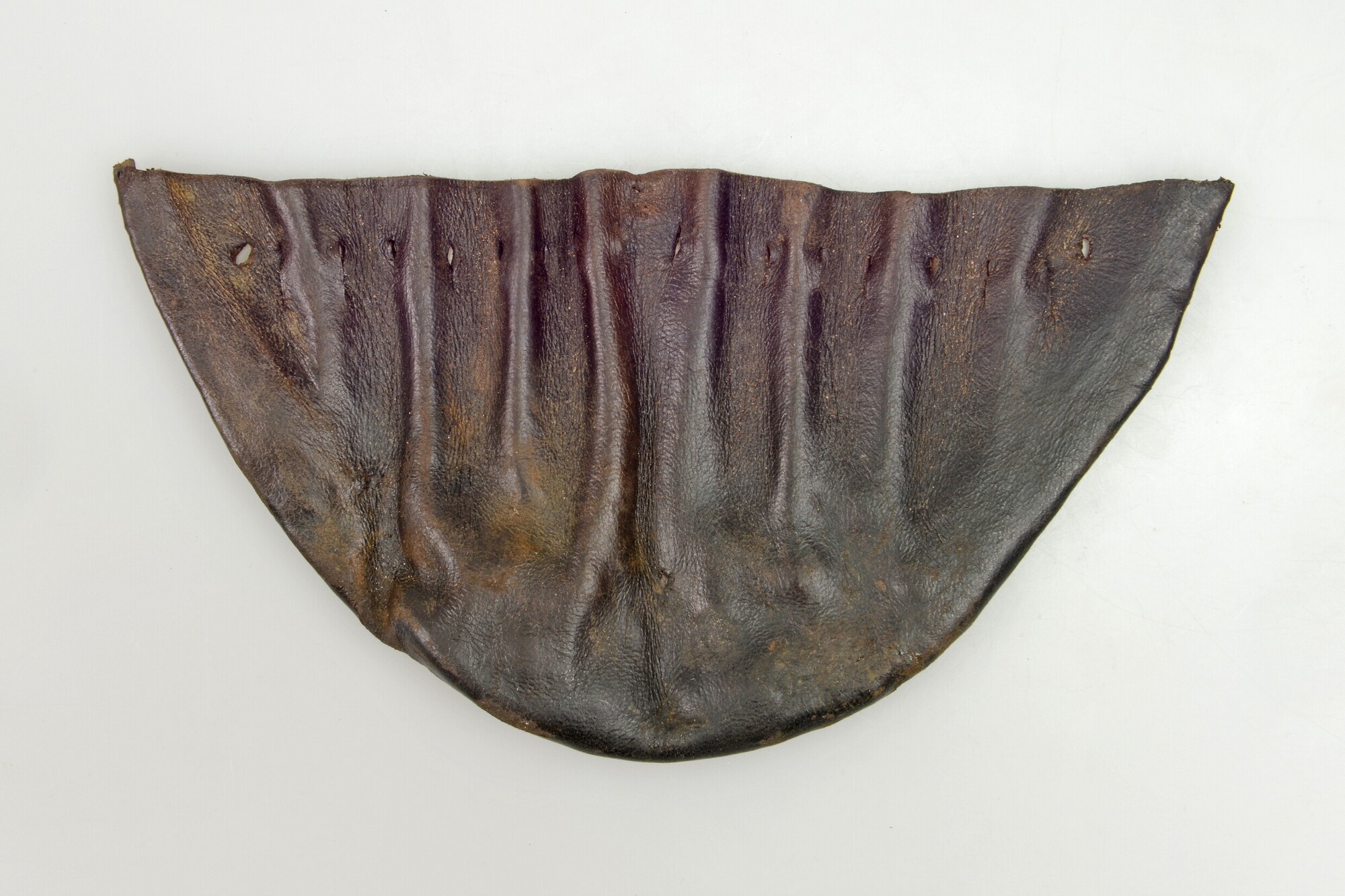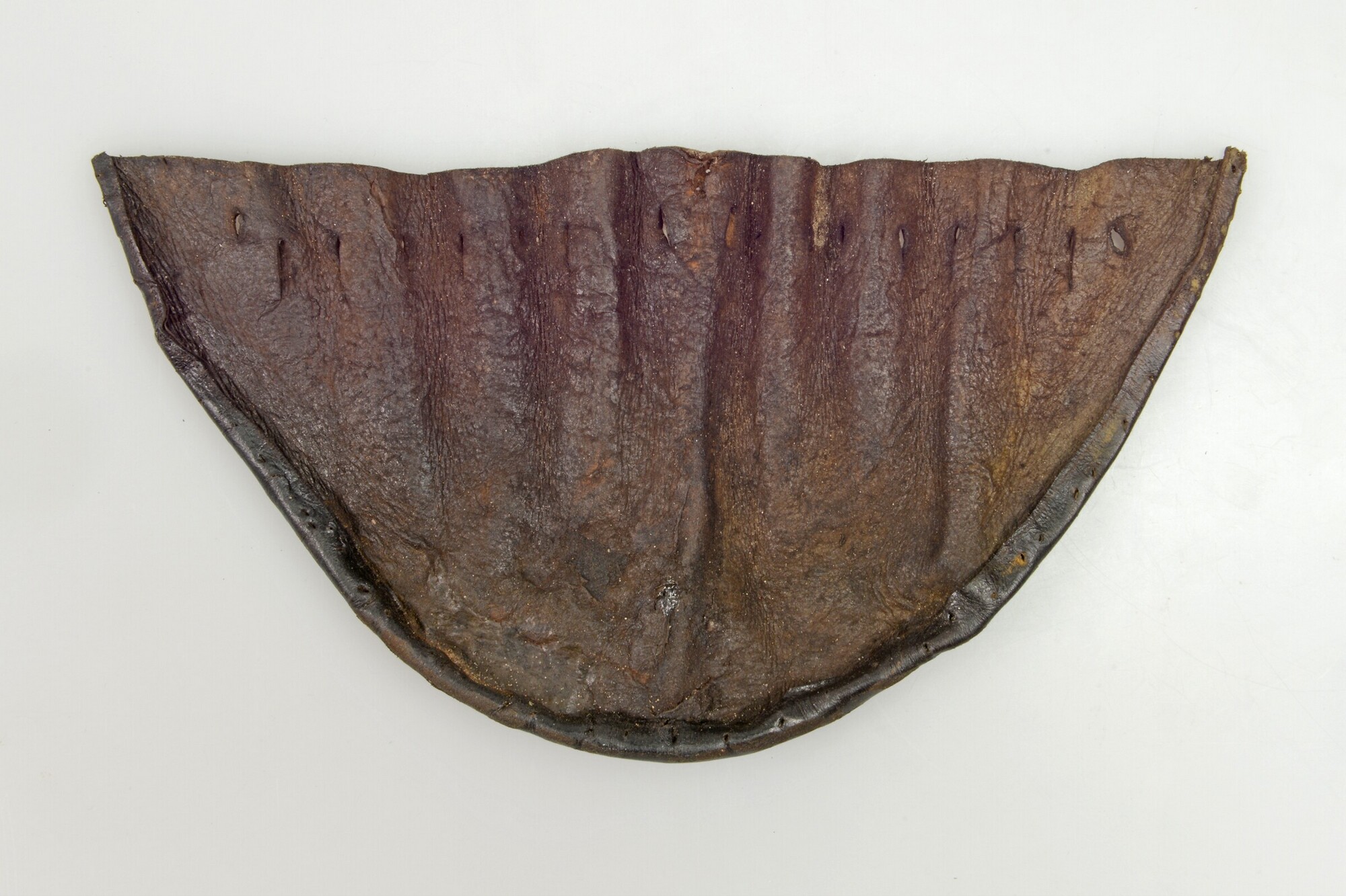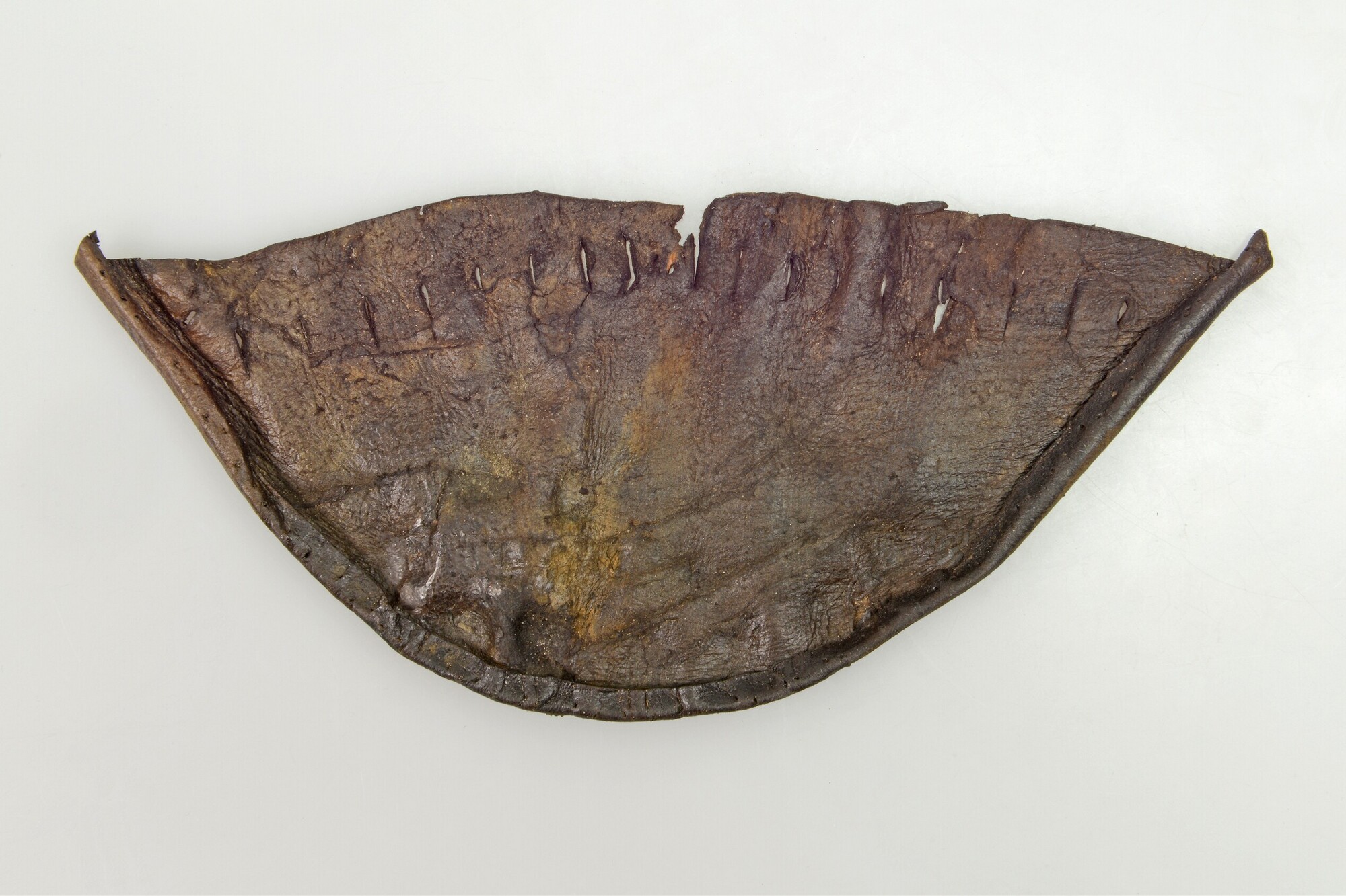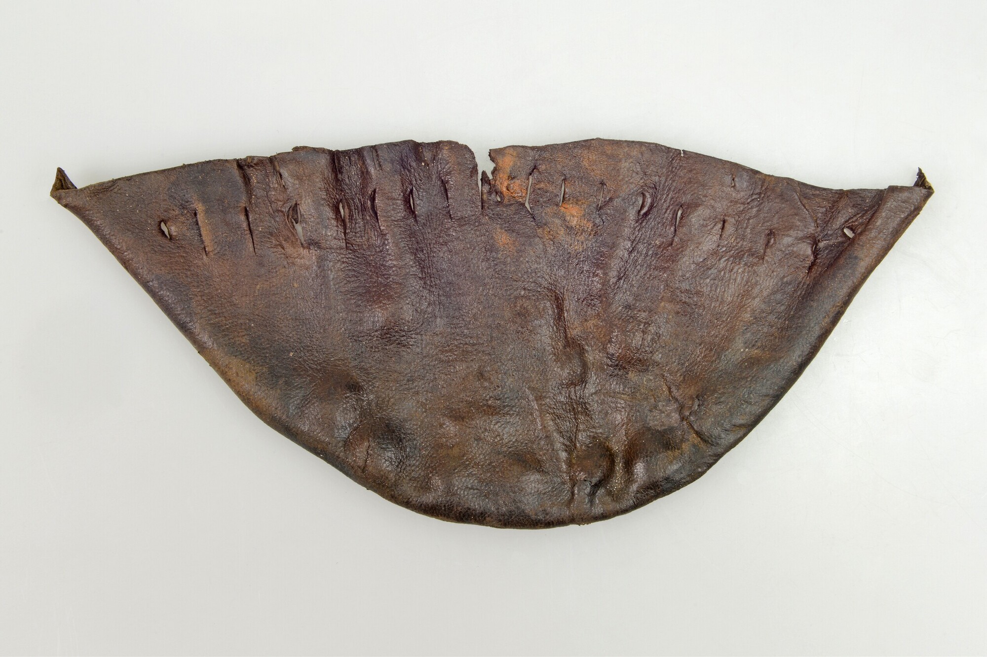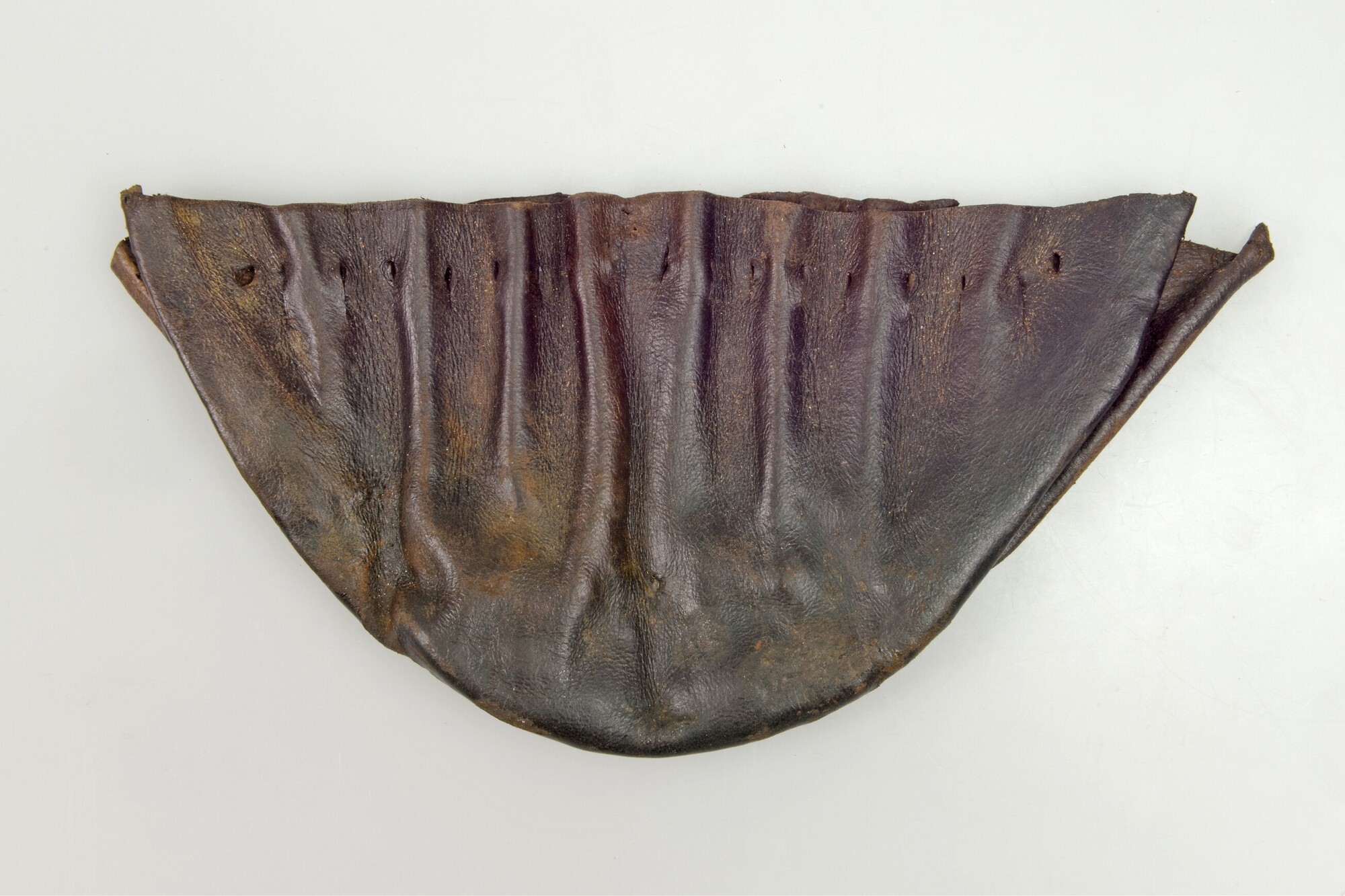 Kogelzak, gemaakt uit twee delen; rijggaten; langs de randen aan onderzijde naaigaten
