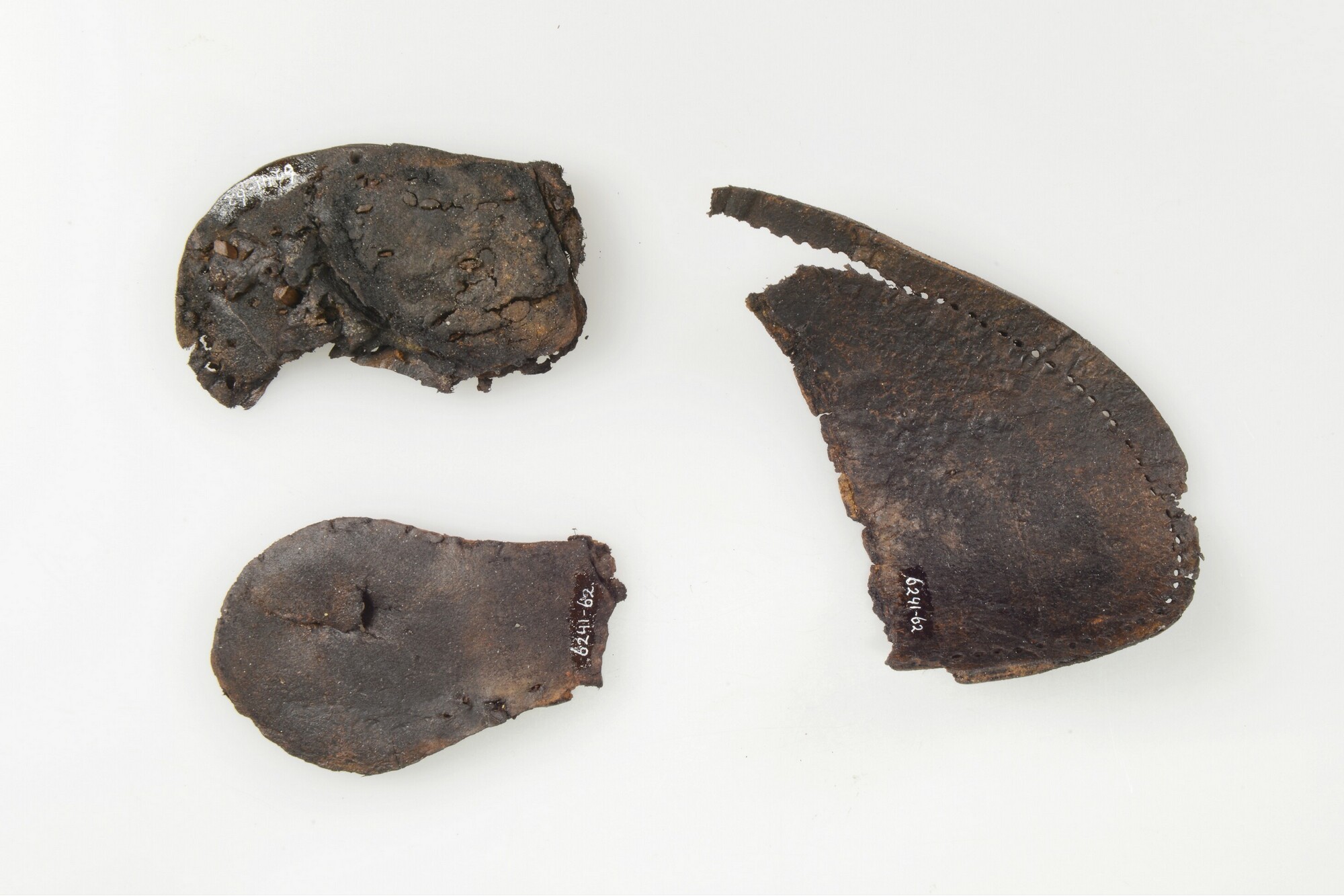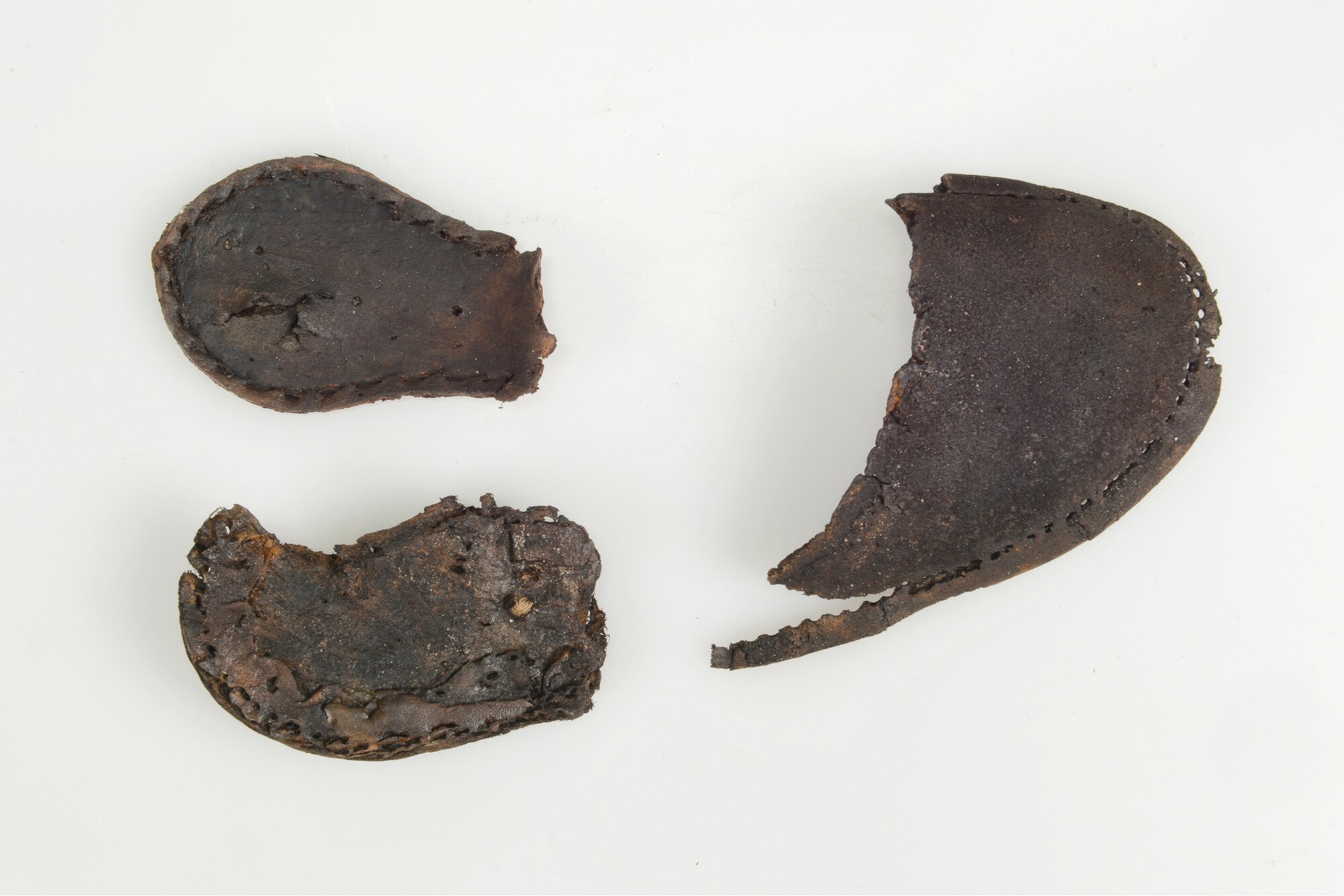 Schoenzool; fragment, drie stuks; waaronder hak met houten pennetjes; tussenrand