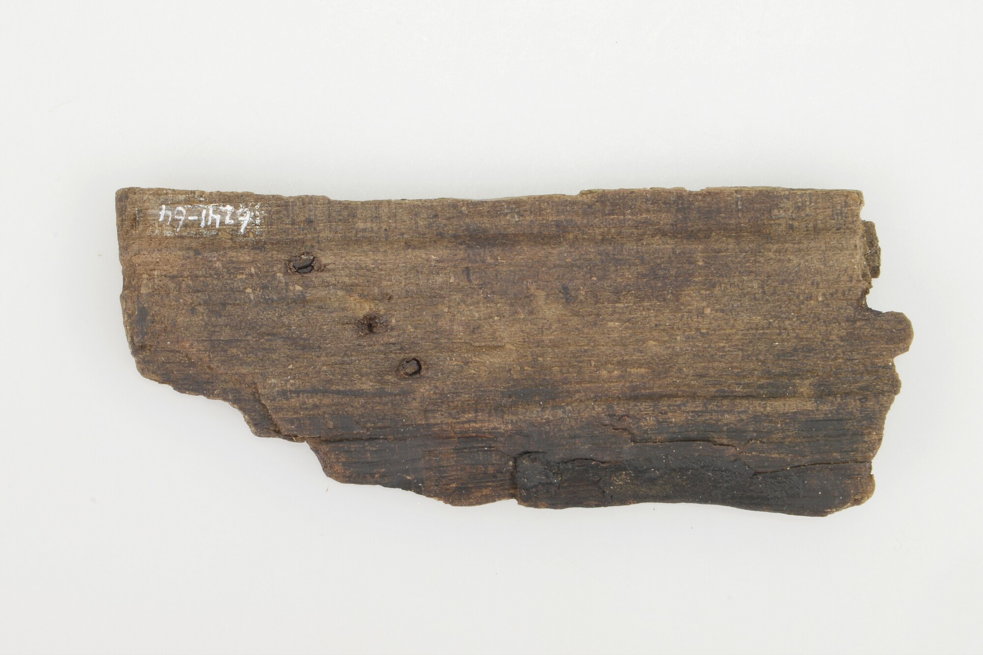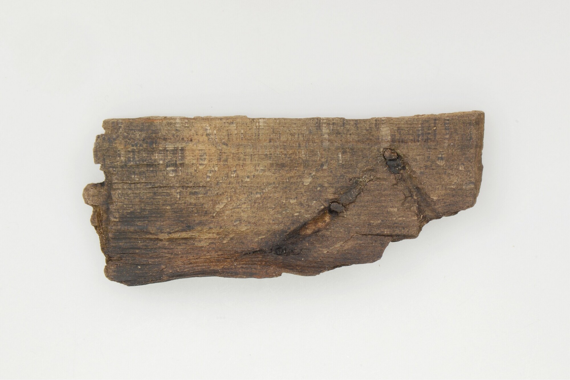 Fragment houten plat van boekband; met touwrestant en 2/3 spijkertjes van hout