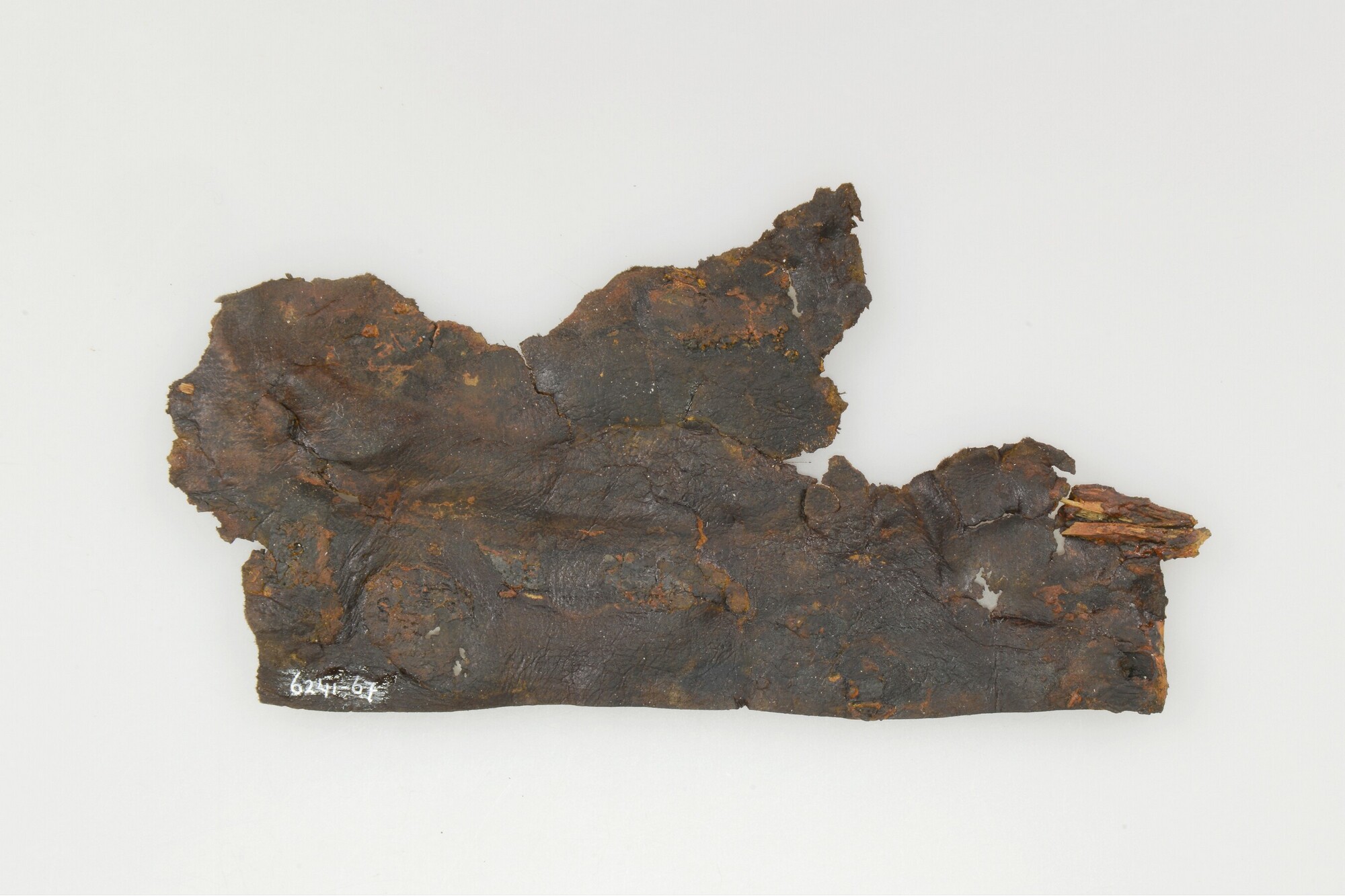 Fragment, leer, fragmentjes hout, mogelijk van boekband