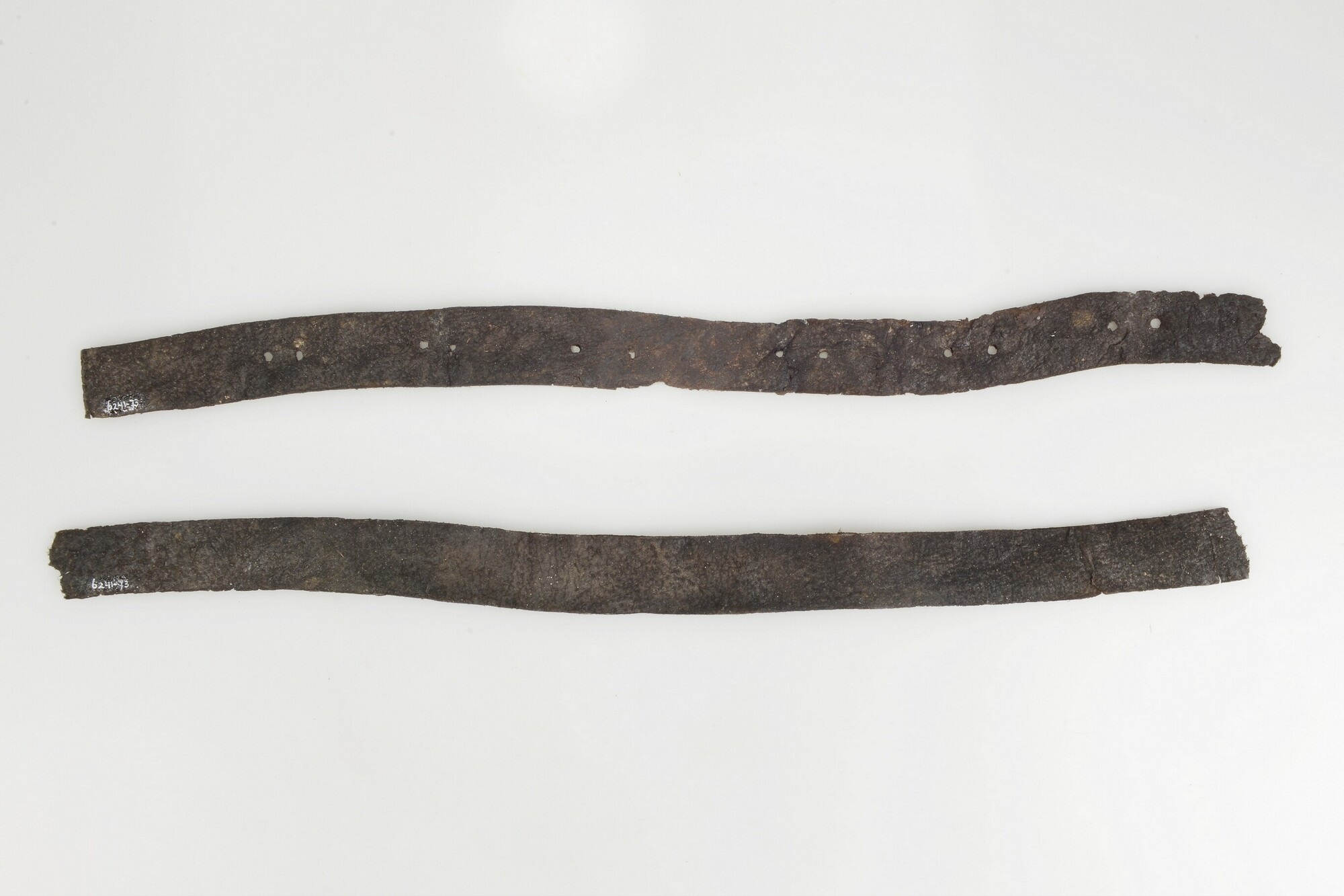 Bandelier; twee fragmenten, mogelijk aan elkaar passend; in het midden steeds twee bevestigingsgaten