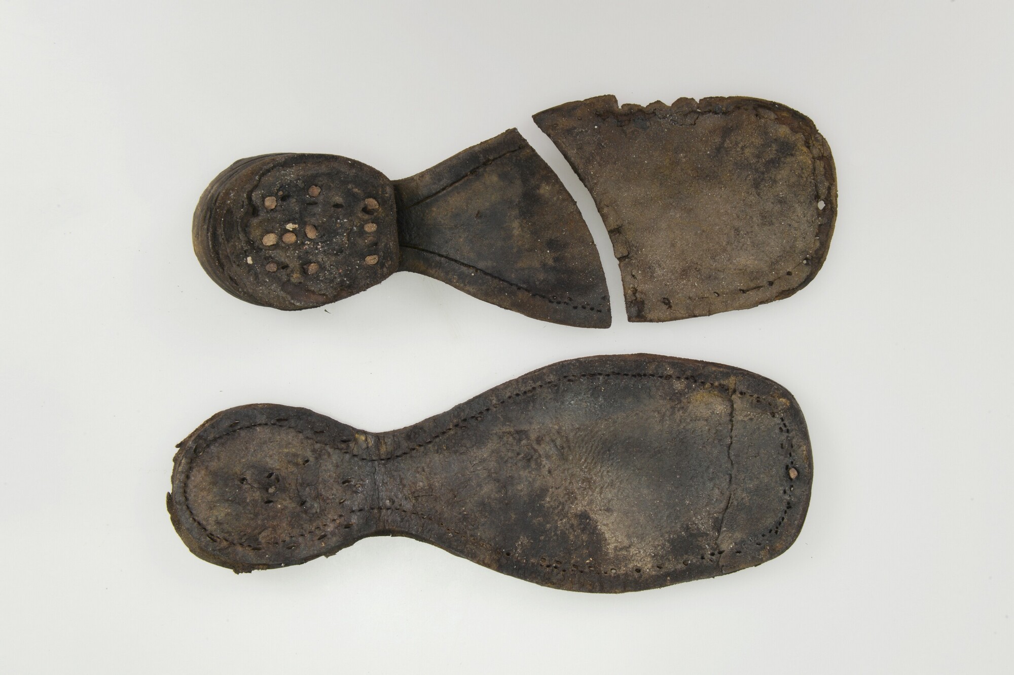 Schoenzool: bij elkaar behorende binnen- en buitenzool; houten pennetjes; de buitenzool is gerepareerd en bestaat uit twee delen; de hak is opgebouwd uit lagen leer op elkaar