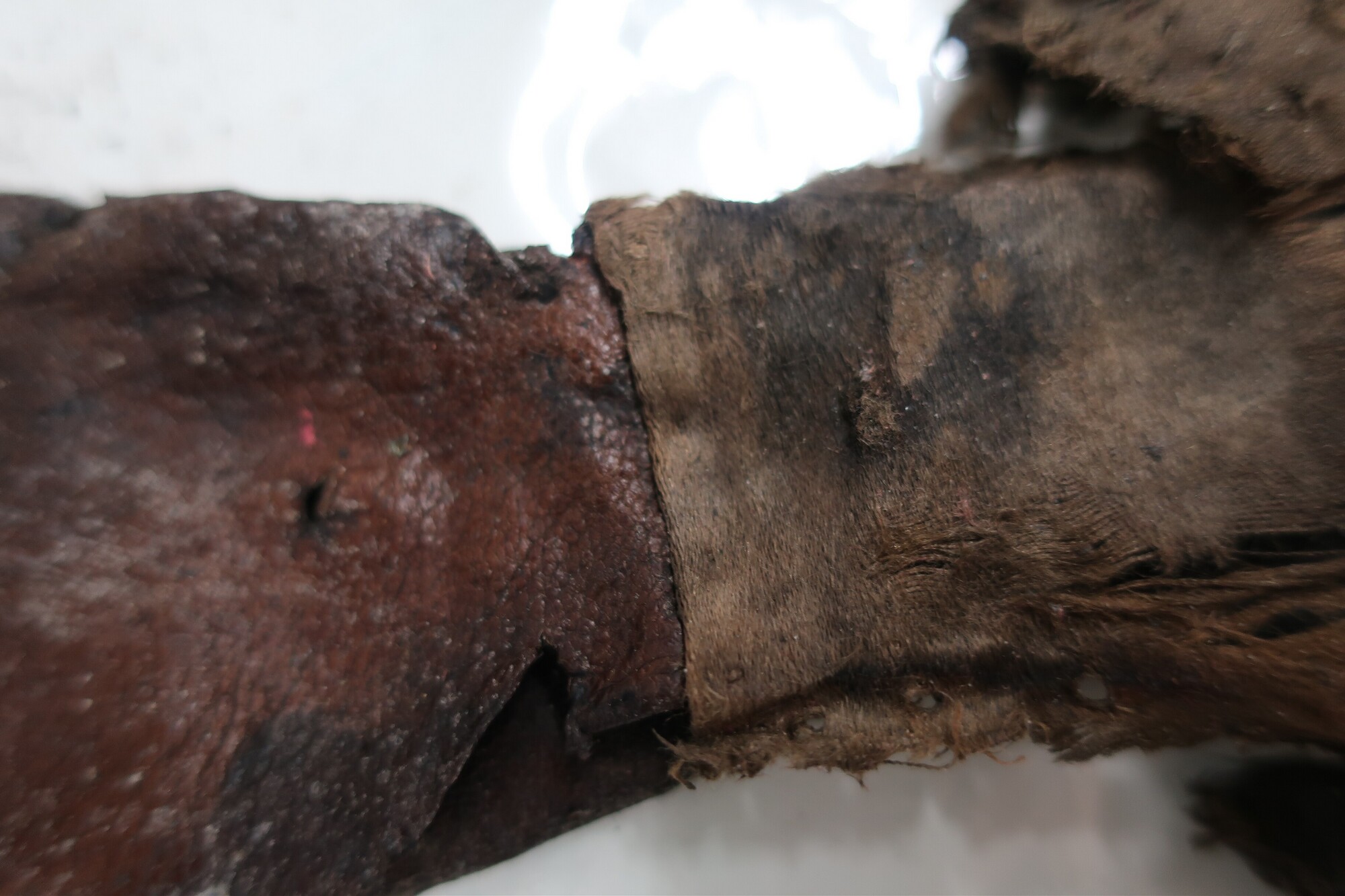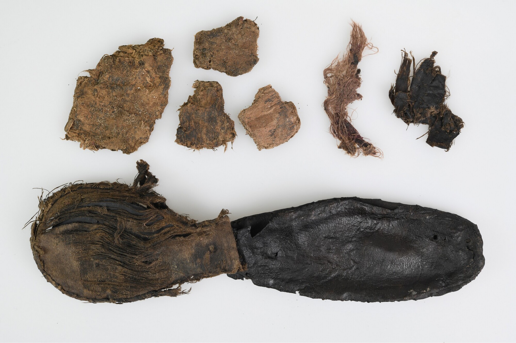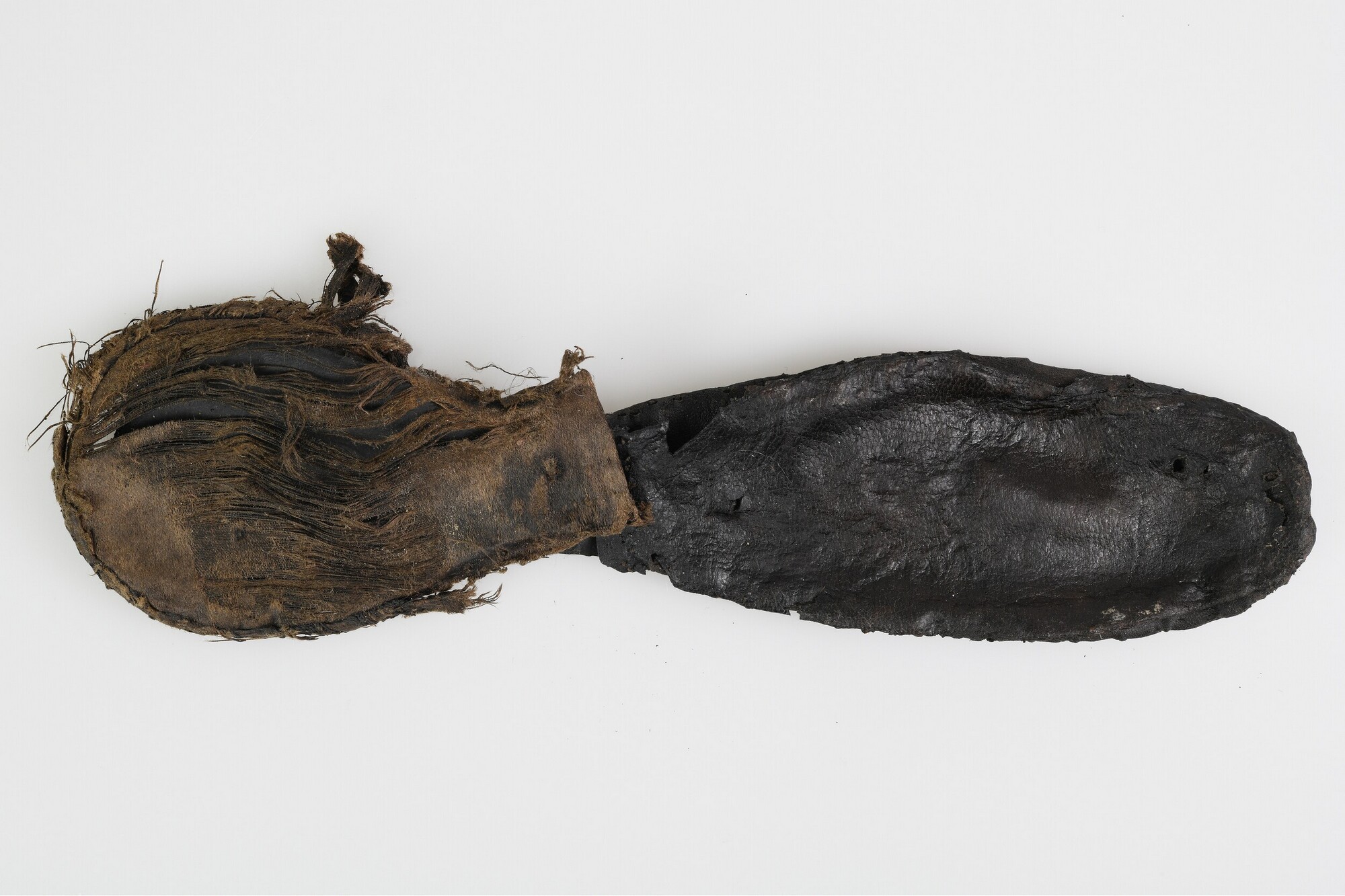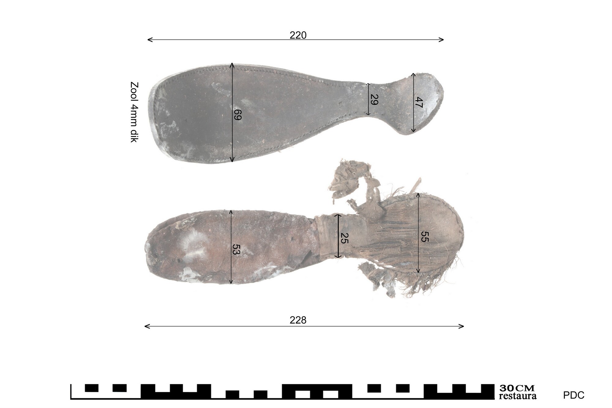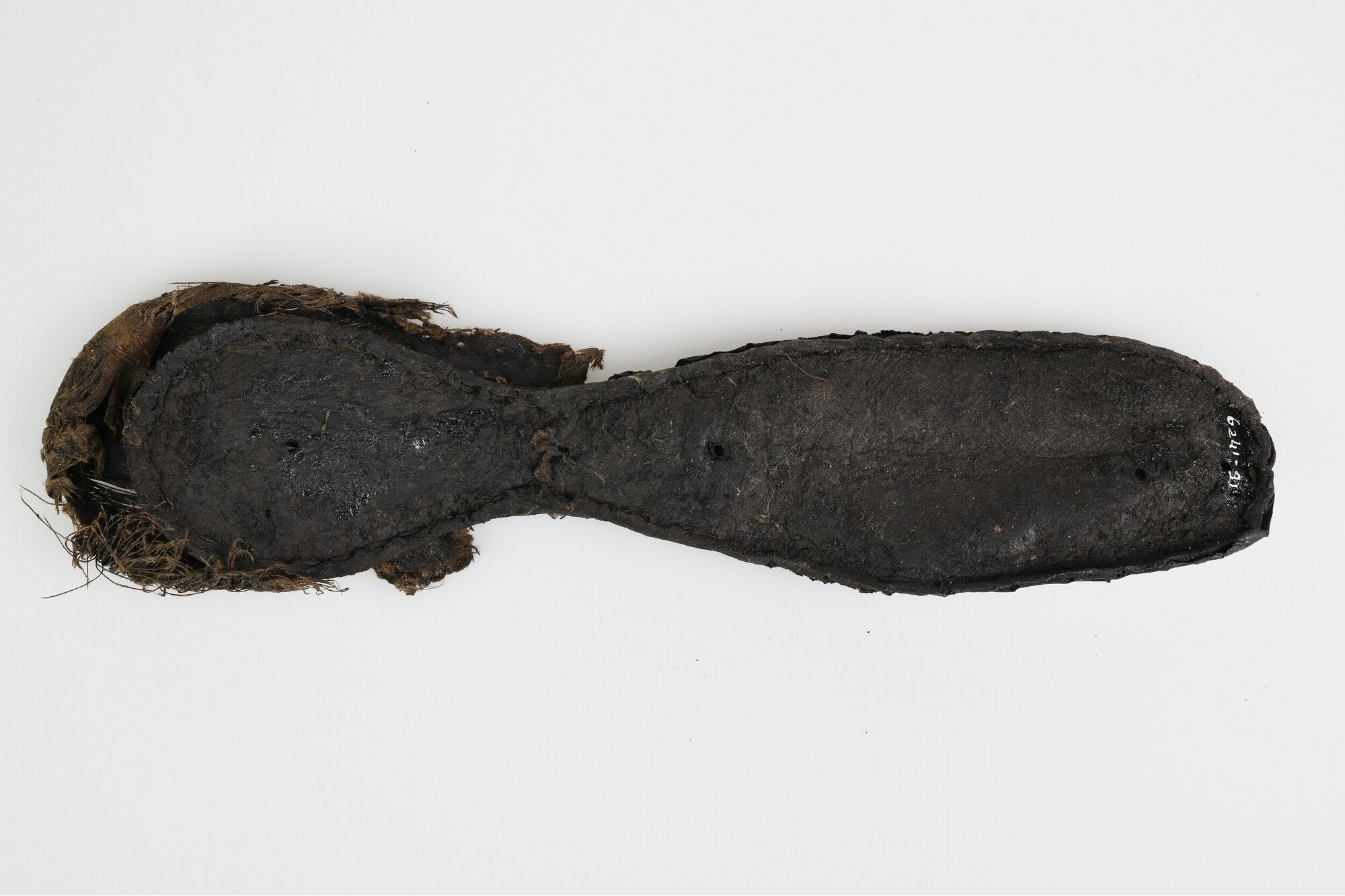 Schoenzool van leer met resten zijden bekleding; smalle dames muil; oorspronkelijk voorzien van een houten hak, waarvan losse resten nog bewaard zijn