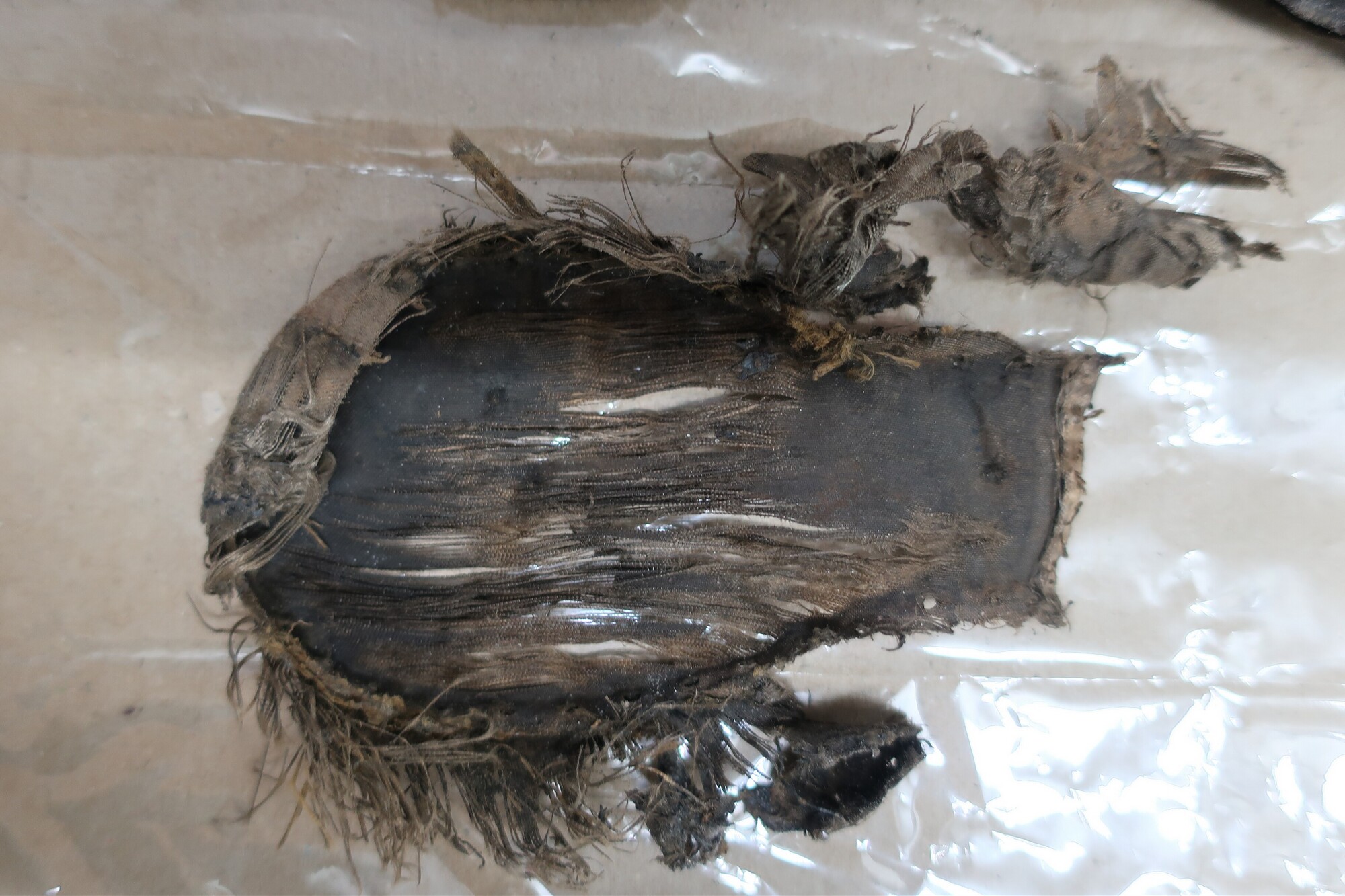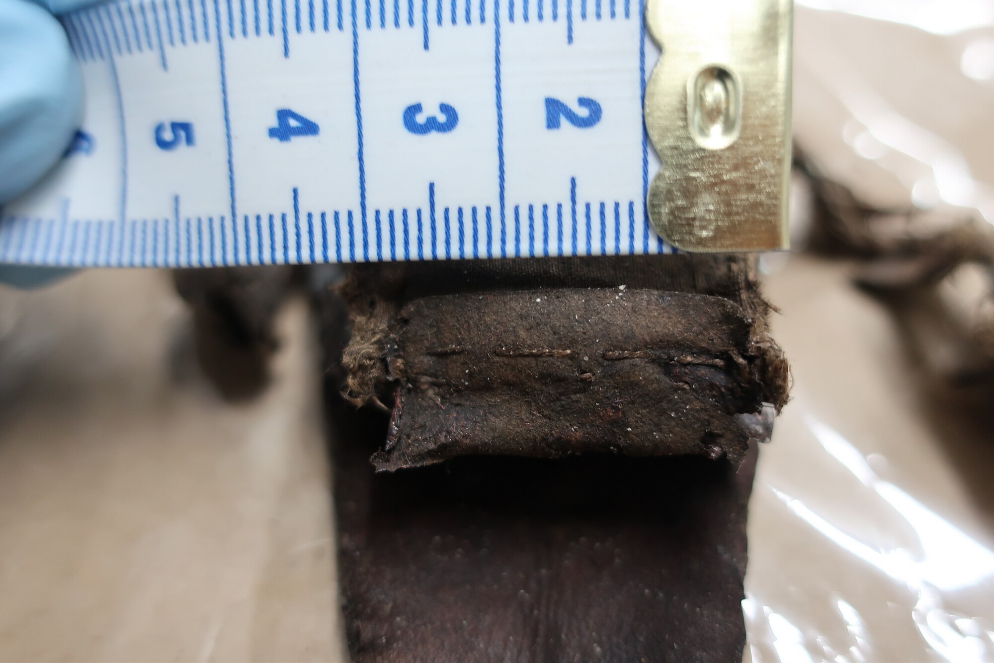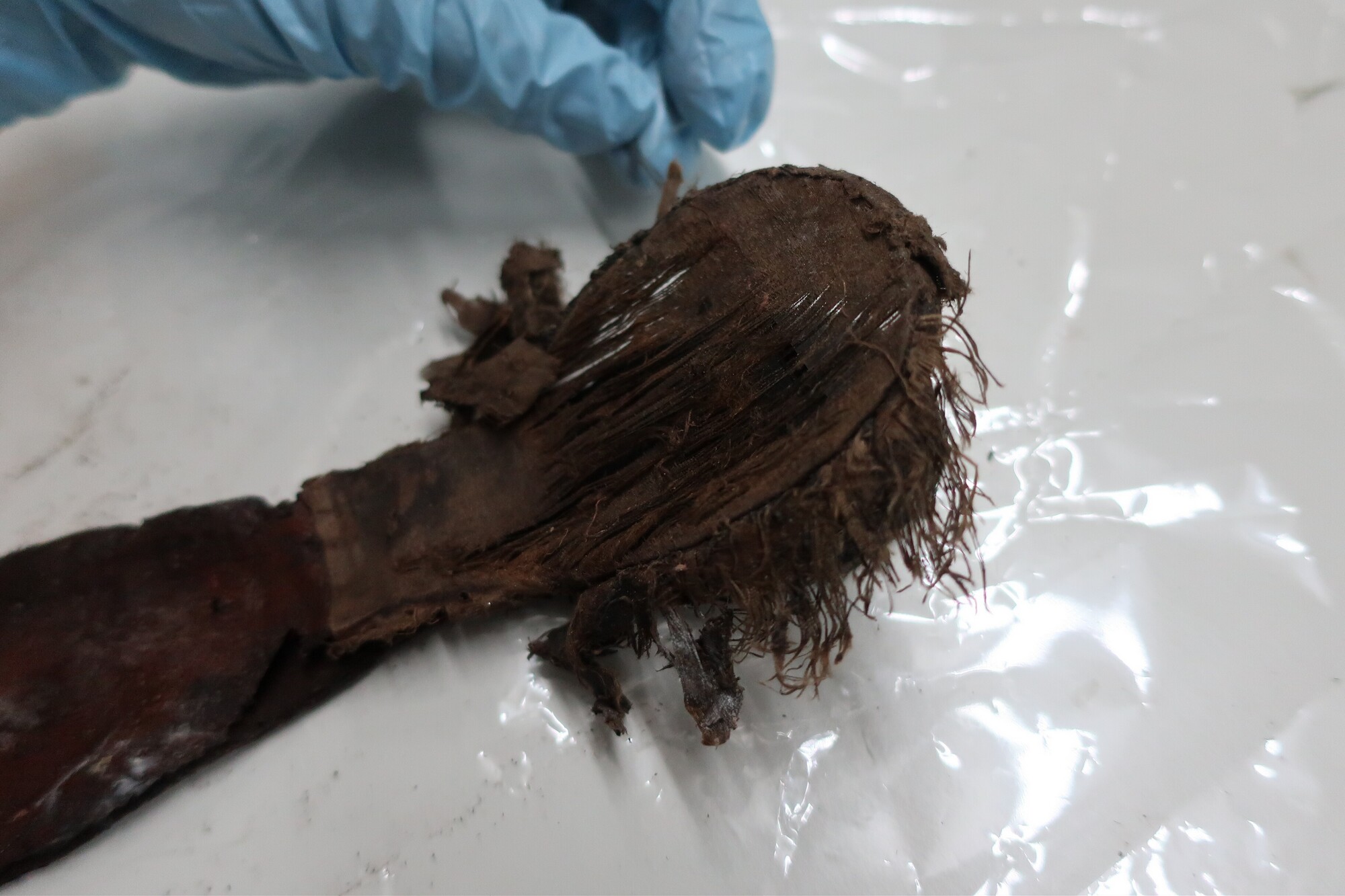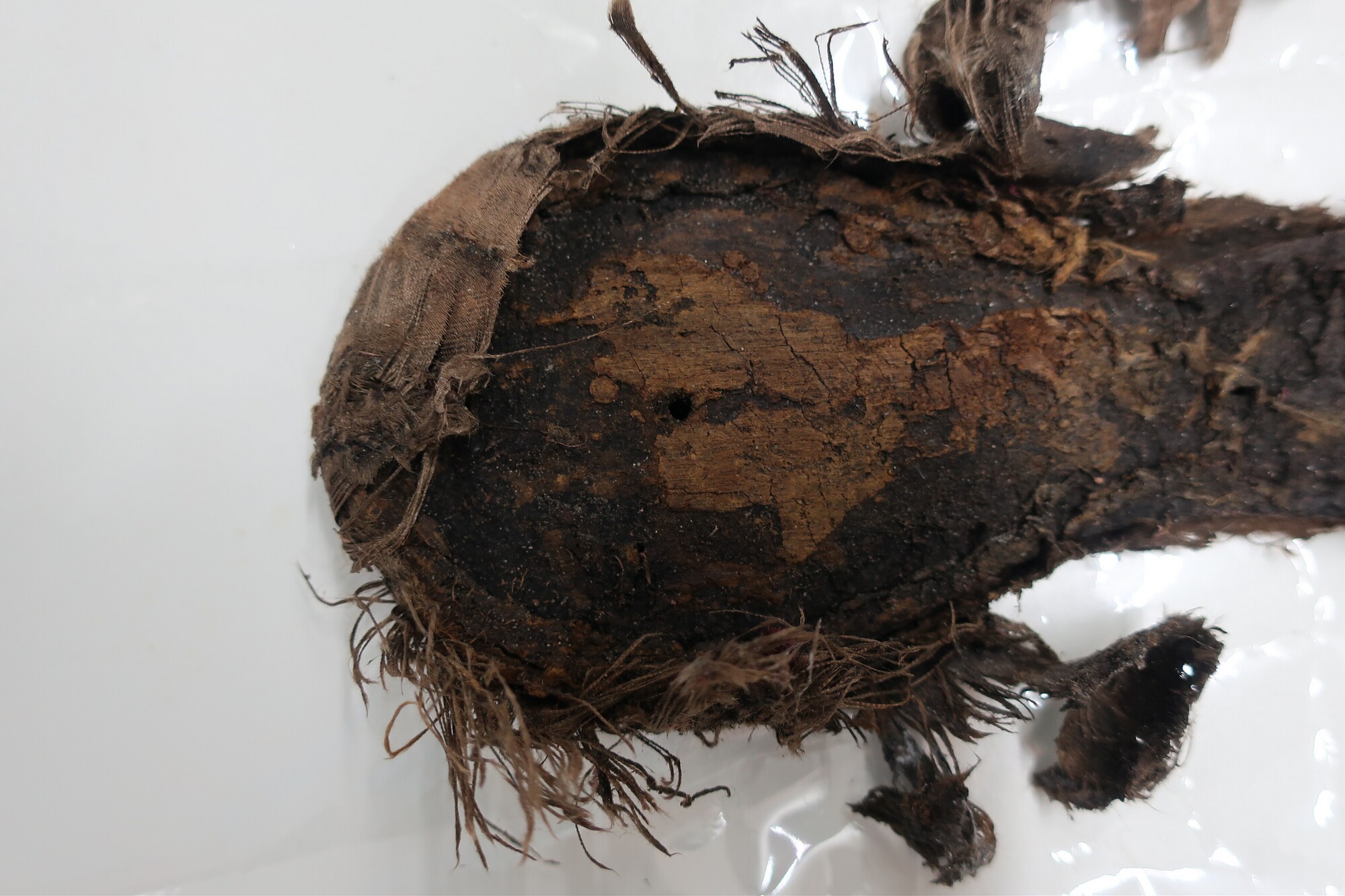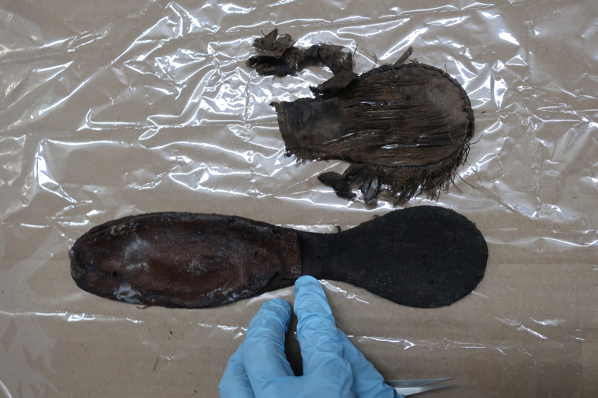 Schoenzool van leer met resten zijden bekleding; smalle dames muil; oorspronkelijk voorzien van een houten hak, waarvan losse resten nog bewaard zijn